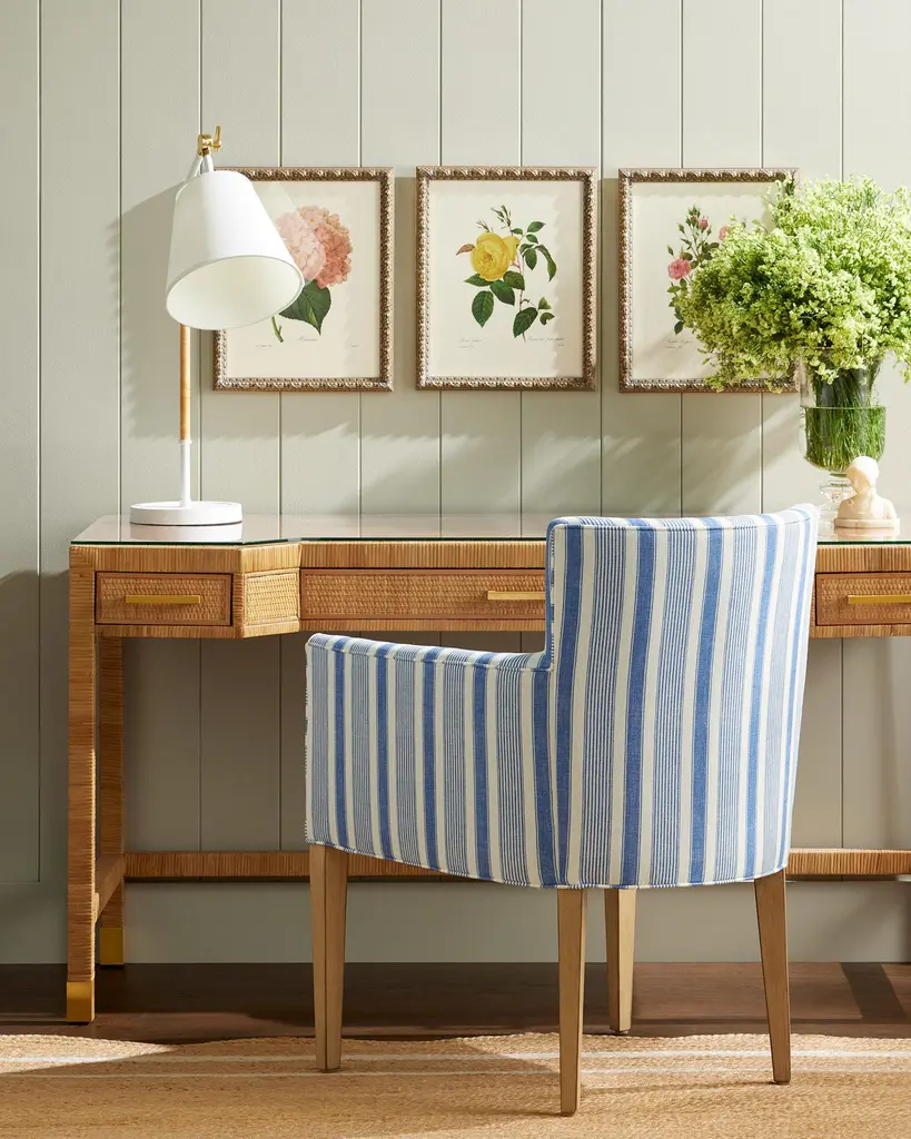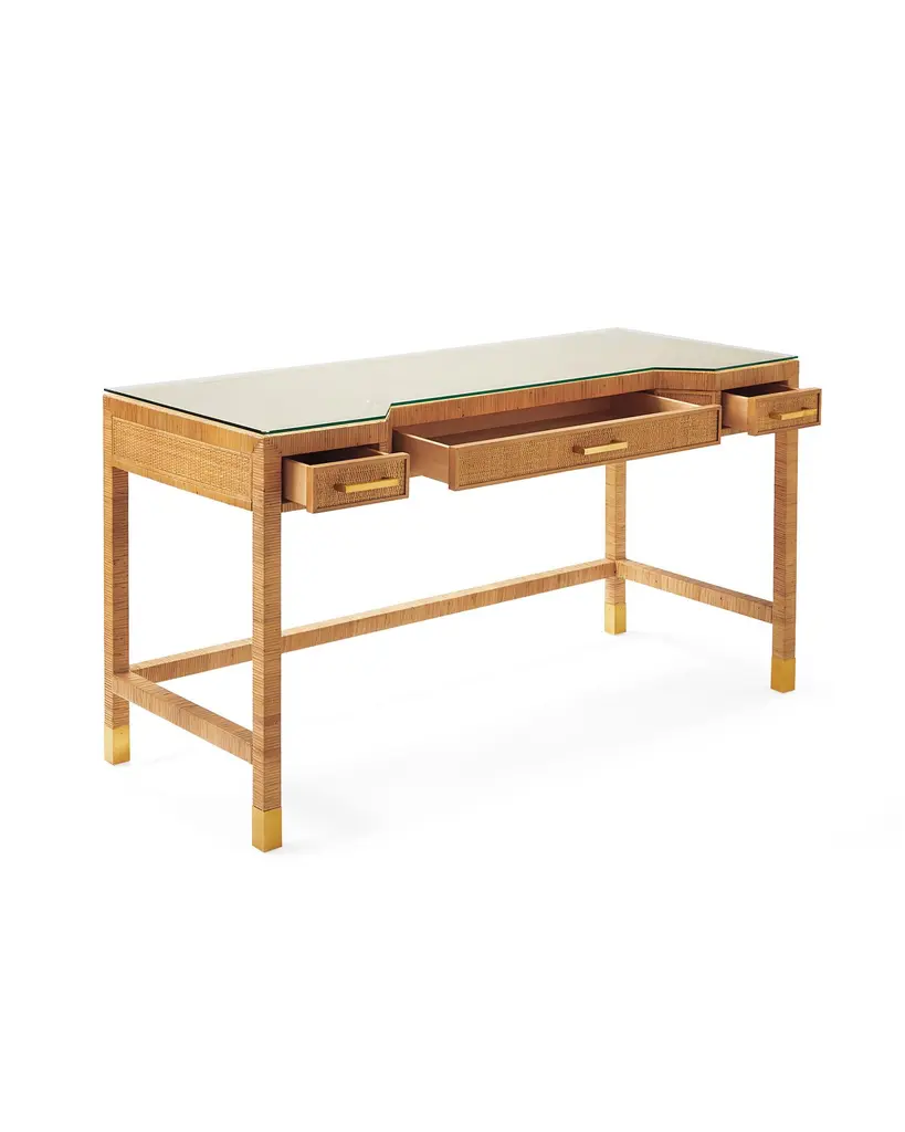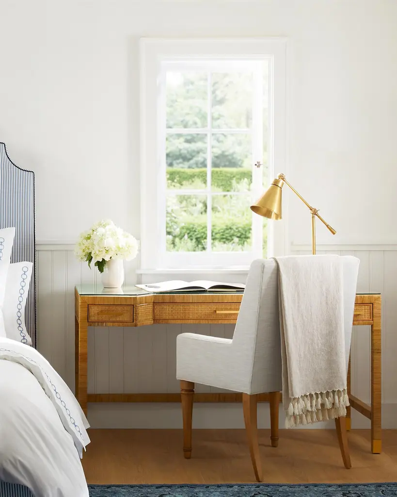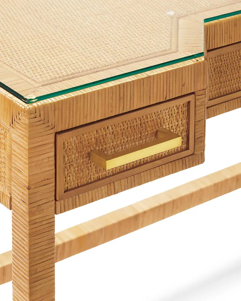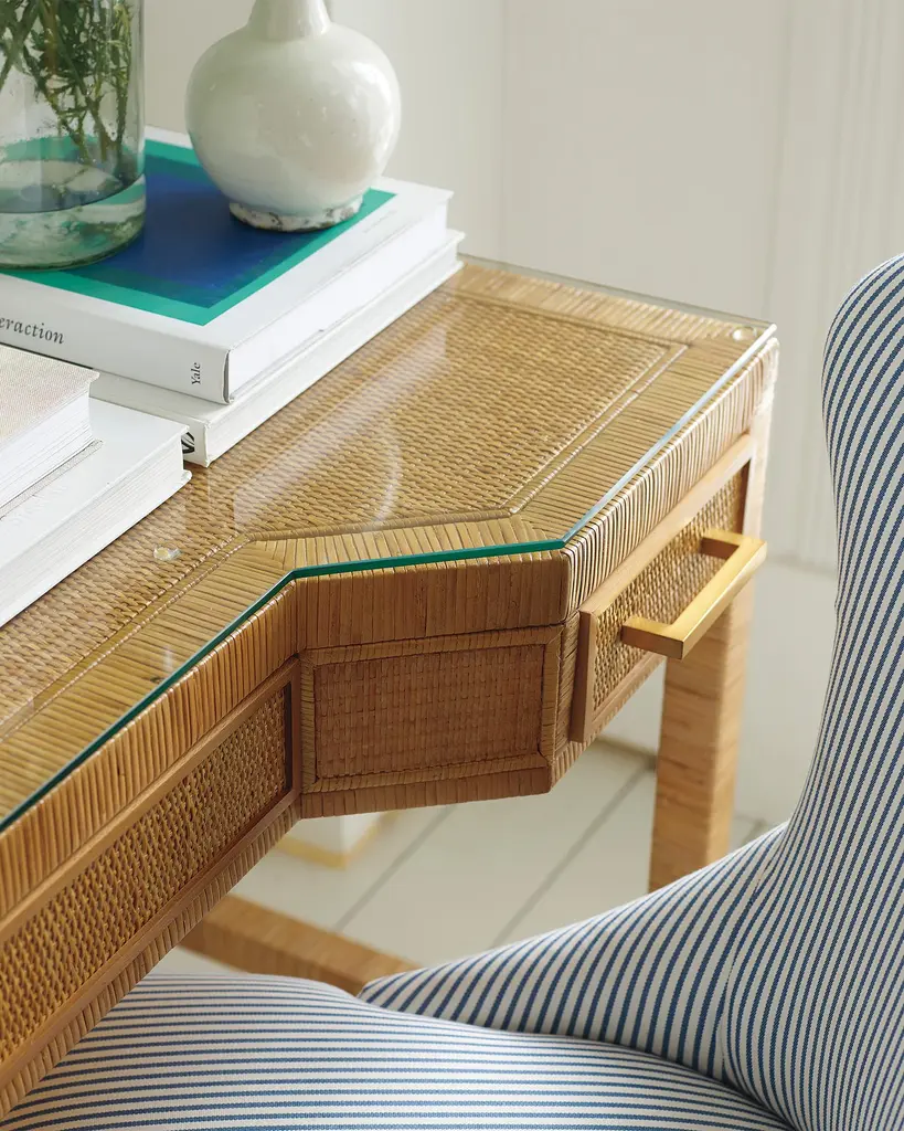 Design chameleon. A Parsons shape. Rattan woven over Pacific coast maple. Resplendent texture. Brass caps. A showpiece of tonal nuance. It also makes for a lovely vanity.