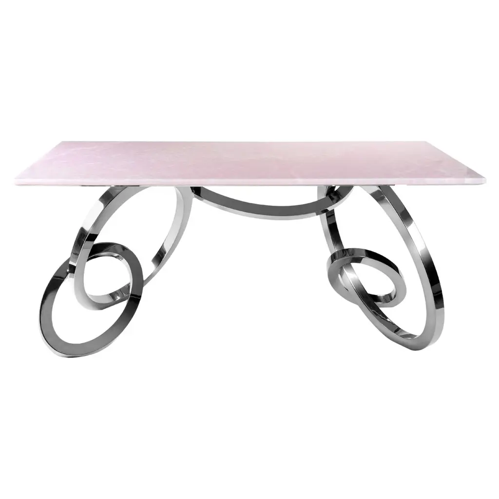 Bangles desk is structured in mirror-polished stainless steel and a top in rare orange onyx. Dimensions are customizable. Every single bangle is welded and highly polished by hand. The mirror-like finishing of the steel creates different perceptions of this particular material and allows interesting reflections of light. Each table is hand signed and numbered by the artists. 100% handmade in Italy, comes with a “Certificate of Authenticity”. Dimensions are customizable.