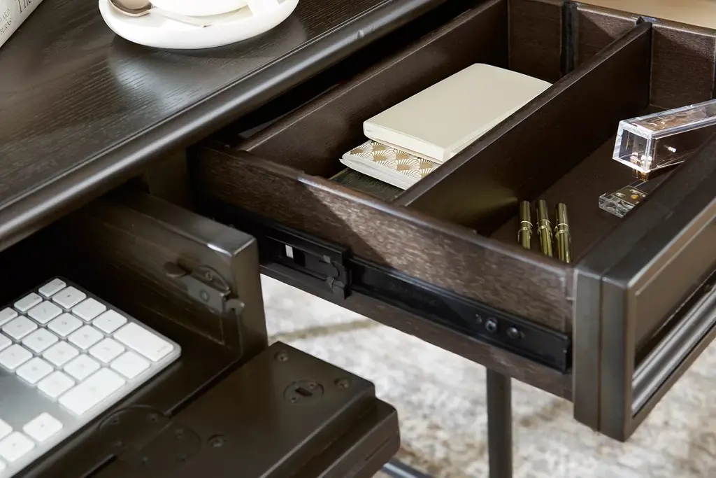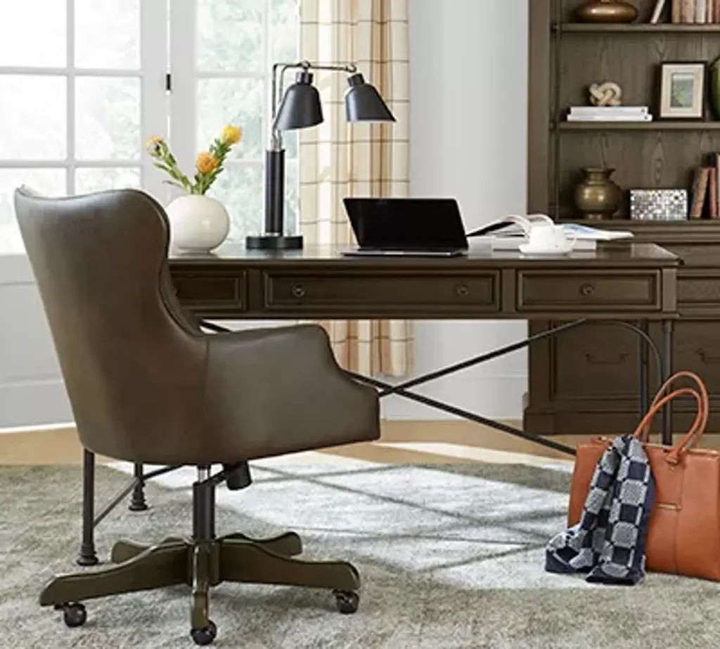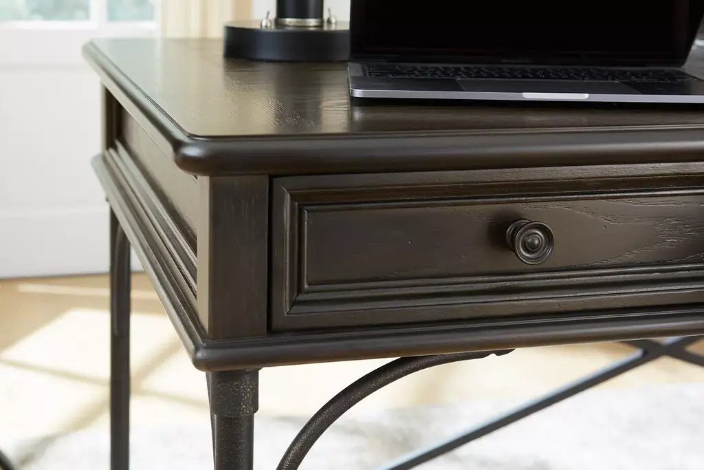 Embrace beautiful, transitional style with our Barnes writing desk. Featuring an antiqued bronze finished base, this piece is expertly crafted with hardwood solids and white oak veneers in a multi-step burnished brown finish.