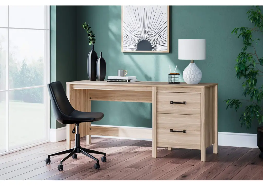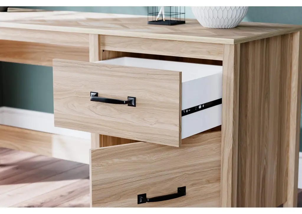 Your home office should reflect your style. Pairing the look of oak grain with a unique chevron pattern, the Battelle home office desk introduces a touch of mid-century modern style that's sure to elevate your space. Use this desk as a stand-alone work area, or pair it with the matching desk return to create a larger work surface. Weight 86.000 lbs. (38.7kgs.)