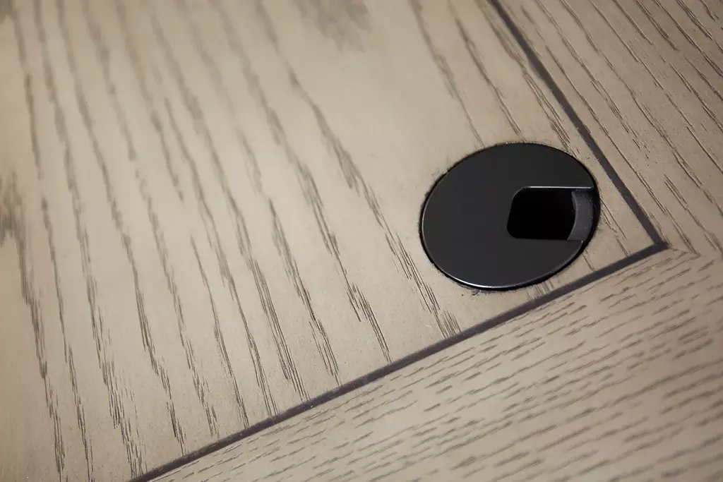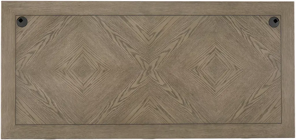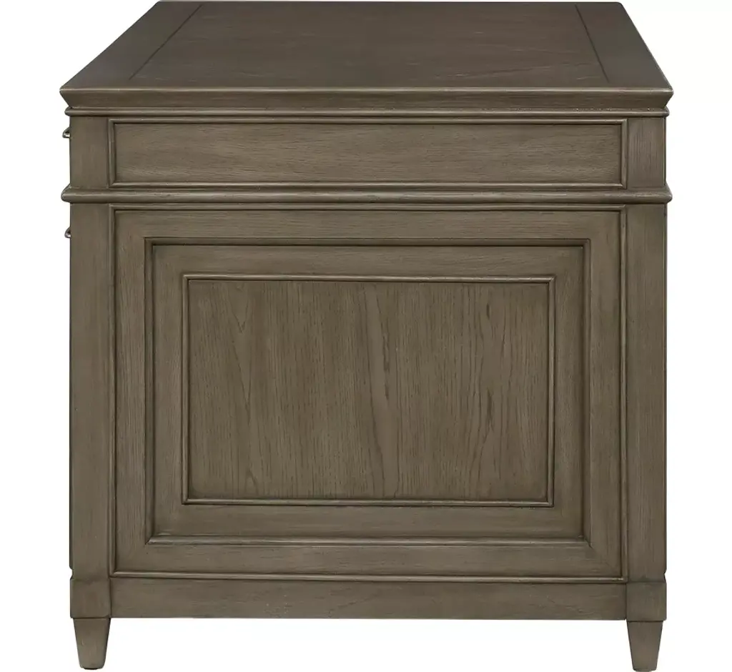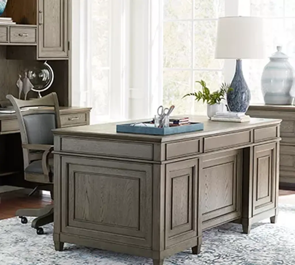 Our Baylor executive desk is a commanding piece perfect for any home office. Multiple drawers provide storage options as well as legal and letter paper filing capabilities, while a flip-down keyboard tray and a shelf give you even more room to keep your workspace organized. Gorgeous white oak veneers in a diamond pattern come in a gray wash finish with walnut inlays and complementing brushed nickel hardware.