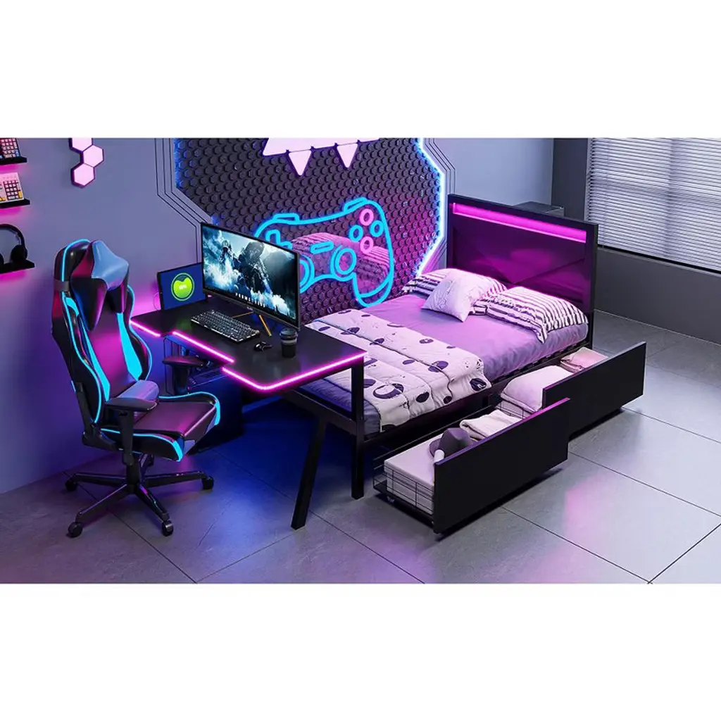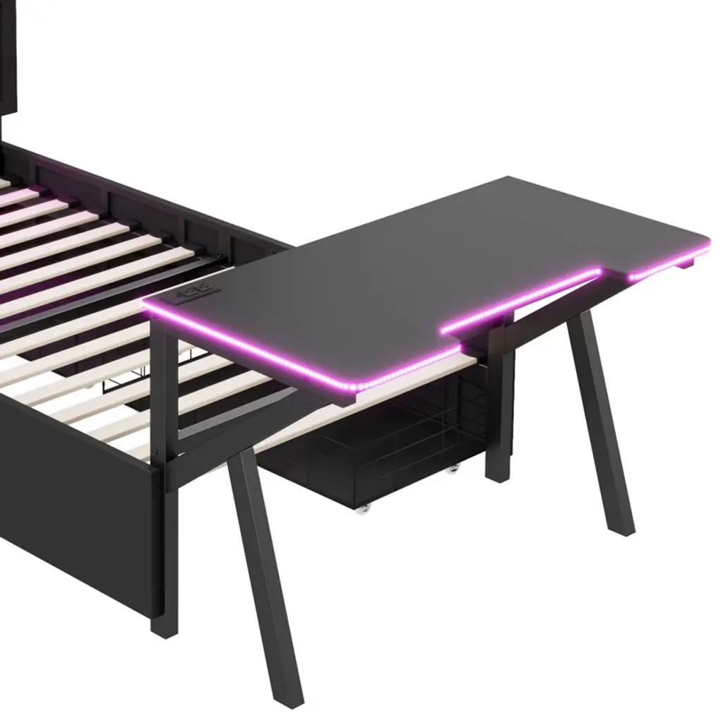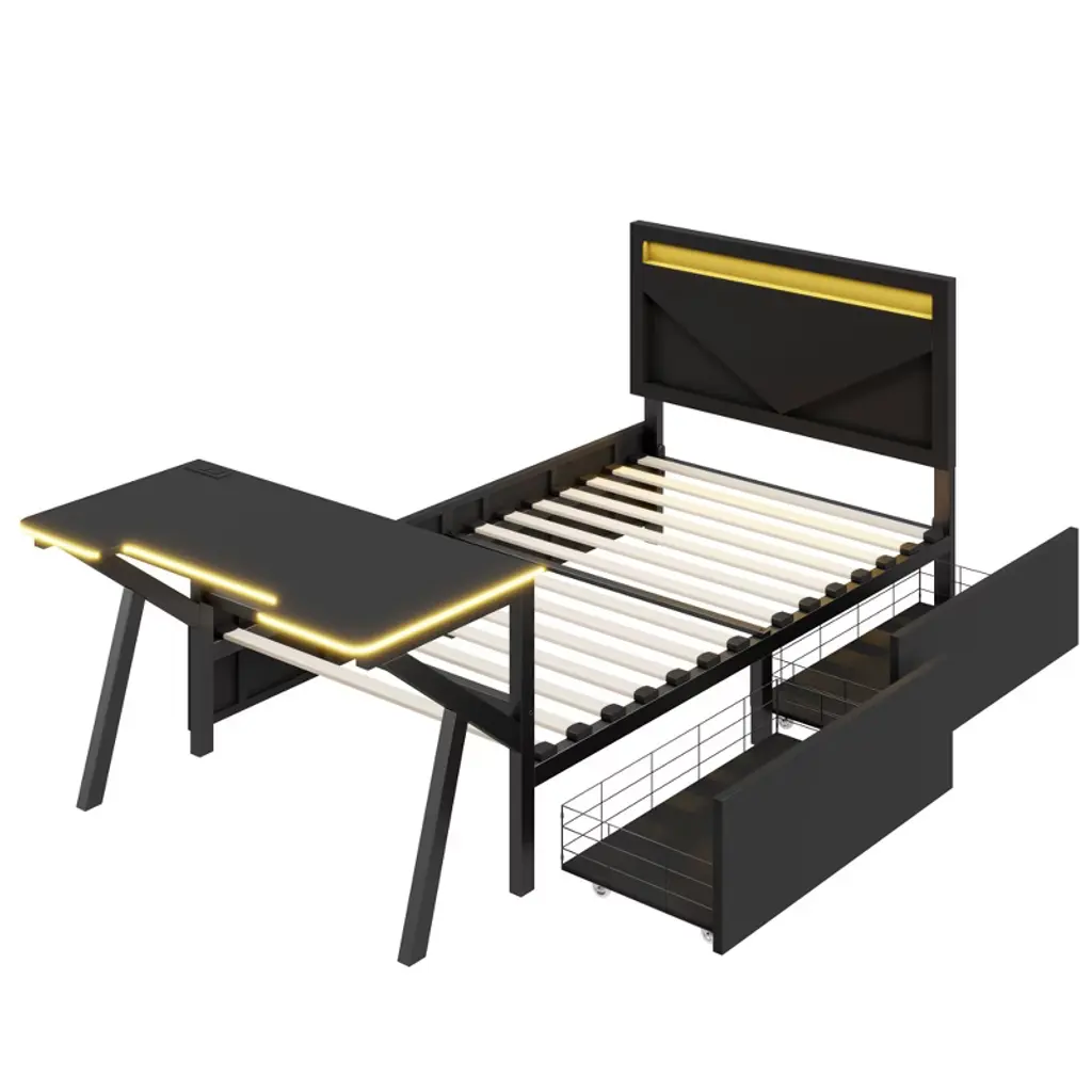 Bellemave Tiwn Gaming Bed With Desk And Led And Storage Drawers, Metal Gamer Bed, Twin Beds With Desk, Black