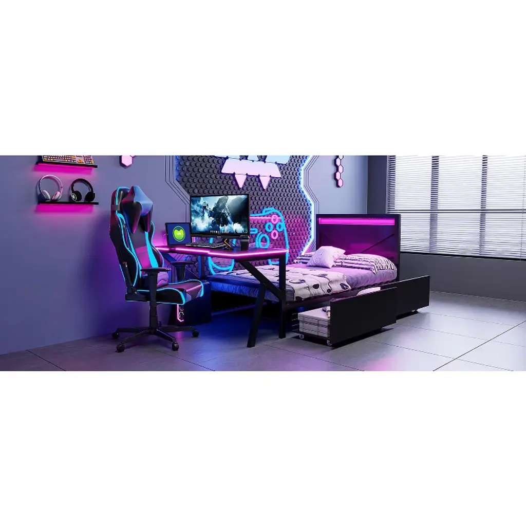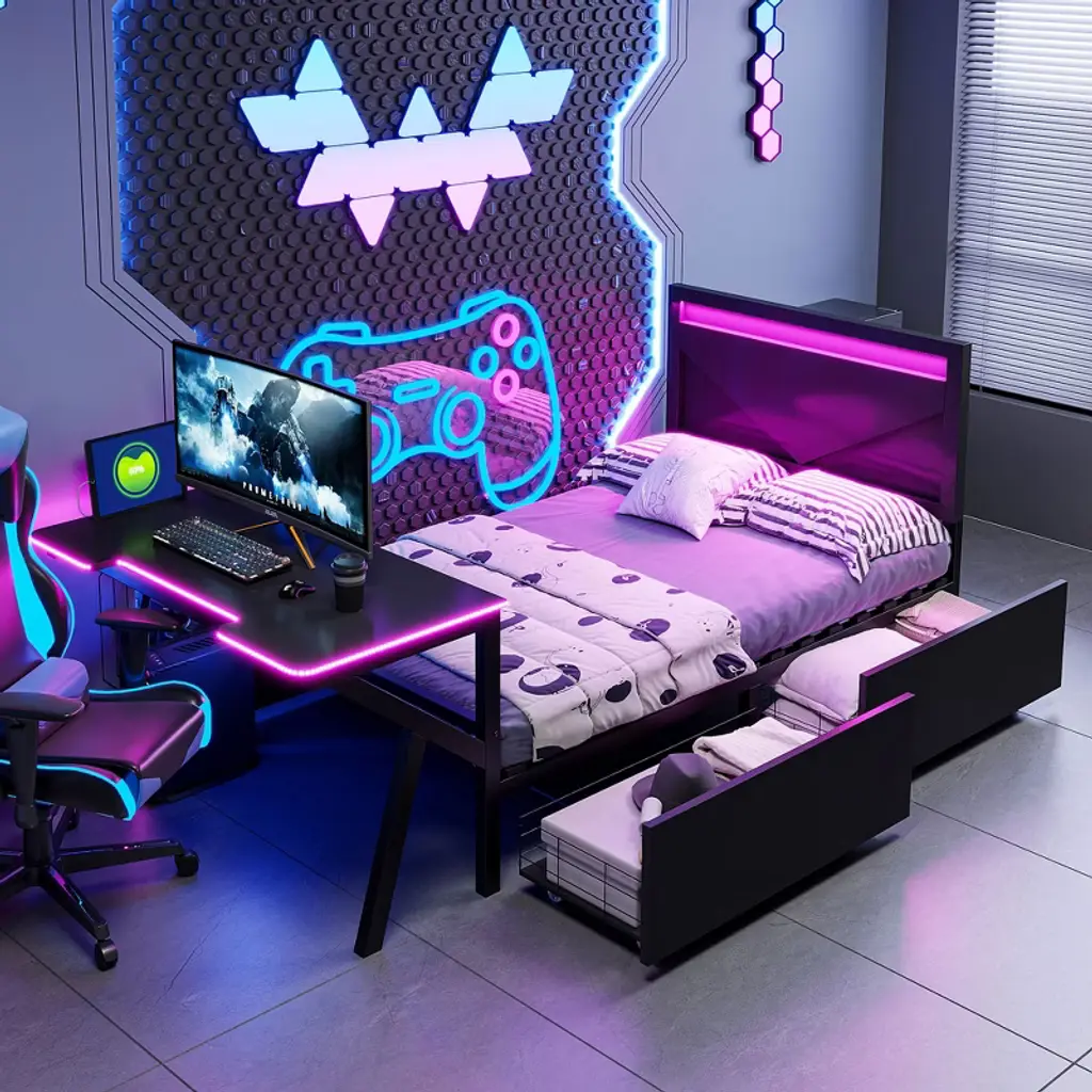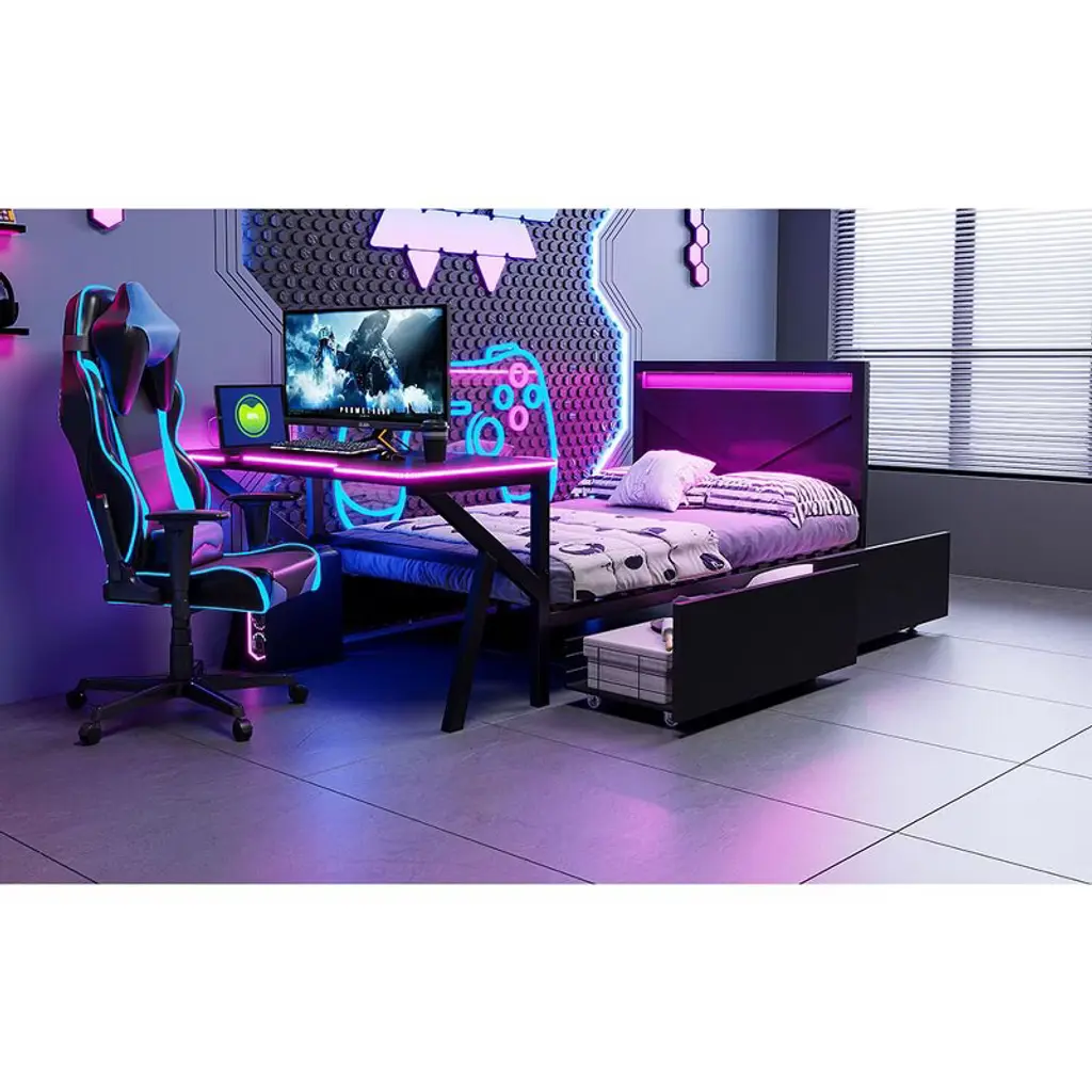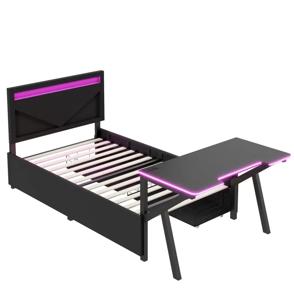 Create your gaming room with this platform bed with this bed. The bed with desk has LED around the perimeter and USB devices embedded in the table surface. This playbed is ideal for young gamers. It comes with 2 drawers, providing ample under-bed storage space for extra furniture, toys.