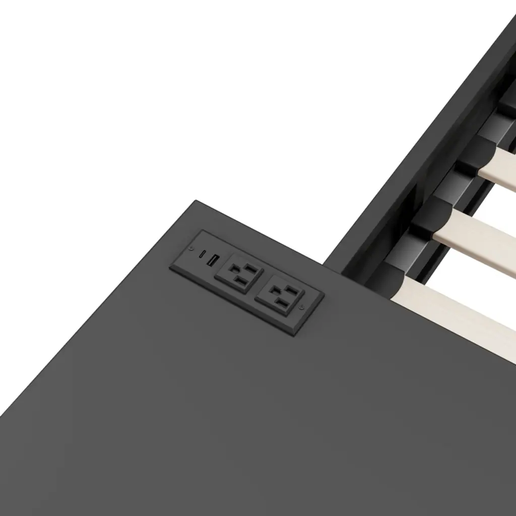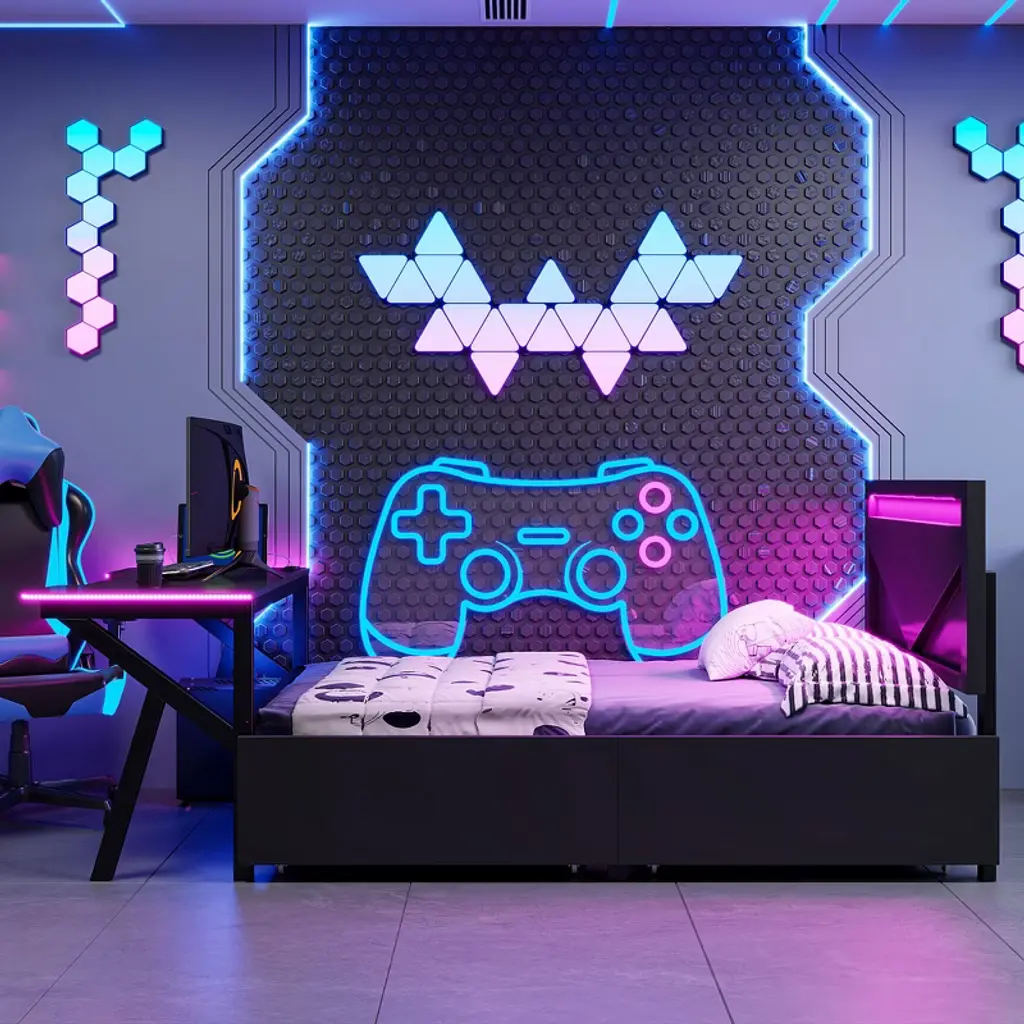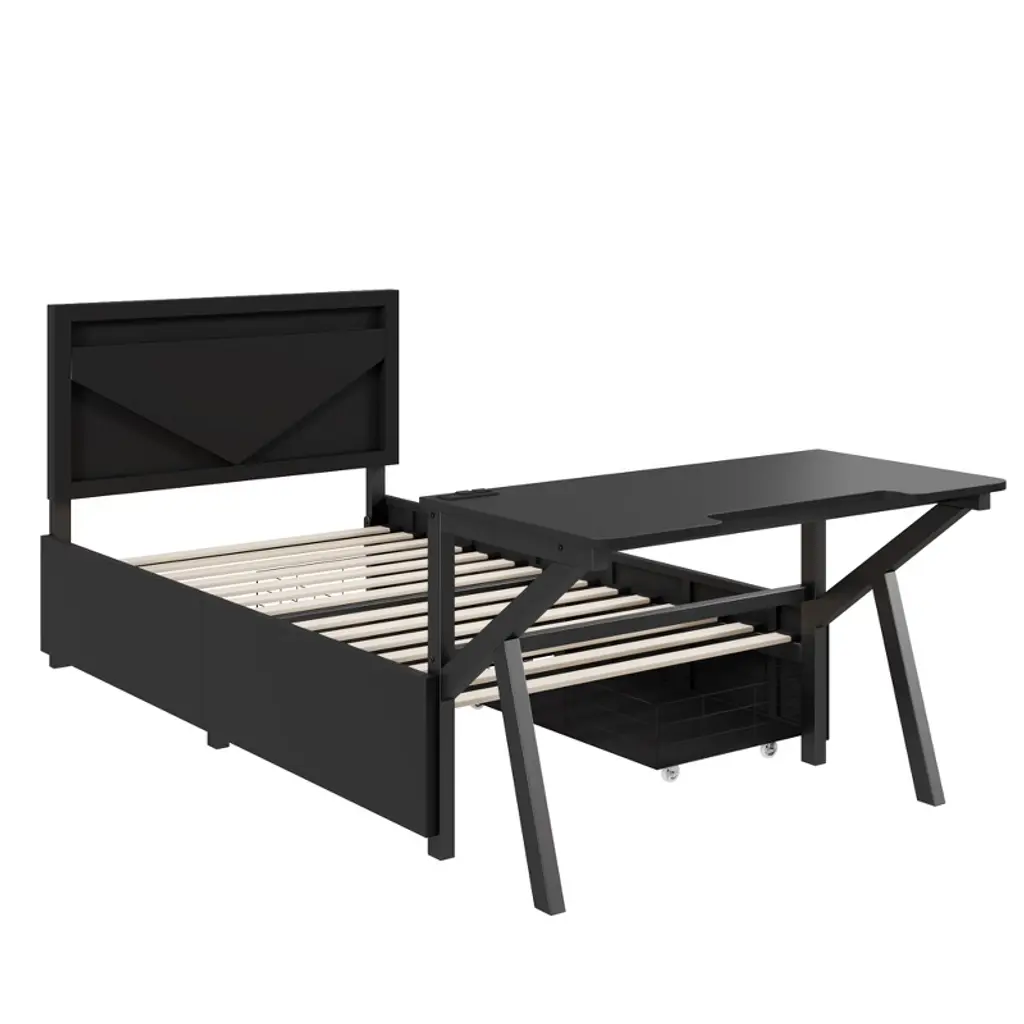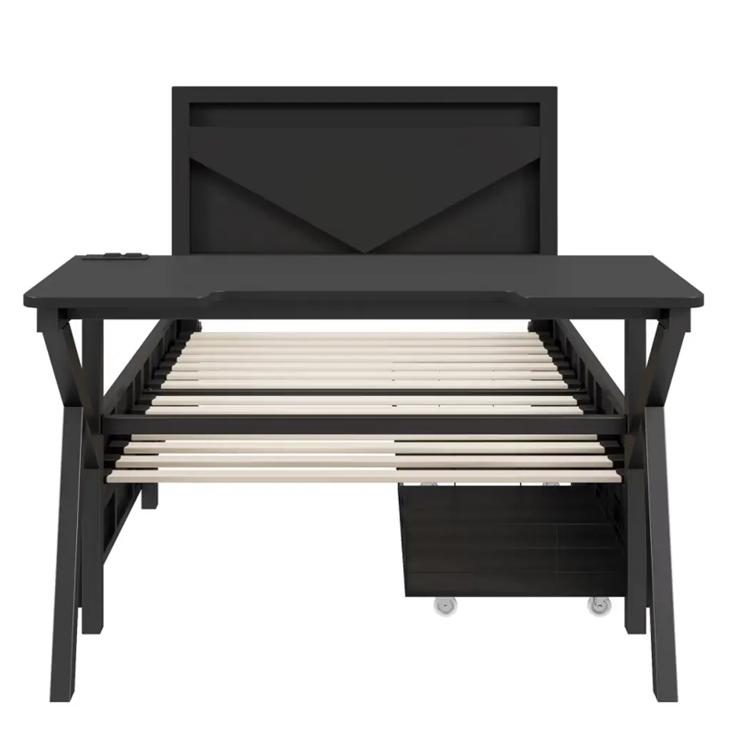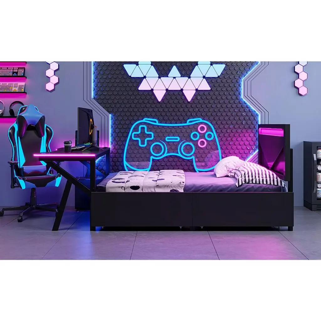 Create your gaming room with this platform bed with this bed. The bed with desk has LED around the perimeter and USB devices embedded in the table surface. This playbed is ideal for young gamers. It comes with 2 drawers, providing ample under-bed storage space for extra furniture, toys.