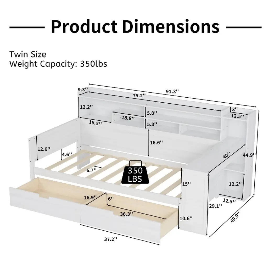 Bellemave Wooden Twin Size Daybed With Storage Shelves, Multi-functional Bed With Two Storage Drawers And Study Desk, Antique White