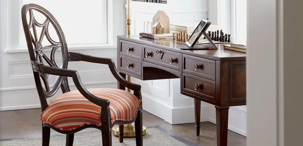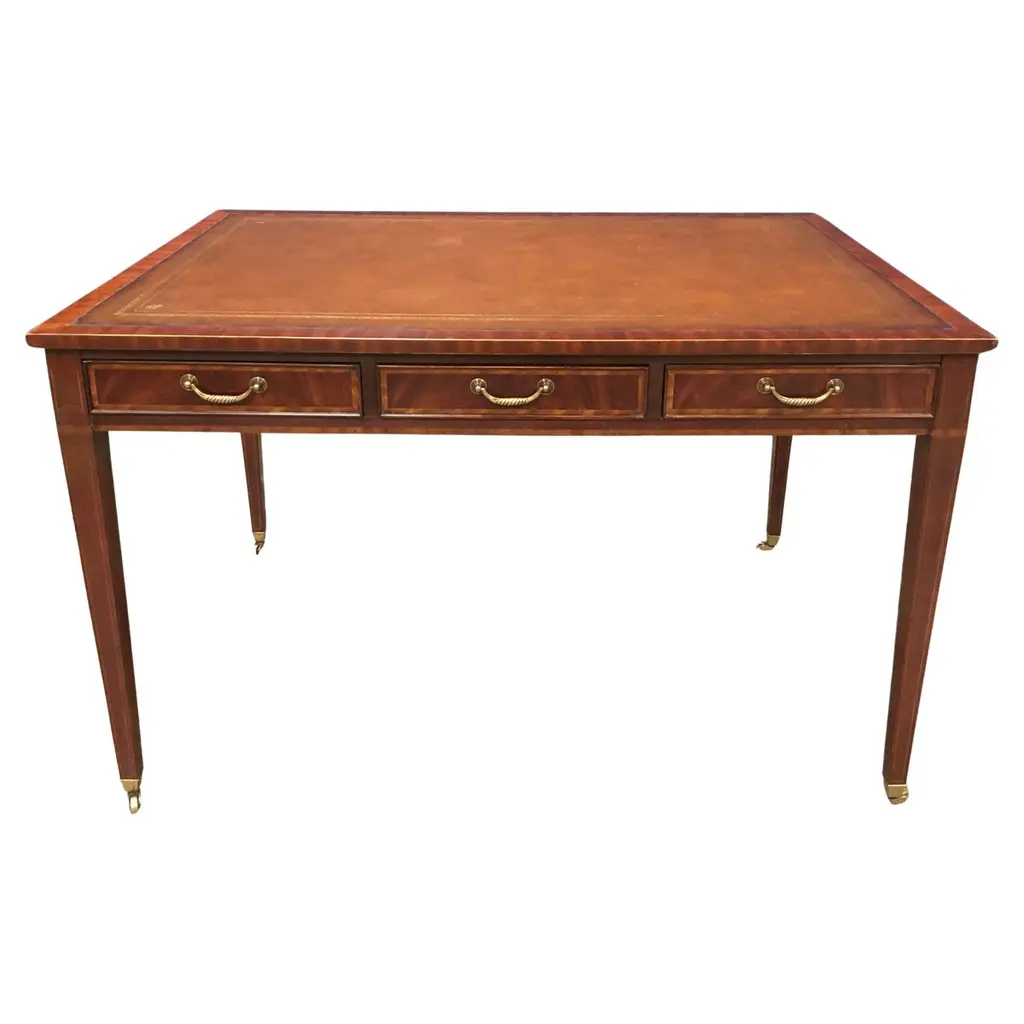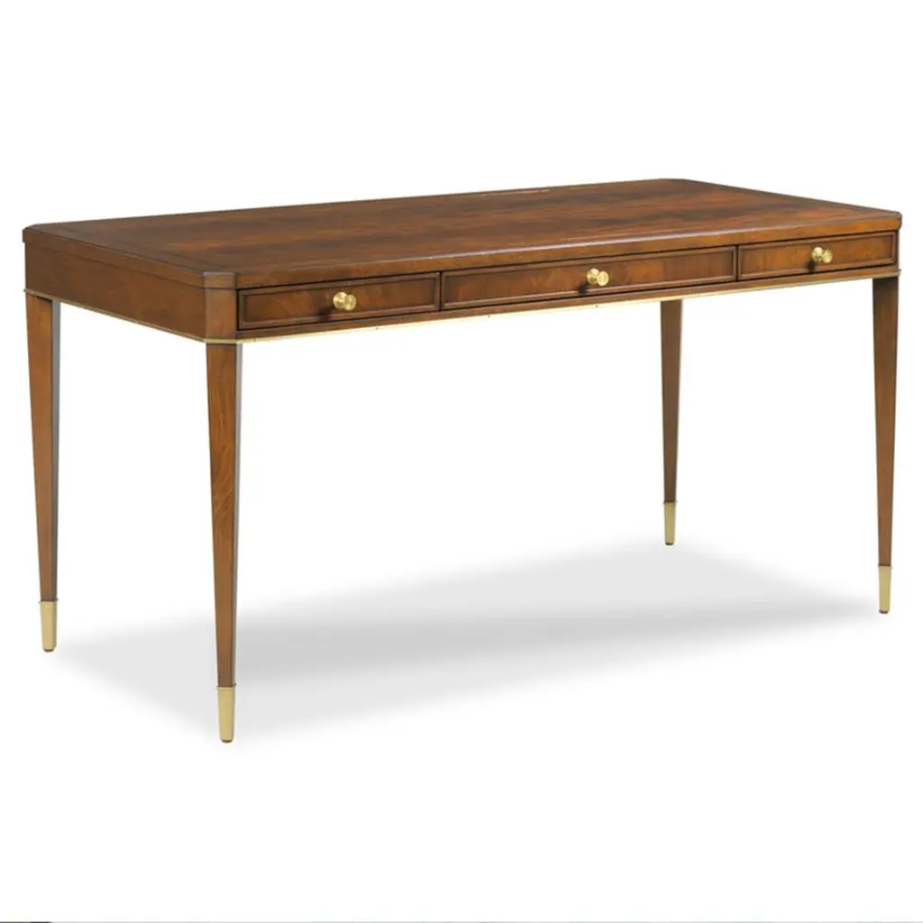 Our beautifully proportioned writing desk is highly detailed, graceful and traditional in feel. It features ash burl veneer drawer fronts, and three hand-tooled, inlaid leather top sections with gold leaf embossing. Tapered legs lend lightness to its profile, while a drop-front drawer with metal glides for laptop storage makes it as practical as it is lovely.