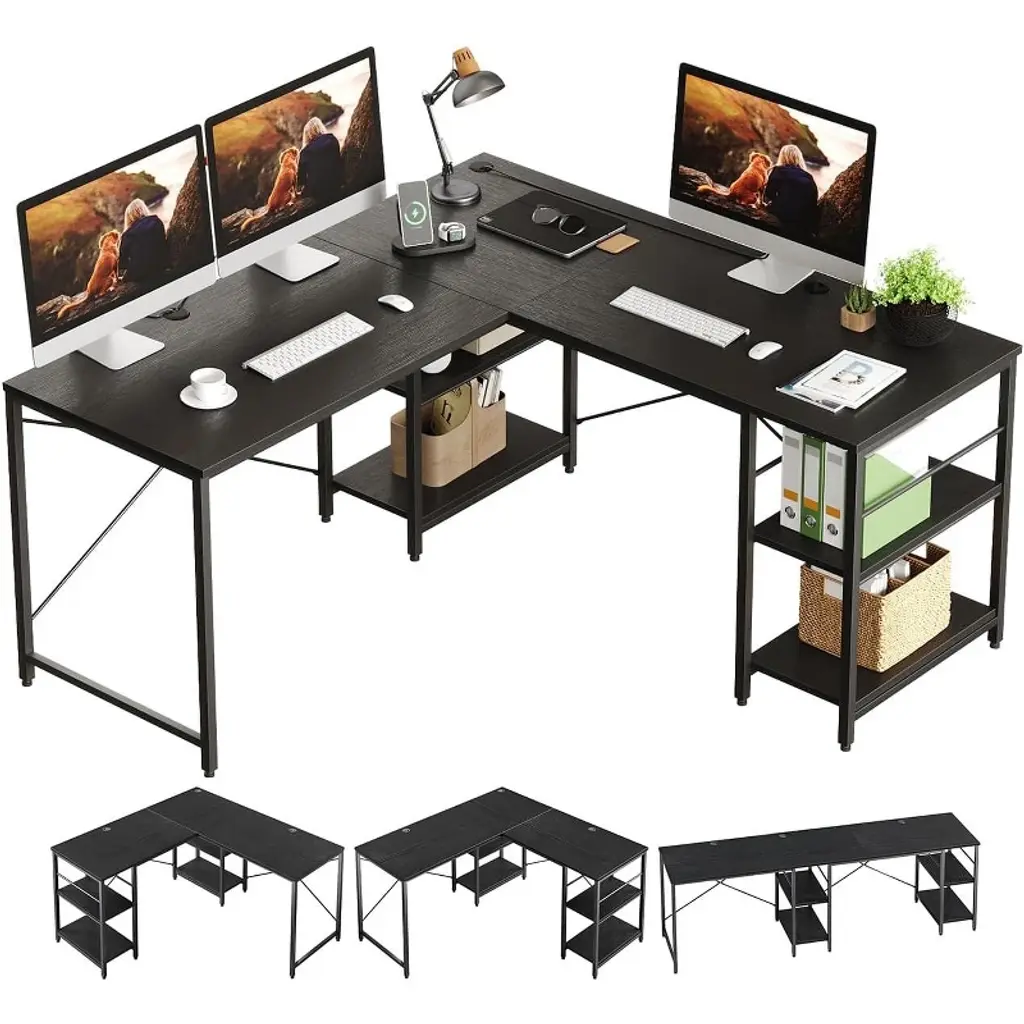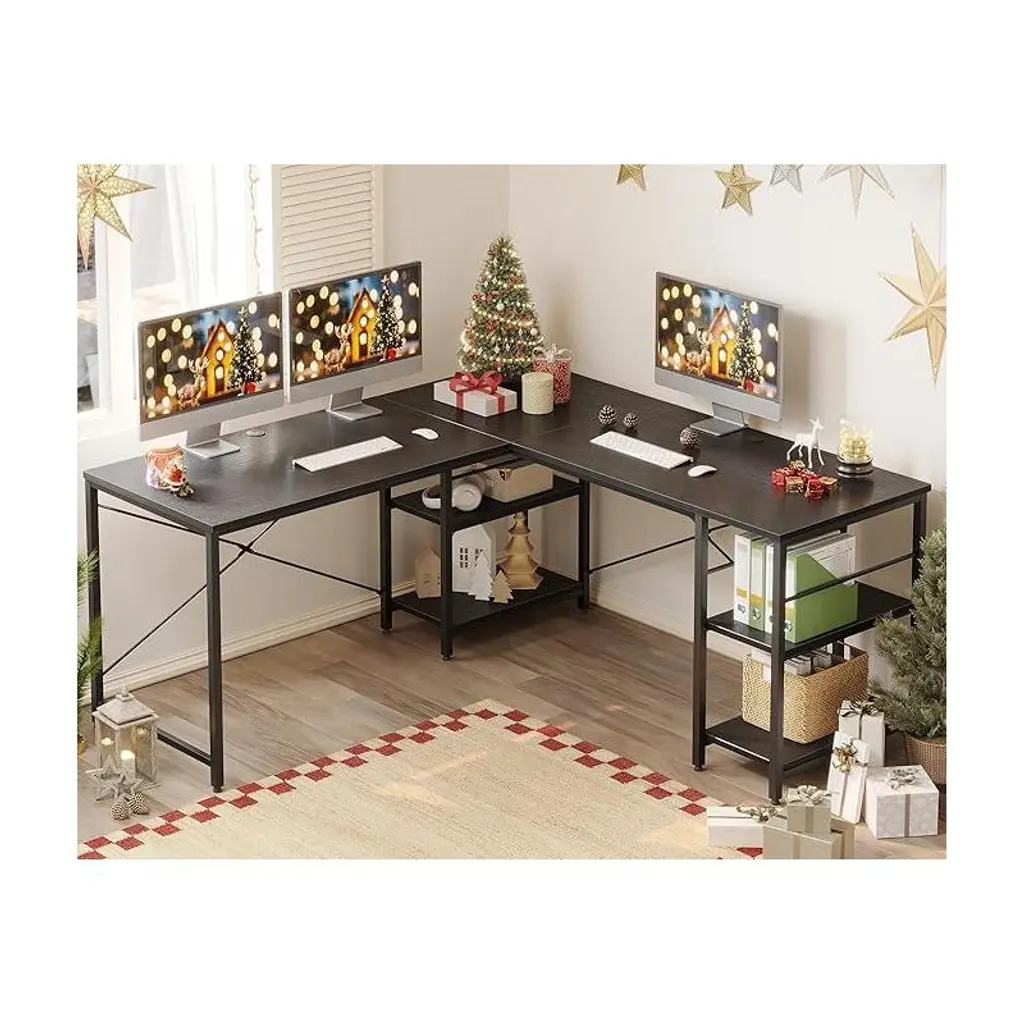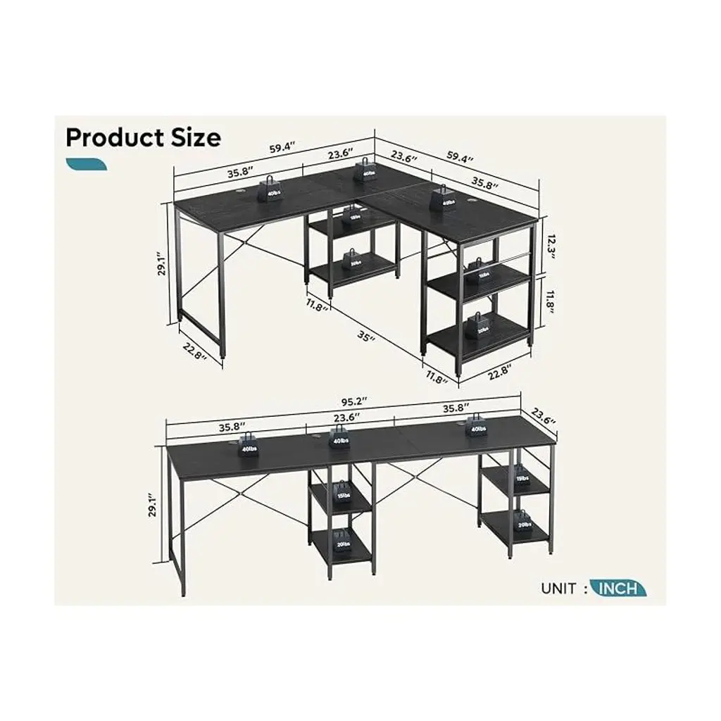 This reversible L-Shaped computer desk is designed for multi-purpose, well fitted in the office for work, playroom for computer games, living room for family use, and more.The 95.2 inch large l shaped desk has 4 Tier Adjustable Shelves and 3 Cable Holes.There are 2 kinds of assembly ways for 4 tier storage shelves, on Left or Right.Covered with melamine material, the writing desk is waterproof, scratch-resistant and easy to clean.Shelves under the desk can be moved out to the upper or lower level, to make room for a computer tower.The solid metal frame and triangle strut ensure the stability, letting you enjoy your work or study on this table.It is also a great addition to any home office. Our L-Shaped PC desks are also good choices for students who are looking for study or gaming desks. It's a perfect gift for your family or friends.