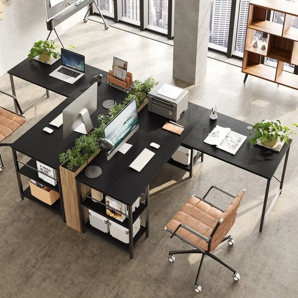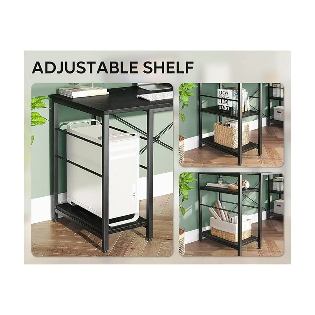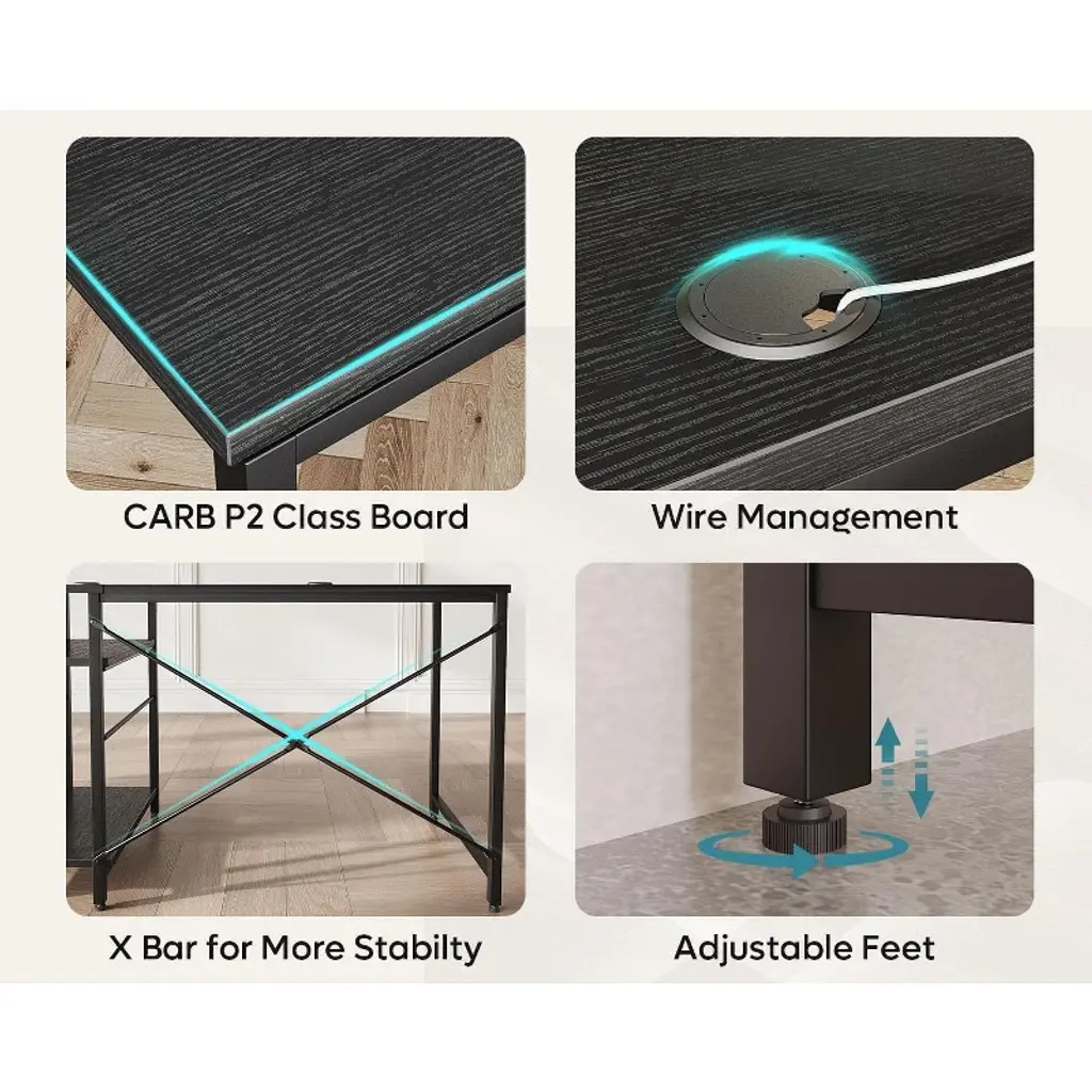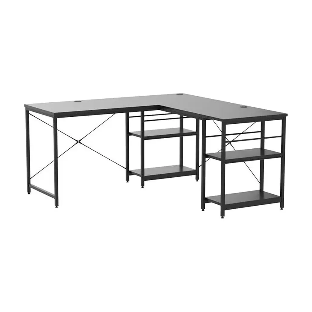 This reversible L-Shaped computer desk is designed for multi-purpose, well fitted in the office for work, playroom for computer games, living room for family use, and more.The 95.2 inch large l shaped desk has 4 Tier Adjustable Shelves and 3 Cable Holes.There are 2 kinds of assembly ways for 4 tier storage shelves, on Left or Right.Covered with melamine material, the writing desk is waterproof, scratch-resistant and easy to clean.Shelves under the desk can be moved out to the upper or lower level, to make room for a computer tower.The solid metal frame and triangle strut ensure the stability, letting you enjoy your work or study on this table.It is also a great addition to any home office. Our L-Shaped PC desks are also good choices for students who are looking for study or gaming desks. It's a perfect gift for your family or friends.