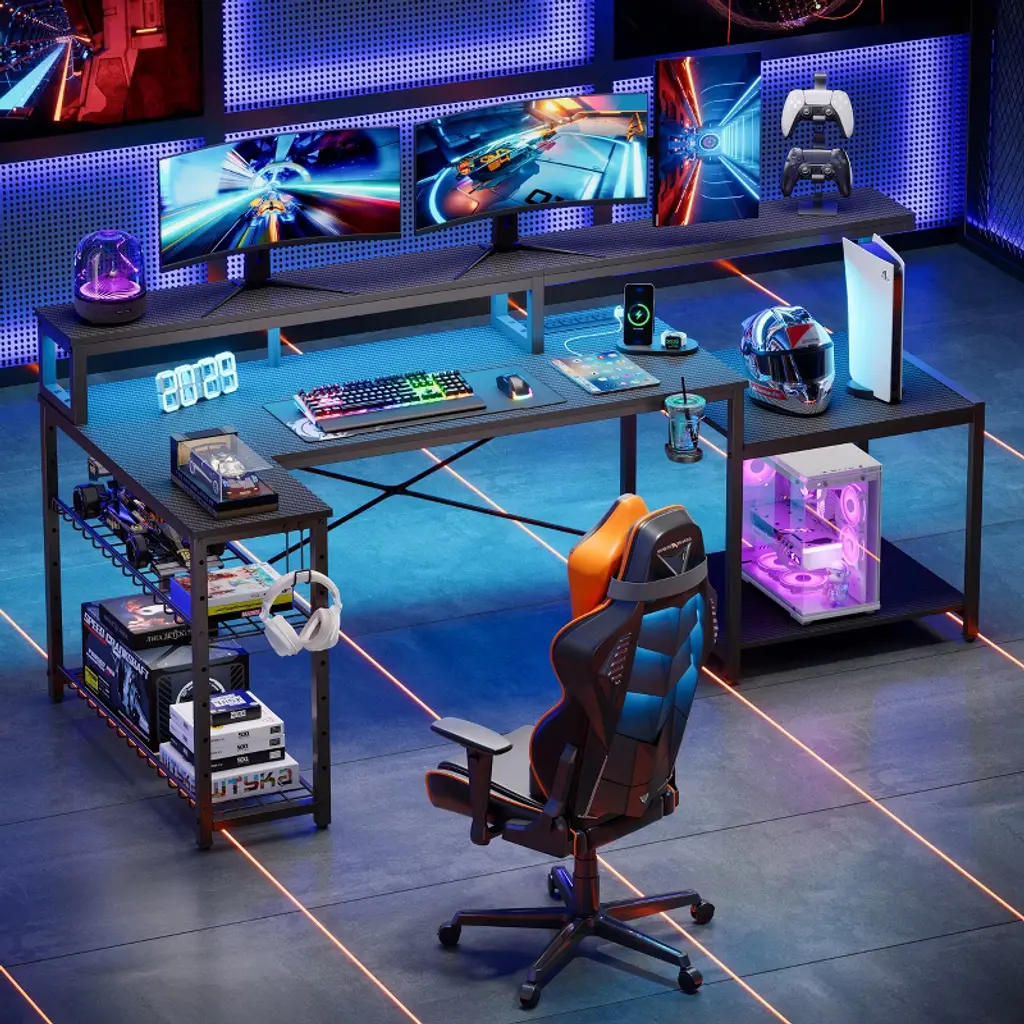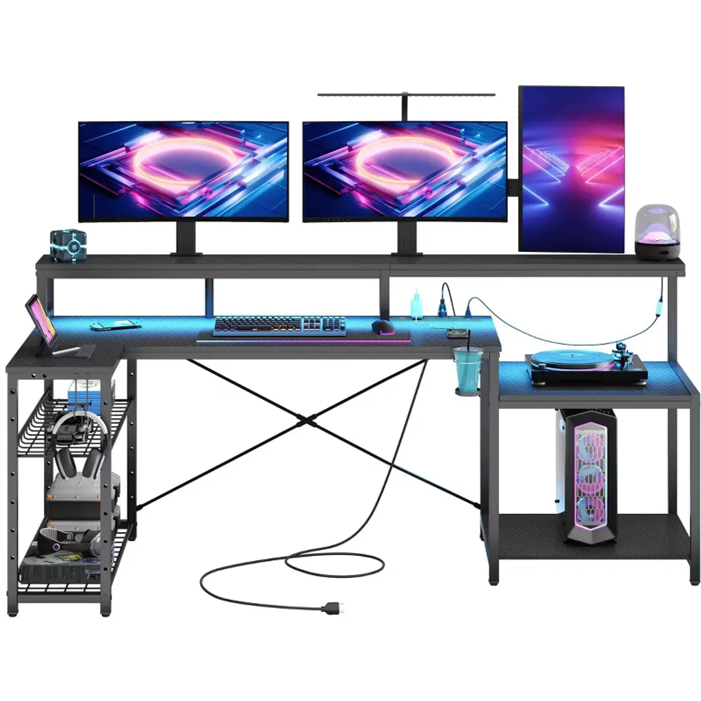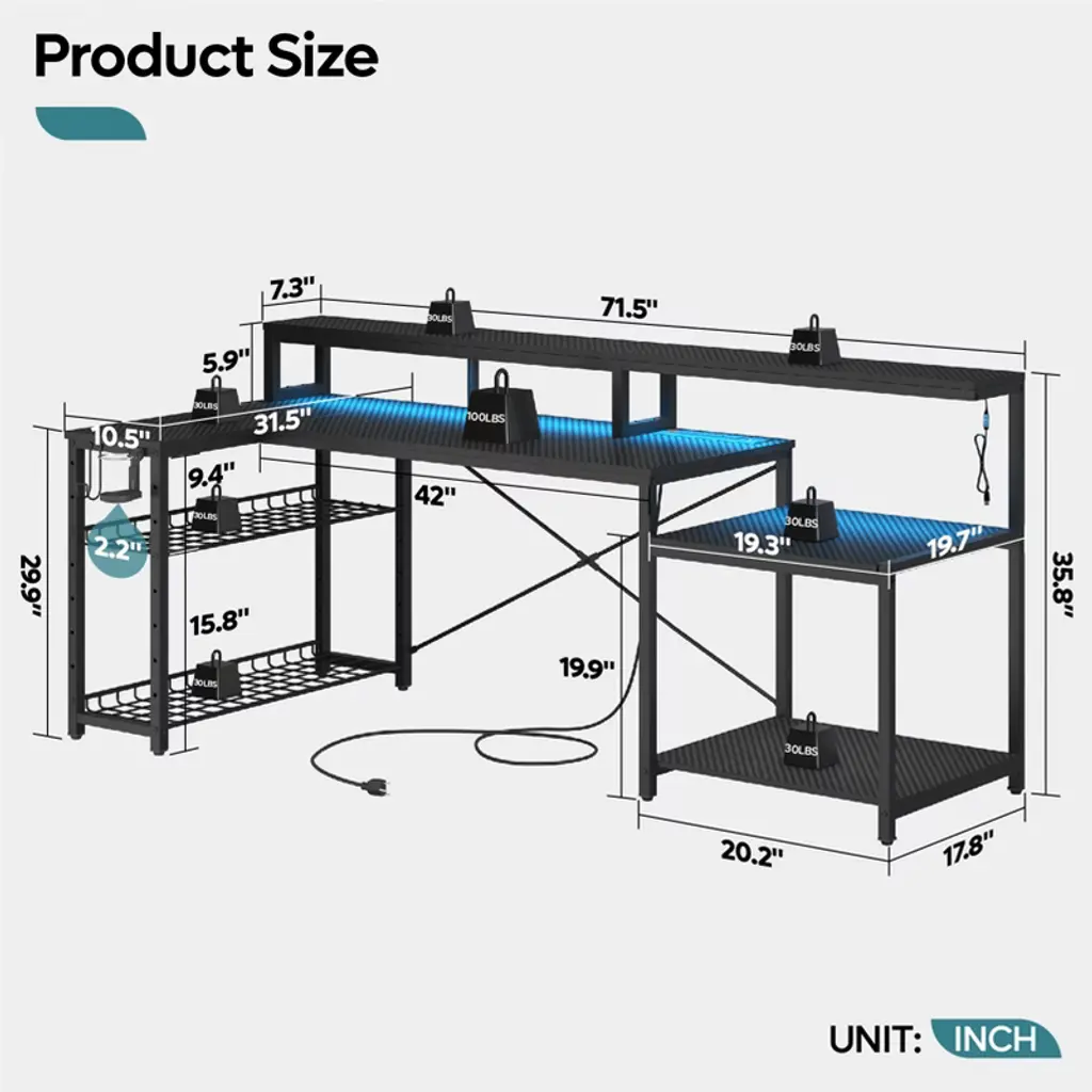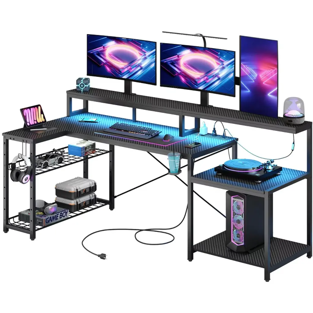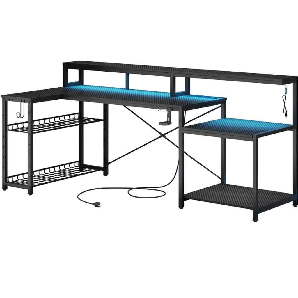 Bestier 71.5" W Led Gaming Desk With Power Outlet, L-shaped Computer Desk With Monitor Stand Black Carbon Fiber
