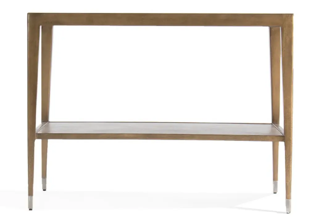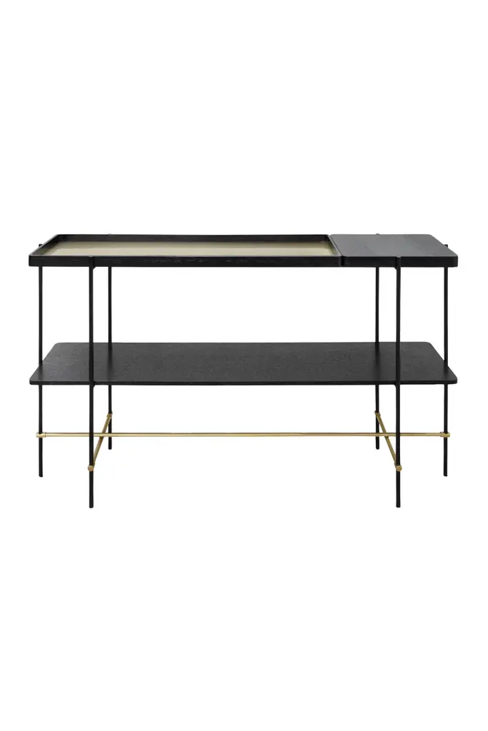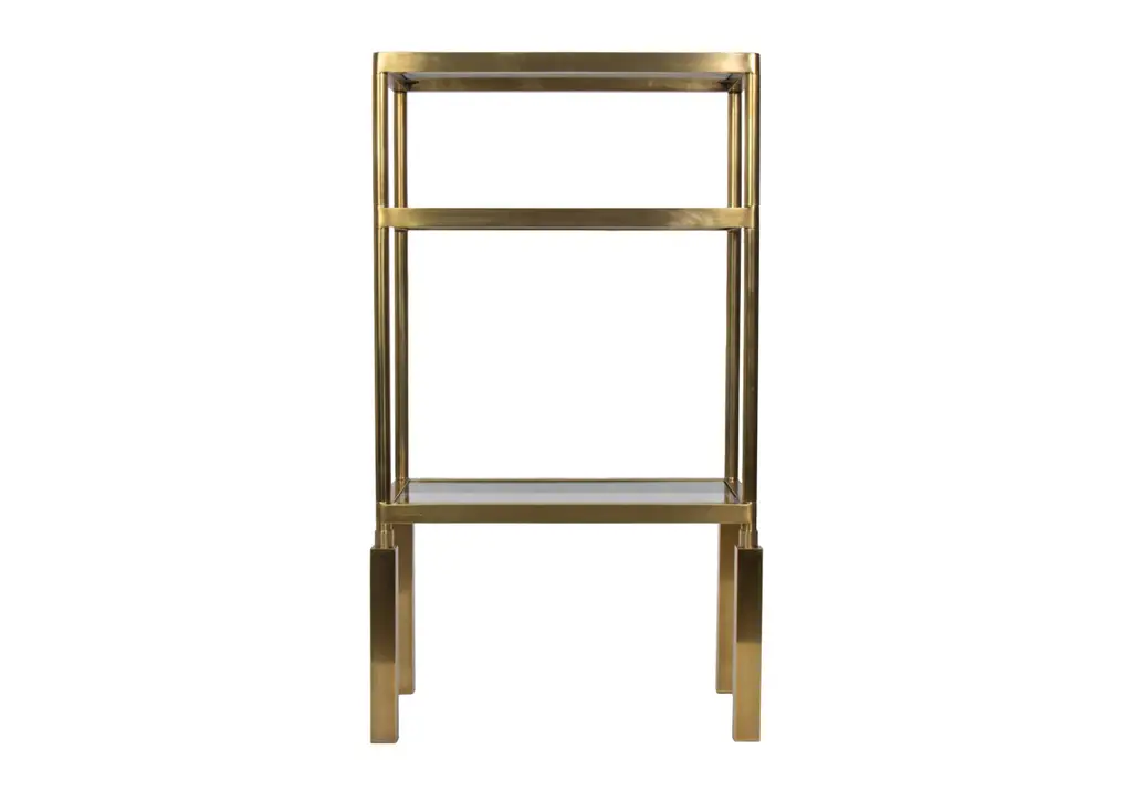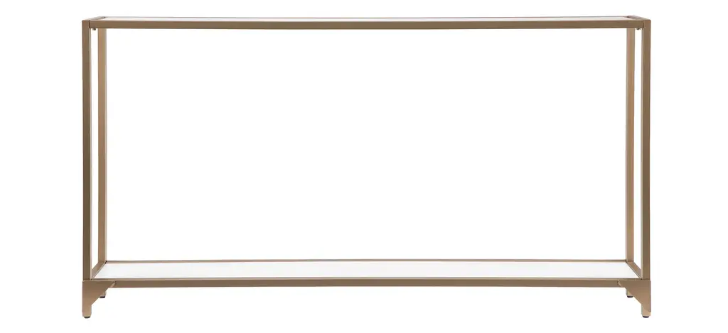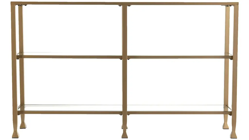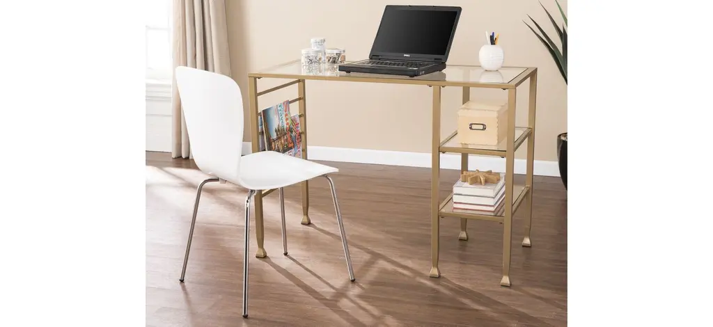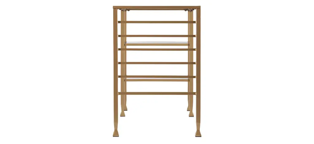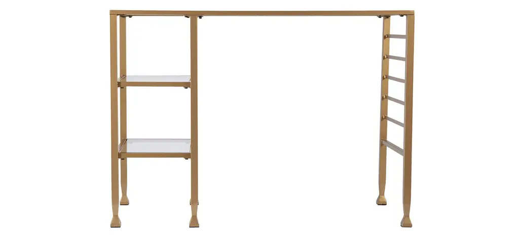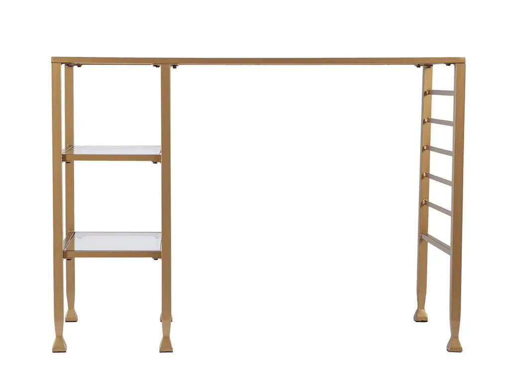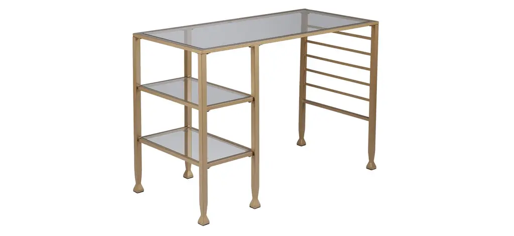 Bexley Writing Desk let sleek minimalism lift your home office to new heights with this gold writing desk. Effortlessly aligned, the soft gold frame cures the clutter with two fixed shelves and six accessory rails. Playful pyramid feet support airy architecture, supplying this glass writing desk with universal appeal for the home office or any nook.