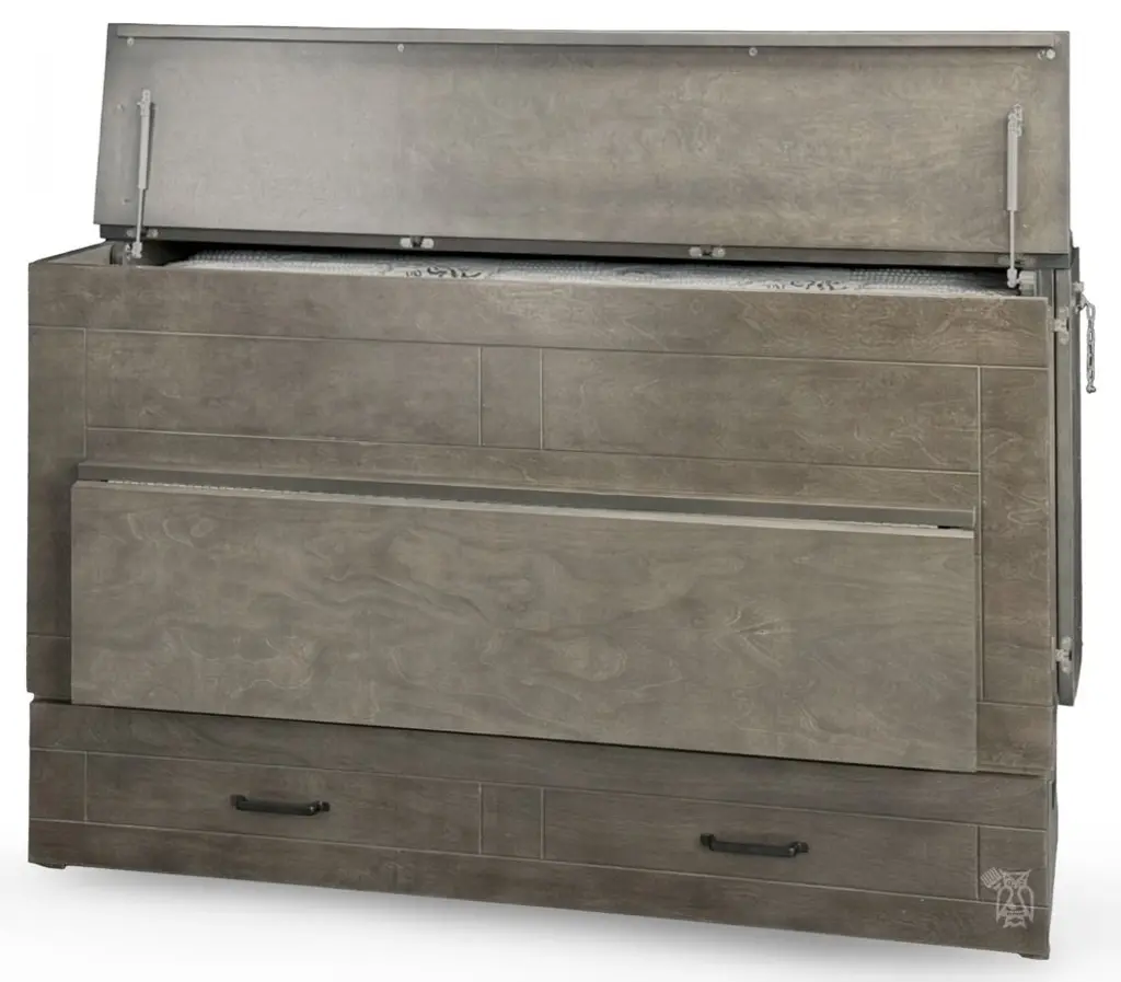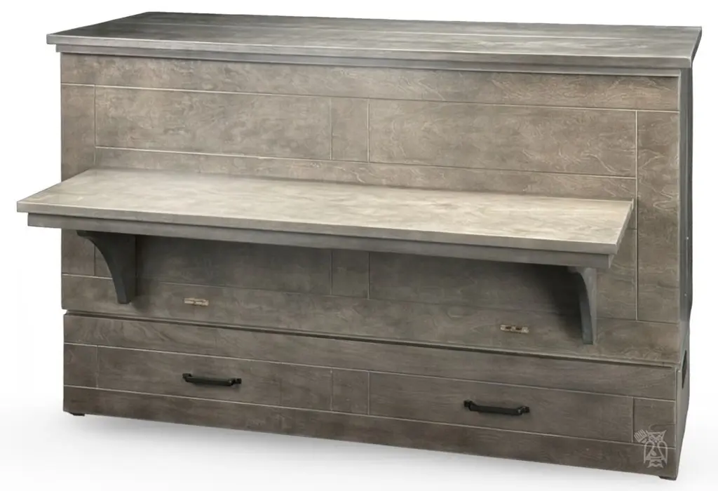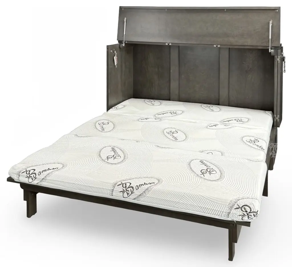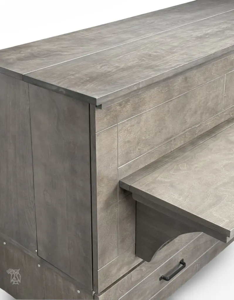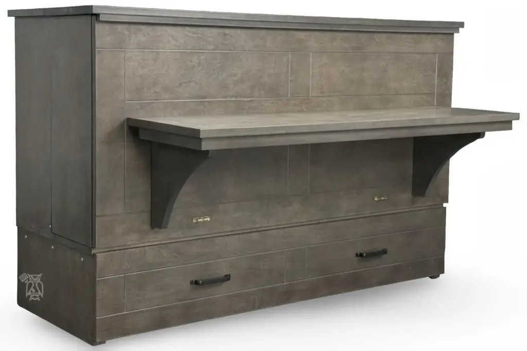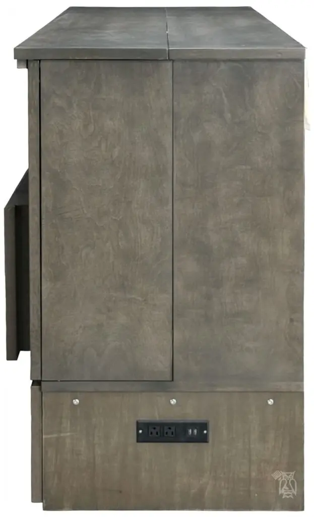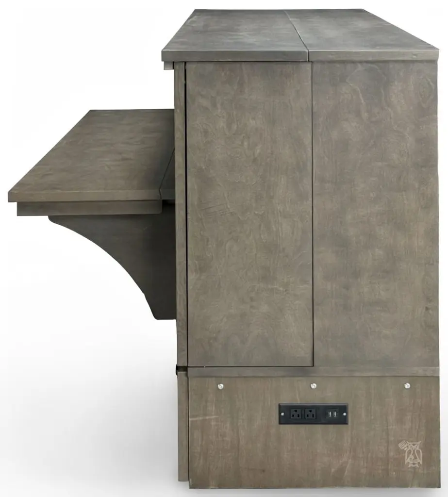 Birch Wood Studio Collection Queen Size Folding Murphy Cabinet Bed With Desk in Grey. The Studio Series is an all-new Cabinet Bed that has a multipurpose function, serving as a comfortable bed by night and a spacious desk by day. Whether you need a cozy retreat for guests or a productive workspace, this multifunctional piece of furniture has you covered. The Studio Series easily converts into a comfortable bed in 60 under seconds. It features stylized grooved panels, opening side panels and can support a 60" TV screen. Elite Studio Cabinet Bed with Desk features include: Folds open in about 60 seconds Functional desk space Higher Sleep Platform Built-in Dual Power/USB module Solid and Birch plywood construction No particle board or MDF. Tri-Fold Gel-Infused CertiPur-US Foam Queen Mattress Bed supports up to 500 lbs. 59" wide storage compartment Two color options Each CabinetBed is made with the highest quality Birch plywood. Unlike many competitors, our beds are built strictly with solid plywood and will never contain cost-cutting materials such as particle board and MDF, which both lack strength. You can be confident that the flexible polyurethane foam inside each CabinetBed meets CertiPUR-US® standards for content, emissions, and durability and has been analyzed by independent, accredited testing laboratories. Assembly required in room. No particle board. Manufacturer: Cabinet Beds Inc.