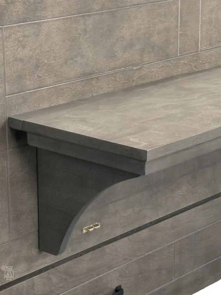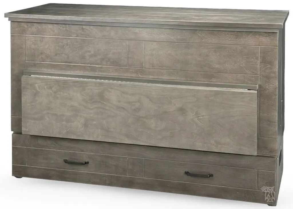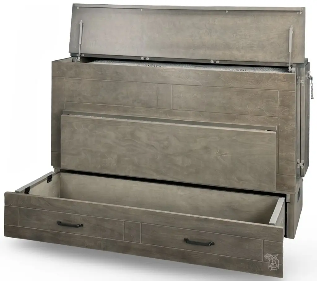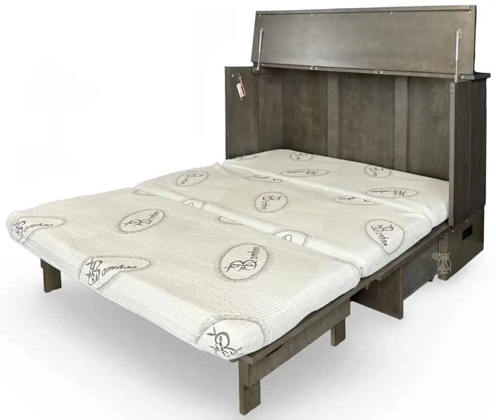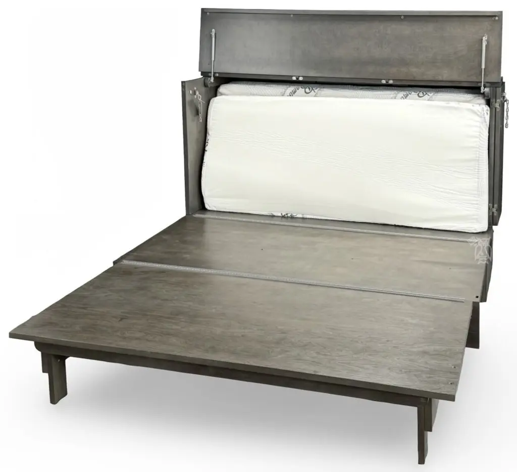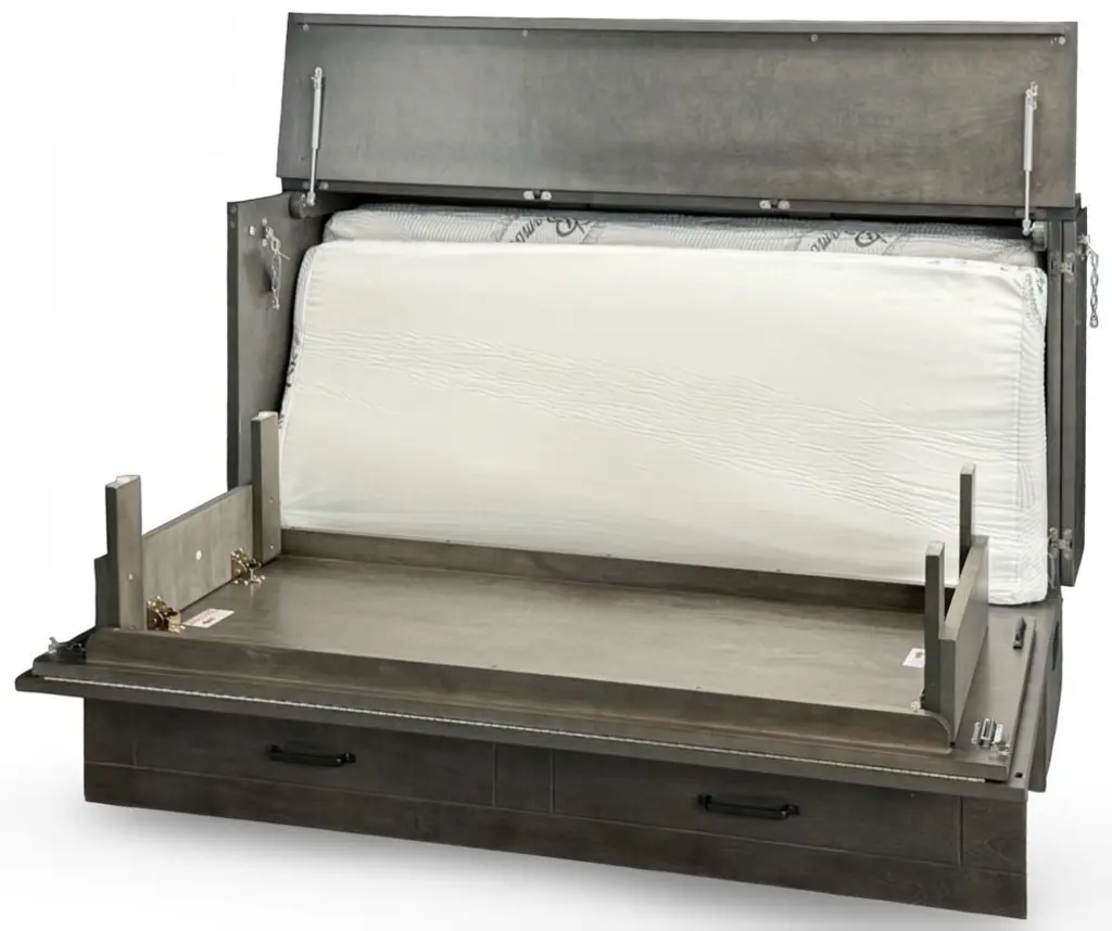 Birch Wood Studio Collection Queen Size Folding Murphy Cabinet Bed With Desk in Grey. The Studio Series is an all-new Cabinet Bed that has a multipurpose function, serving as a comfortable bed by night and a spacious desk by day. Whether you need a cozy retreat for guests or a productive workspace, this multifunctional piece of furniture has you covered. The Studio Series easily converts into a comfortable bed in 60 under seconds. It features stylized grooved panels, opening side panels and can support a 60" TV screen. Elite Studio Cabinet Bed with Desk features include: Folds open in about 60 seconds Functional desk space Higher Sleep Platform Built-in Dual Power/USB module Solid and Birch plywood construction No particle board or MDF. Tri-Fold Gel-Infused CertiPur-US Foam Queen Mattress Bed supports up to 500 lbs. 59" wide storage compartment Two color options Each CabinetBed is made with the highest quality Birch plywood. Unlike many competitors, our beds are built strictly with solid plywood and will never contain cost-cutting materials such as particle board and MDF, which both lack strength. You can be confident that the flexible polyurethane foam inside each CabinetBed meets CertiPUR-US® standards for content, emissions, and durability and has been analyzed by independent, accredited testing laboratories. Assembly required in room. No particle board. Manufacturer: Cabinet Beds Inc.