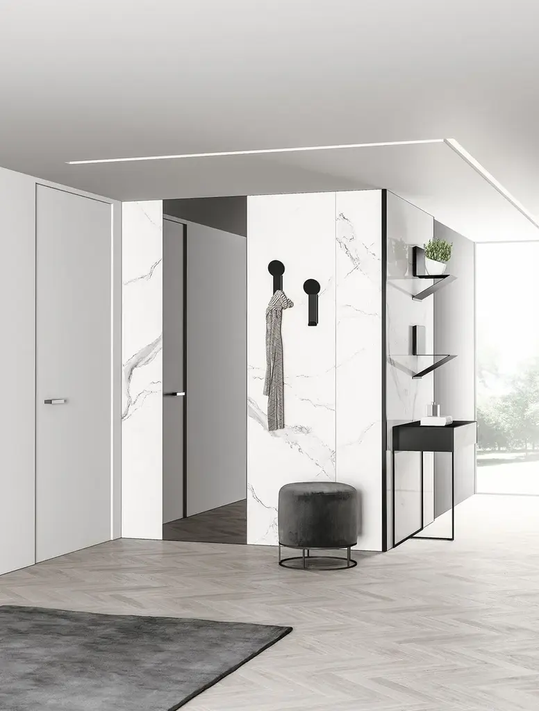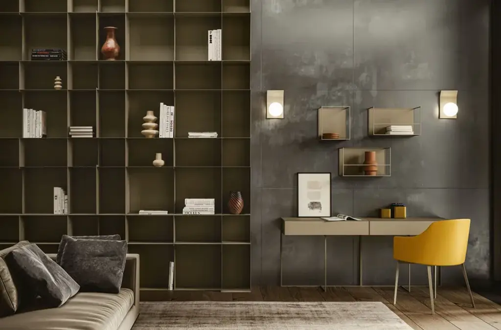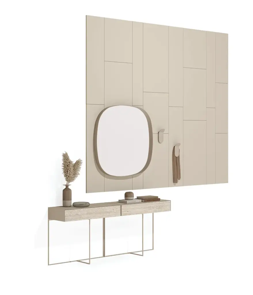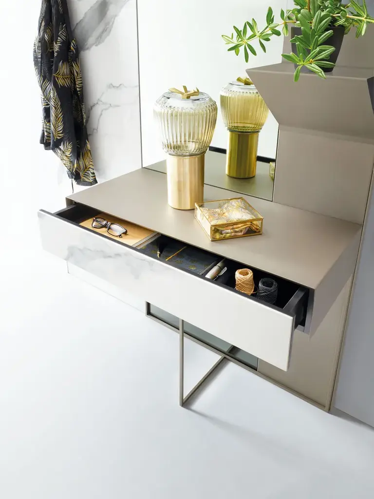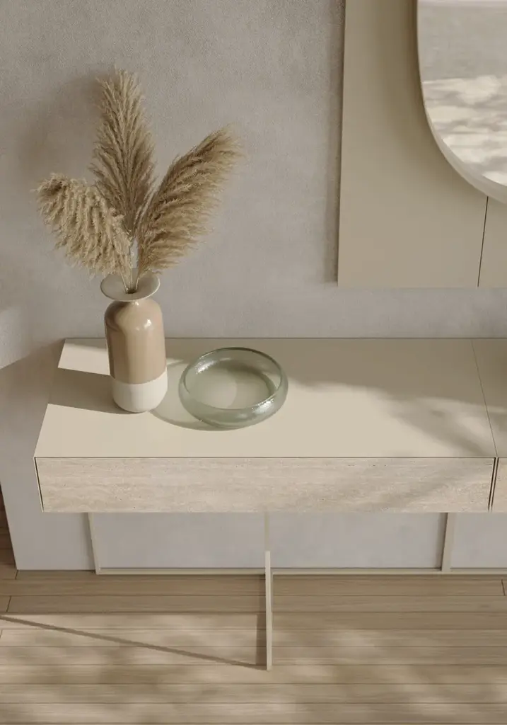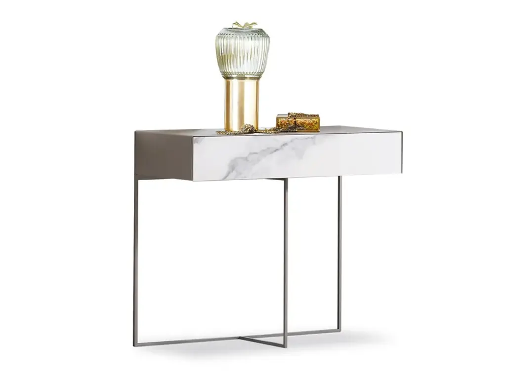 Birdie is a metal and ceramic console characterized by an essential design that makes it particularly light and suitable for any type of environment. Birdie is equipped with a drawer with a ceramic or metal front and rests on a thin metal frame made with a square section profile. In addition to the console version, with a central leg, Birdie is also available in a desk version with two thin side legs.Birdie can alternatively be fixed to the wall or, thanks to the proven magnetic system of Ronda Design, it can be fixed to the Caddy metal paneling, with which it merges into a continuum of modularity, materials and finishes, creating a functional wall with a strong aesthetic impact.