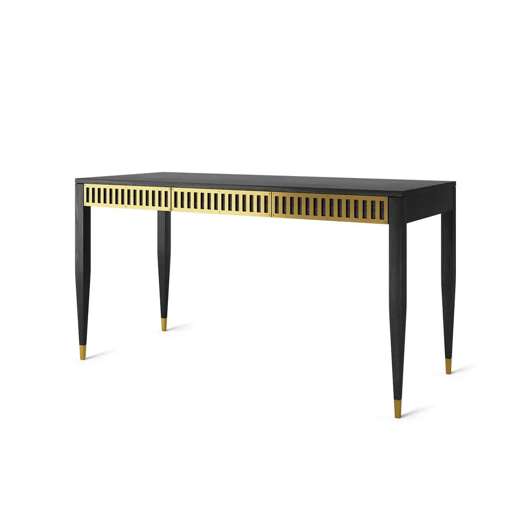 Black oak desk in mid-century style with three drawers with brass fronts. The tapered legs are finished with brass plated aluminum feet. Desk made of solid oak wood and wood covered with natural oak veneer. Other wood on request. Perfect as office desk, computer desk.Handmade in Poland.Materials:-drawer fronts: solid oak with brass plated aluminum-sides, dividers, back: solid oak-drawer body: solid oak-legs: solid oak-top: blockboard overlaid with oak veneer-handles: solid brass-feet: brass plated aluminum-matte black varnishDimensions:width: 140 cm (55,1")depth: 60 cm (23,6")height: 75 cm (29,5")Also available in 160cm x 70cm version.You can change the size, material, surface treatment after prior contact and setting prices.
