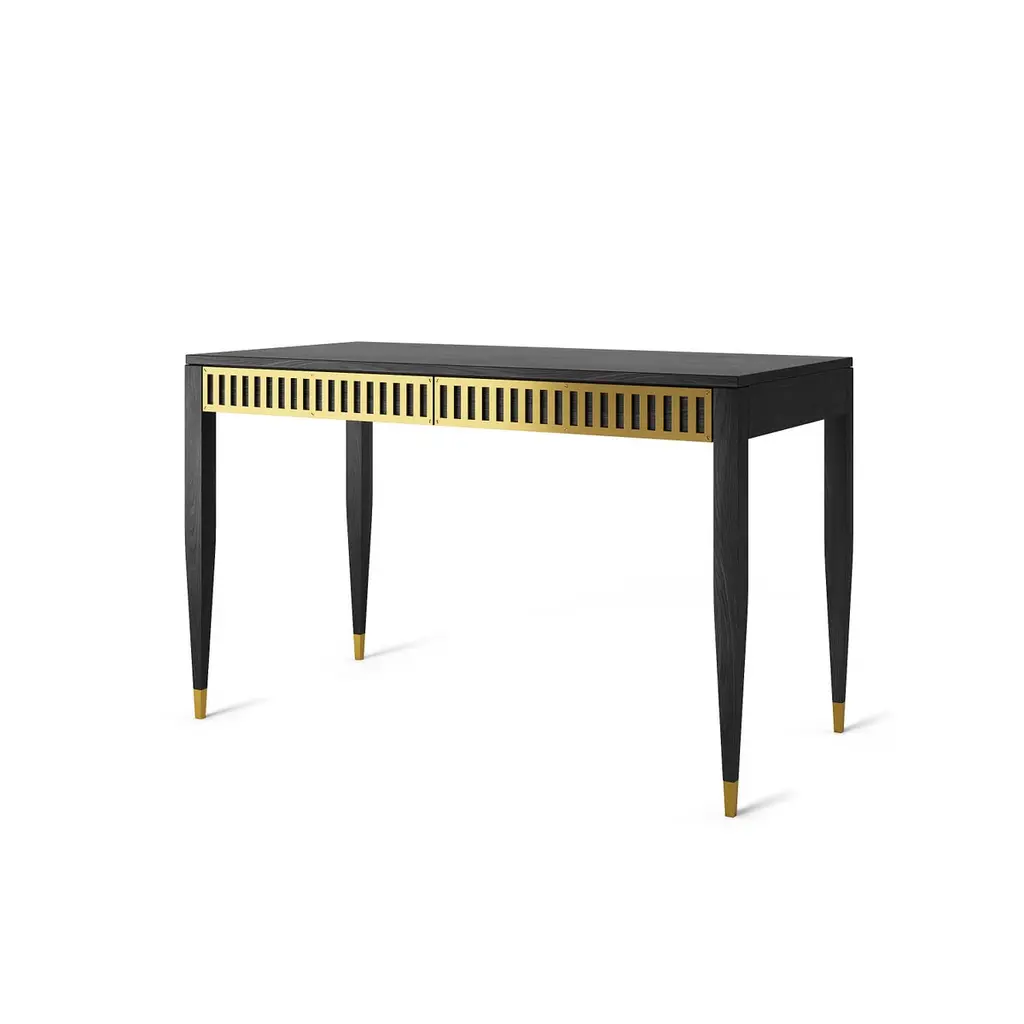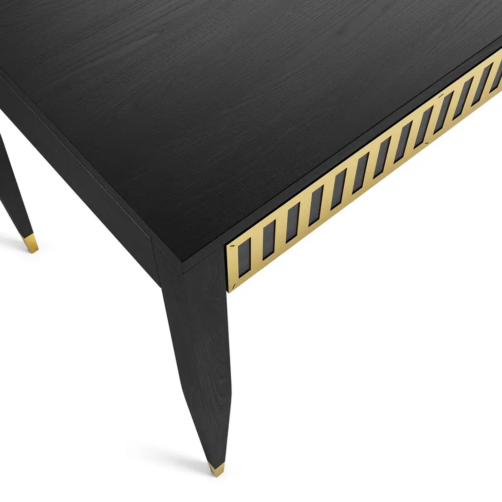 Black desk in mid-century style with two drawers with brass fronts. The tapered legs are finished with brass plated aluminum feet. Desk made of solid oak wood and wood covered with natural oak veneer. Other wood on request. Perfect as office desk, study desk, computer desk, writing desk, home office desk.Handmade in Poland.Materials:-drawer fronts: solid oak with brass plated aluminum-sides, dividers, back: solid oak-drawer body: solid oak-legs: solid oak-top: blockboard overlaid with oak veneer-handles: solid brass-feet: brass plated aluminum-black matte varnishDimensions:width: 120 cm (47,2")depth: 60 cm (23,6")height: 75 cm (29,5")You can change the size, material, surface treatment after prior contact and setting prices.