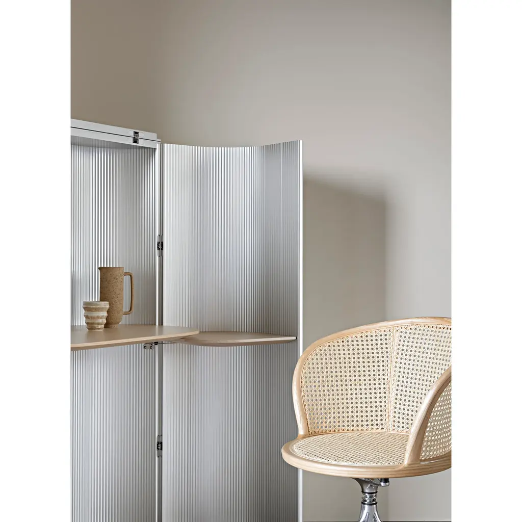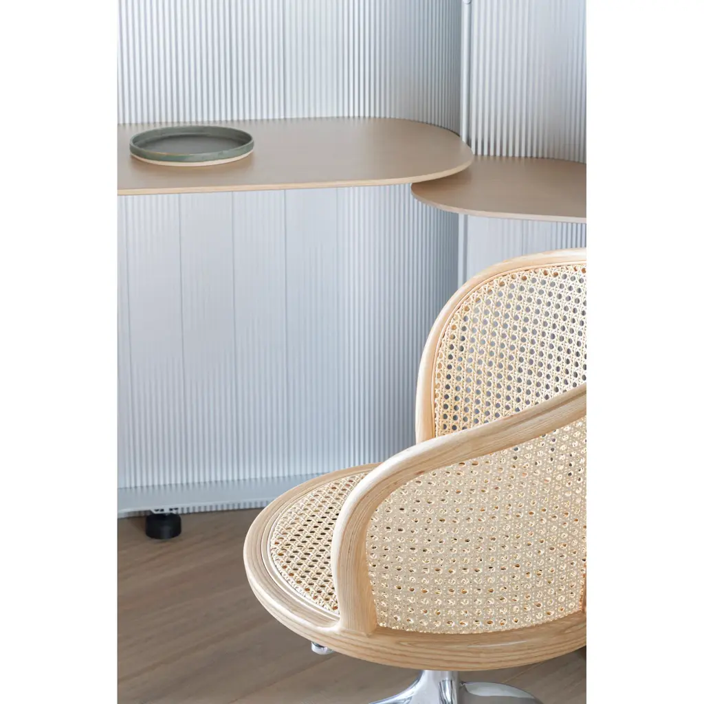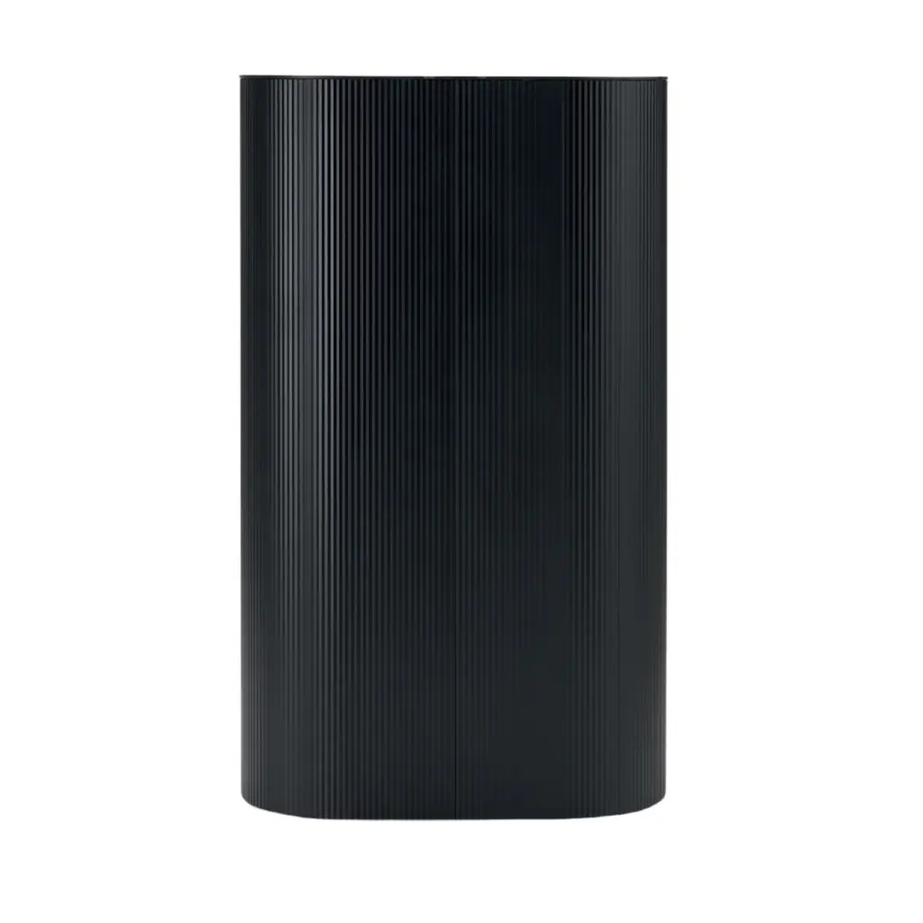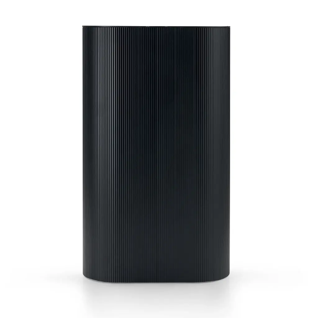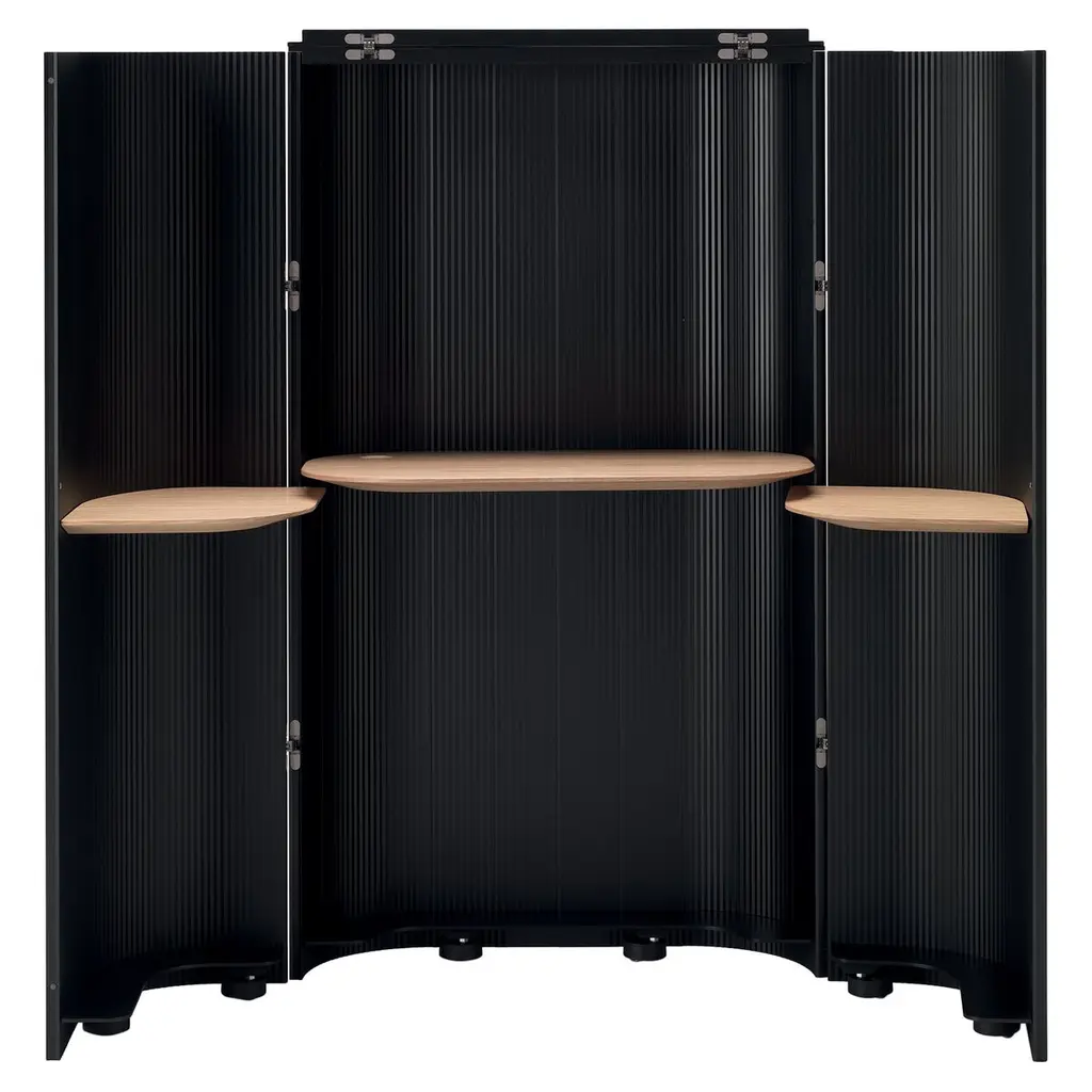 Introducing the Black Oak Veneered Desk, Alias Layout. A sophisticated addition to your workspace, this secretaire desk features a lacquered aluminum structure and MDF oak veneer tops. The lid is also made of lacquered MDF, creating a luxurious and refined design. Easily move this desk on castors for ultimate convenience. Elevate your office with this exclusive piece.