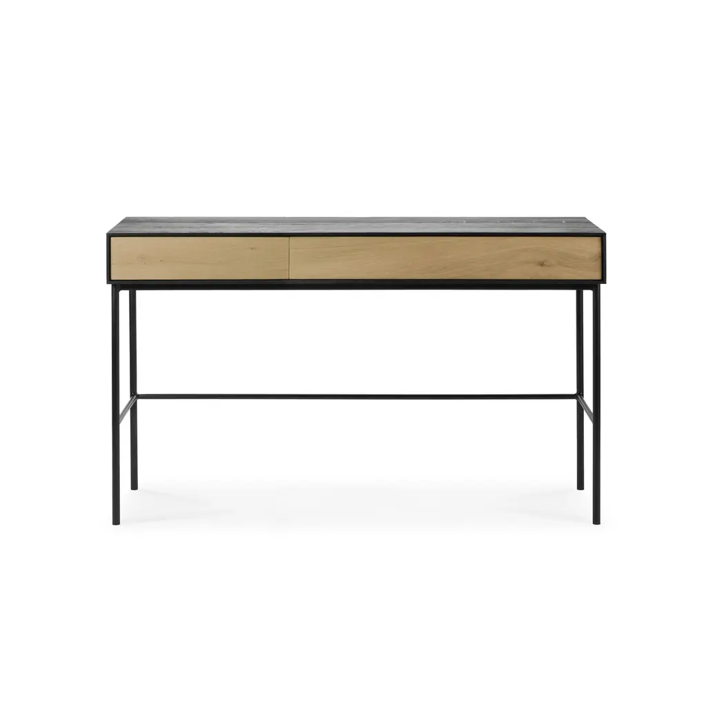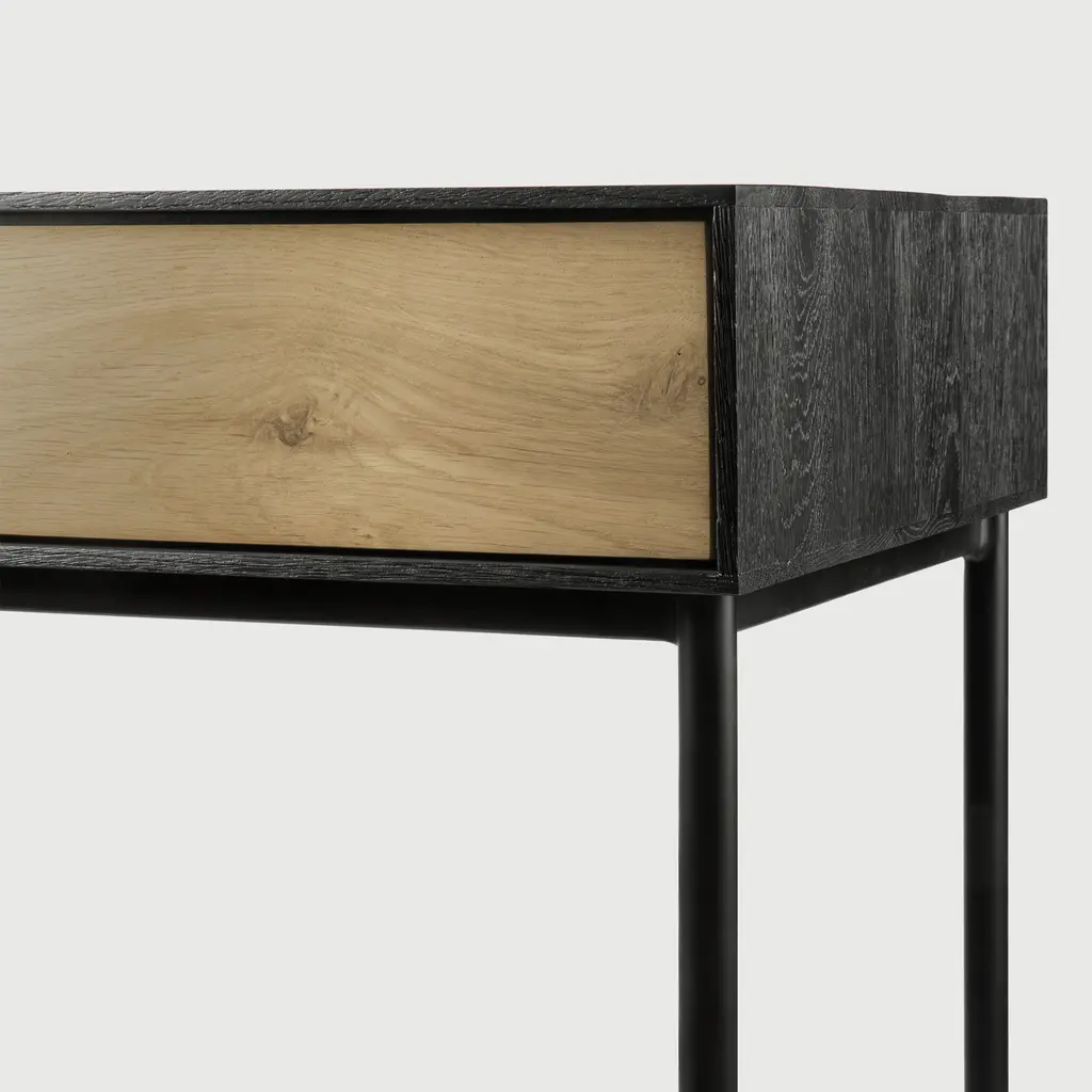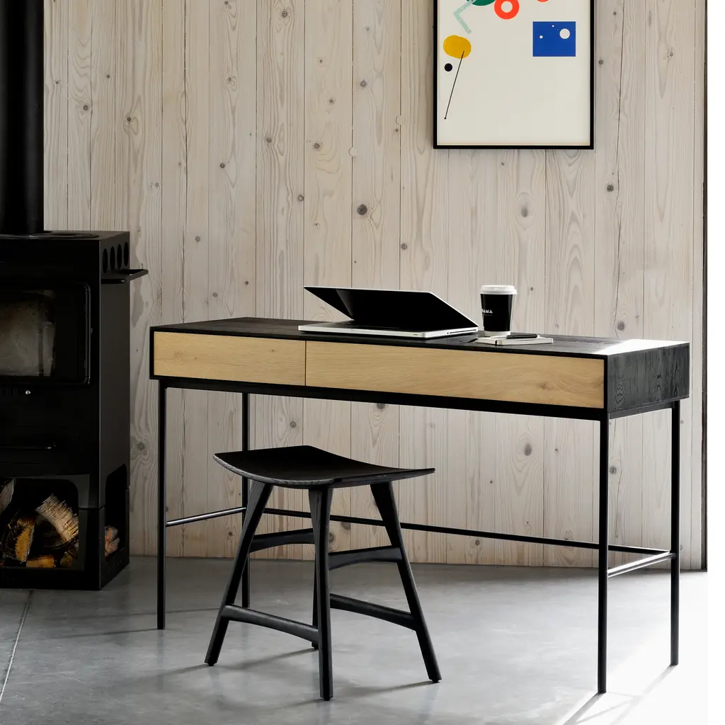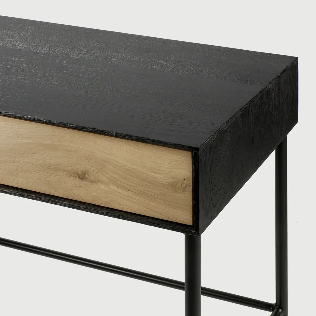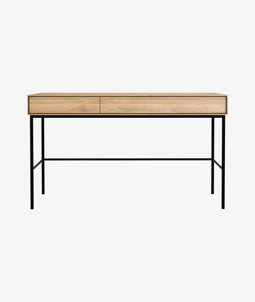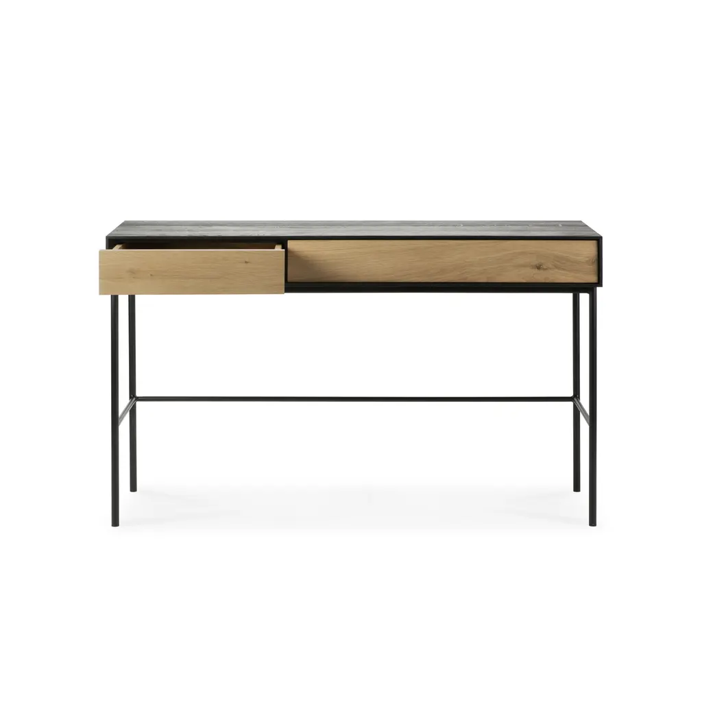 Transform your home office into the perfect workspace with the Ethnicraft Blackbird Desk. An elegant take on the essential piece of office furniture, one that often disappears into the background, this desk strikes a refined pose with slim metal legs and a slender wood top. Apart from the poetry of the opposing materials, this modern desk also pairs light and dark hues with great visual effect. The top has an elongated shape to maximize the working area, allowing you to use the surface for a laptop, decorative items, and lighting – with space to spare. Two push open drawers offer extra room for accessories and stationery. A stylish design, the Ethnicraft Blackbird Desk features a natural oak color on the drawers and a black paint finish on the top and sides, with the metal legs finished in matching black.