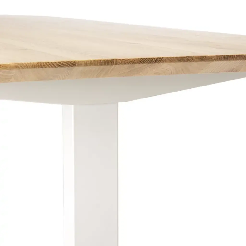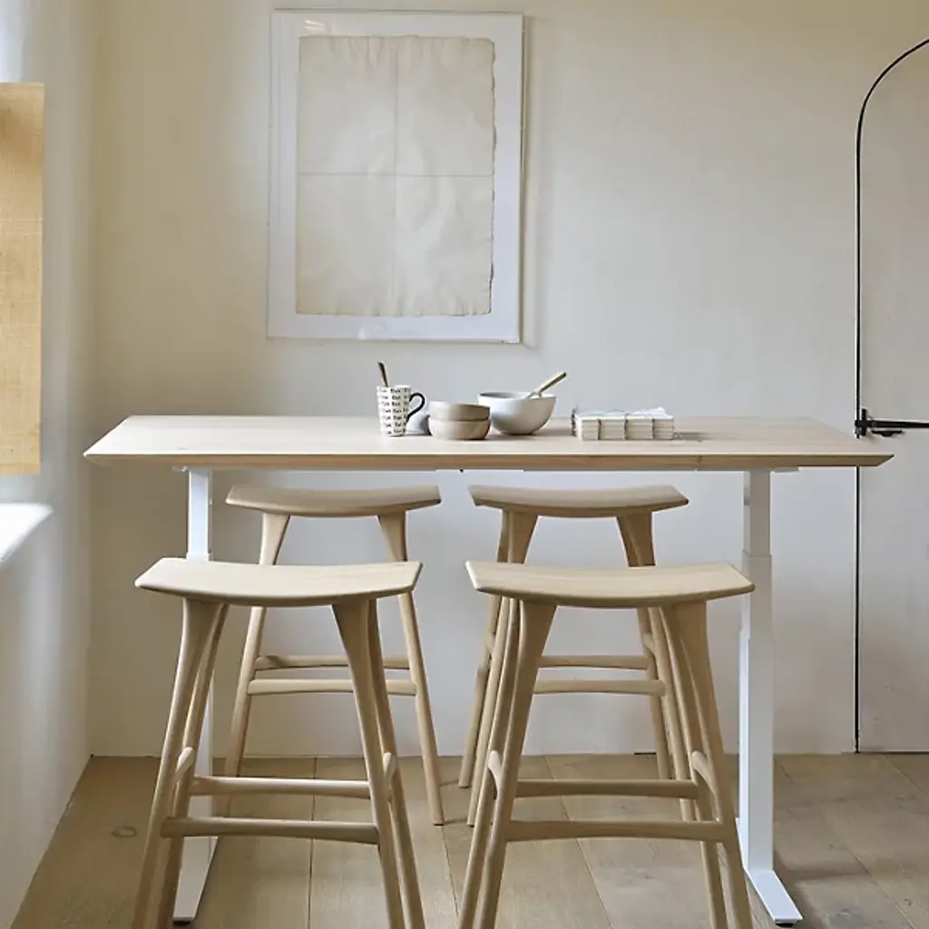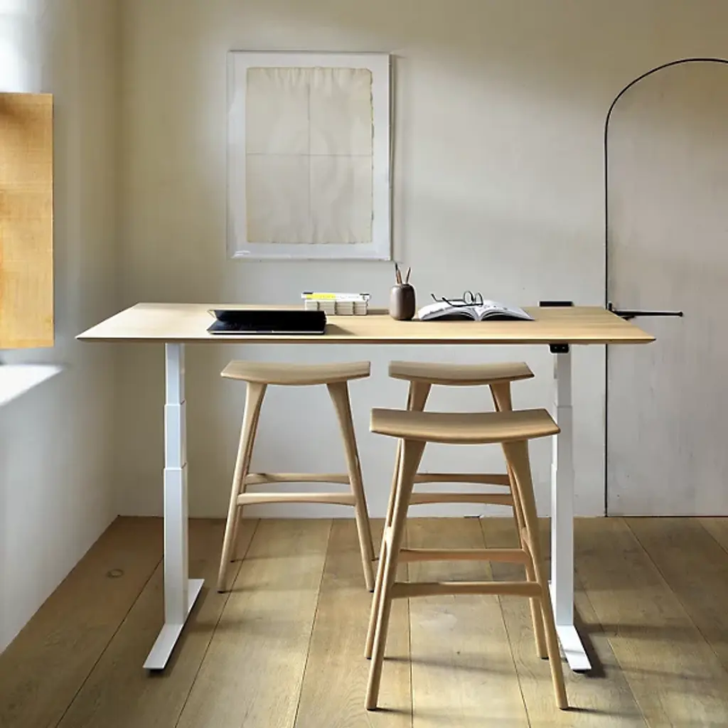 Enhance workspaces with the opportunity for better health and posture with the Bok Adjustable Desk from Ethnicraft. A stark, soothing design from the mind of Alain van Havre, it rises from two flat legs on motorized pillars, the stainless steel construction offering strength and style, with ample floor protection set below. The bevel-edged single plank desktop is made from oak, the flaring sides adding a touch of artisanal accent to its surroundings