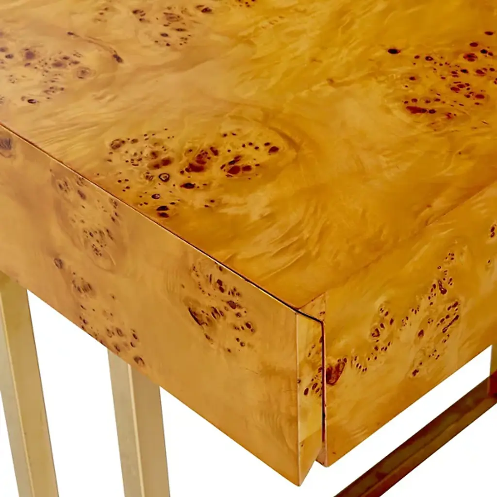 Simple and striking, the Bond Executive Desk from Jonathan Adler instantly uplifts the décor with a clean and appealing silhouette. Made of natural mappa wood, the thick slab surface features a set of three finished drawers on one side and a single drawer for a partner on the opposite side. Large and thick legs shaped into open rectangles from polished metal uphold the wood, beautifully complementing it as it rests in the room.
