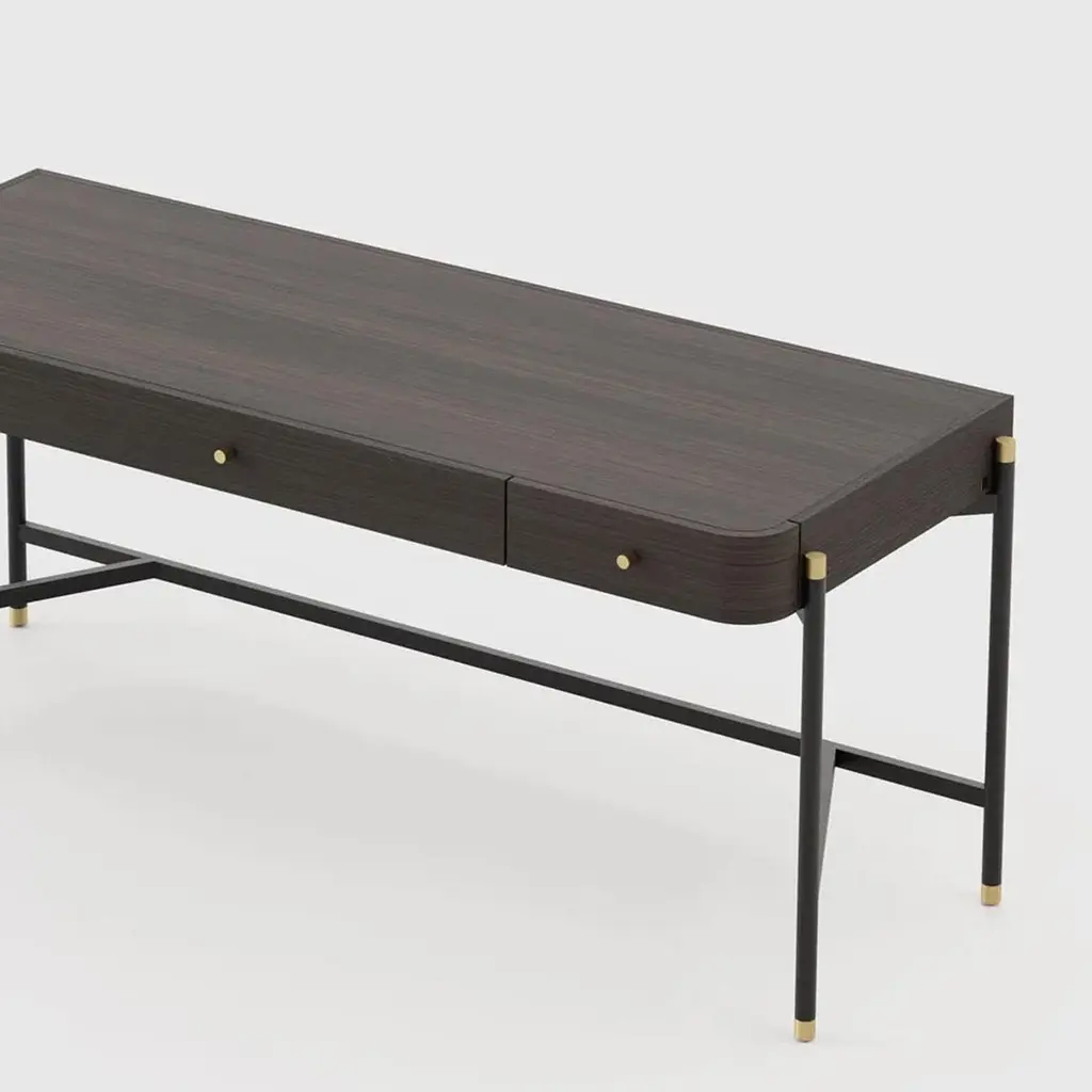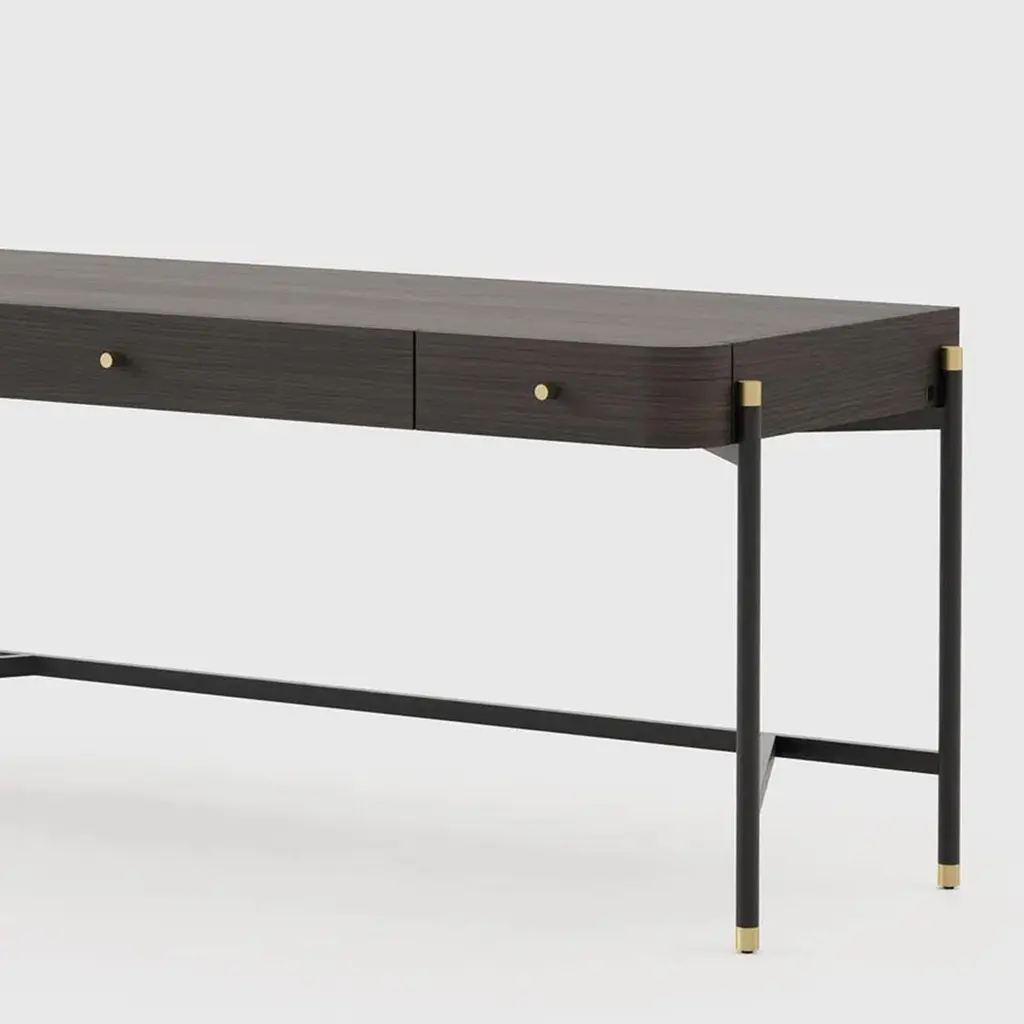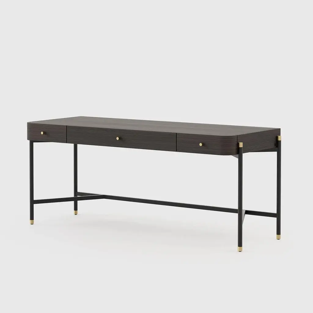 Desk bount with structure in oak in smocked oakmatte finish with blackened iron feet and base,endfeet in polished stainless steel in gold finish. With others polished stainless steel details in gold finish.Also available with a leather desk blotter on requestand also available with other wood finishes on request.