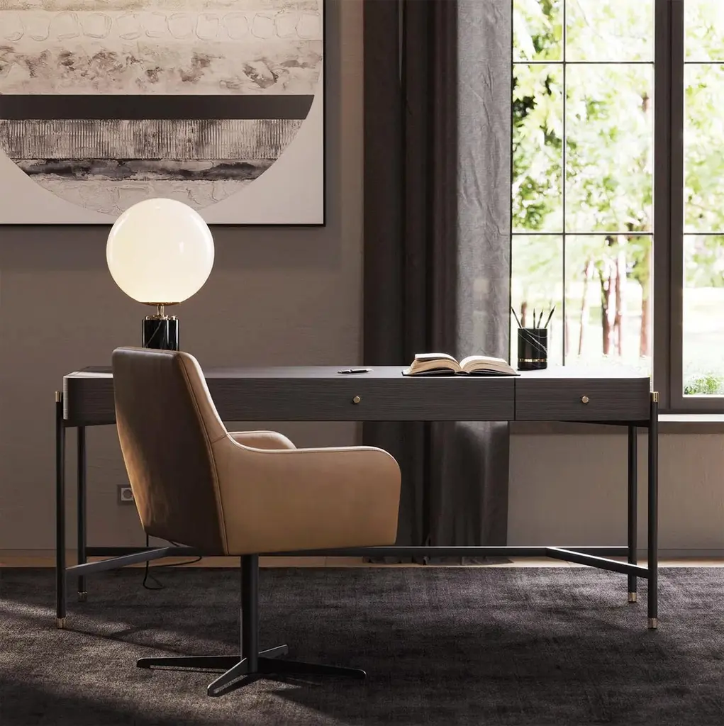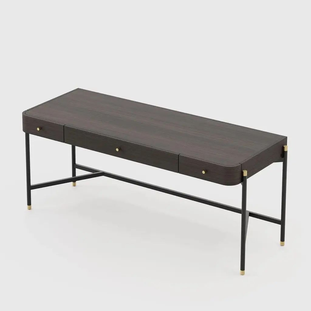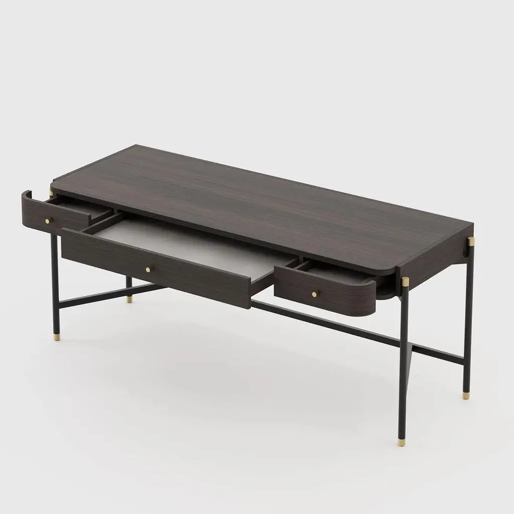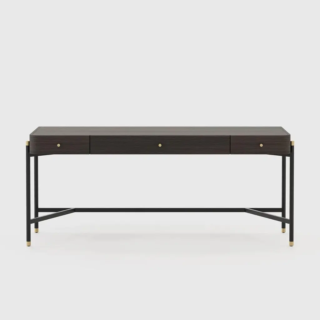 Desk bount with structure in oak in smocked oakmatte finish with blackened iron feet and base,endfeet in polished stainless steel in gold finish. With others polished stainless steel details in gold finish.Also available with a leather desk blotter on requestand also available with other wood finishes on request.