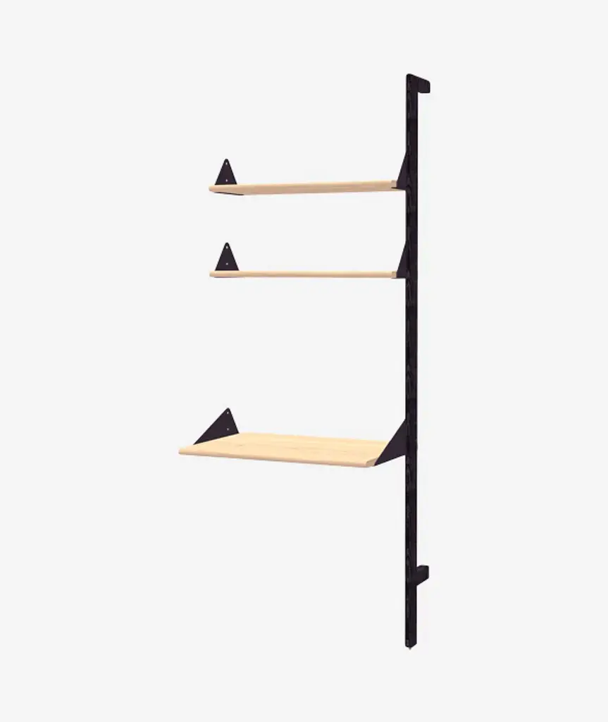 The Branch Shelving System blends mid-century style with modular components that give you an infinite number of elegant, open-storage options for home or office. The design features varying bookshelf configurations that can be transformed into a seamless workspace with the addition of a desk unit. Additional add-on units let you customize the size and layout of your shelving system to perfectly suit your space, and the shelves are height adjustable to suit any arrangement of decorative items or resources. Refined details, such as rounded edges on the shelves and uprights, soften Branch’s aesthetic and enhance its architectural style. Straightforward installation means you can spend more time perfecting your vision and display.  *Includes: 1 Branch Upright, 1 Desk Shelf and 2 Shelves. Additional Add-Ons may be purchased here to customize the configuration.