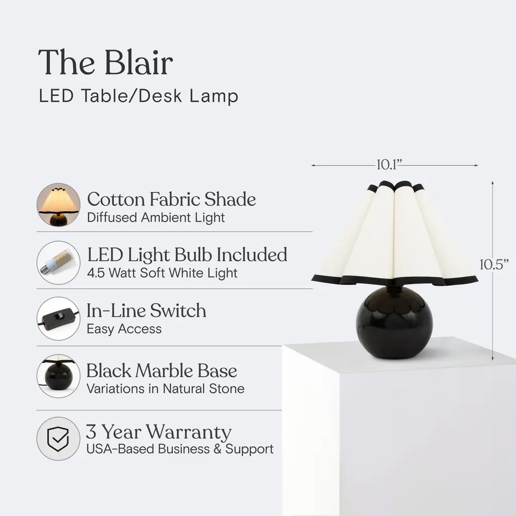 Introducing the Blair Table Lamp from Brightech, a masterpiece that brings a harmonious blend of traditional charm and modern sleekness to your decor. Perched atop a lustrous black marble base, its unique ivory shade—outlined with a touch of black—casts a warm, inviting glow. Engineered for both functionality and style, this lamp illuminates your space with a 2700K warm white light, perfect for creating a cozy corner in your living room or a tranquil retreat in your bedroom. The 4.5W bulb enclosed within offers a soft luminosity of 500 lumens, controlled effortlessly by an in-line switch on a chic, black, fabric-covered cord. Crafted from quality materials, the Blair promises durability and aesthetic grace. It stands as a testament to Brightech's commitment to innovative design and dependability, all backed by a reassuring 3-year warranty. The Blair is not just a source of light, it's a statement piece that enriches your space with a serene ambiance and timeless sophistication.