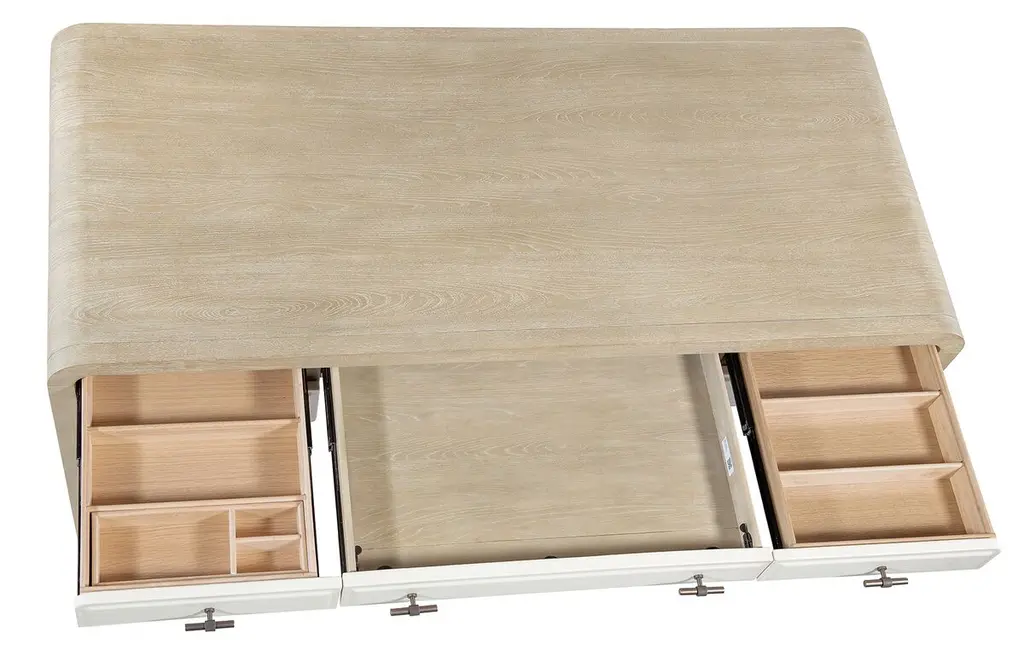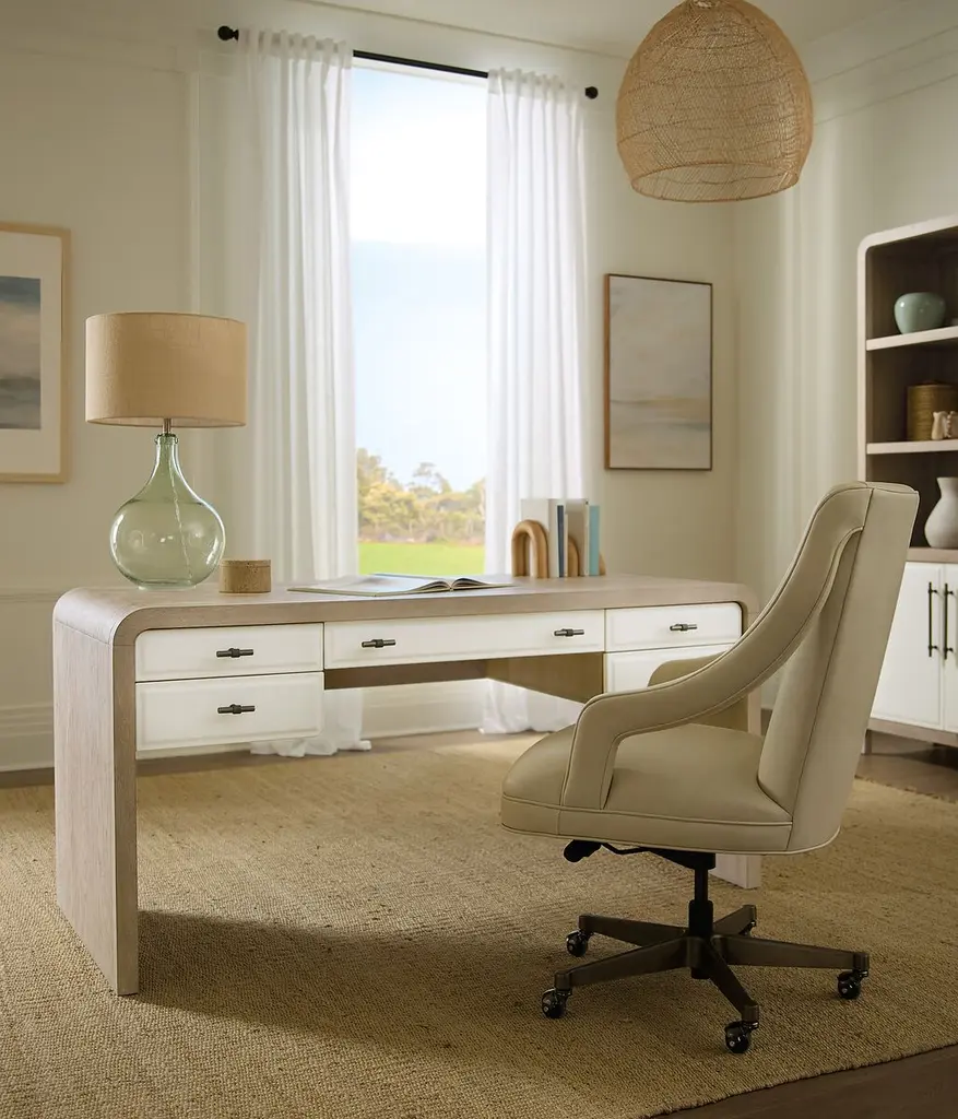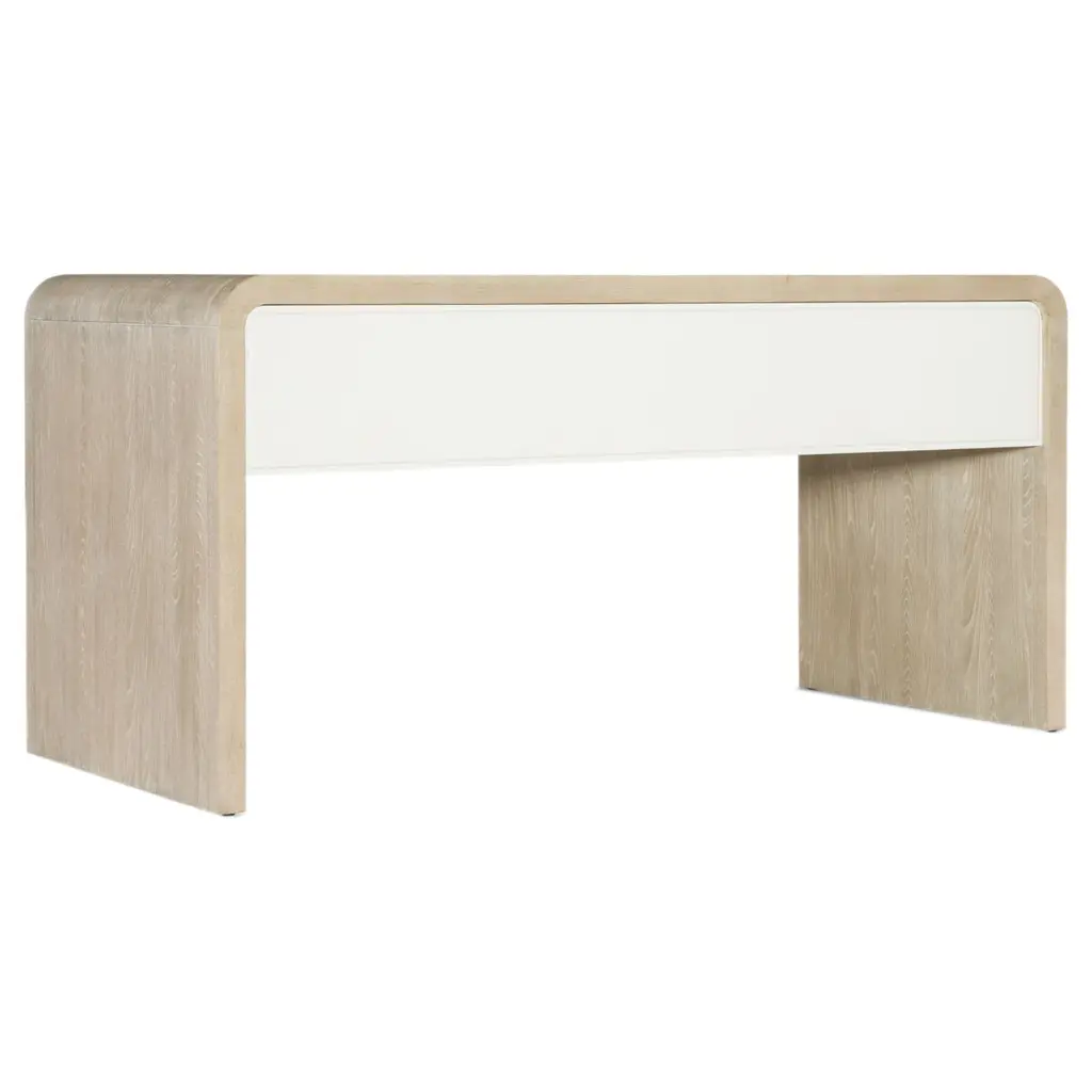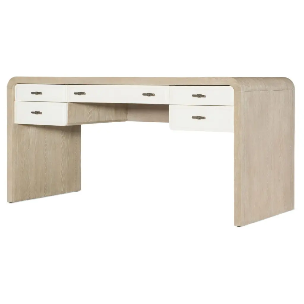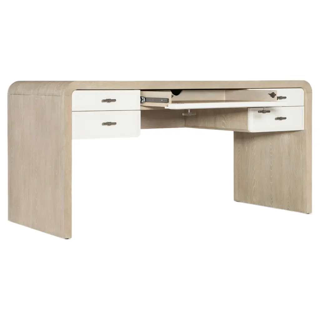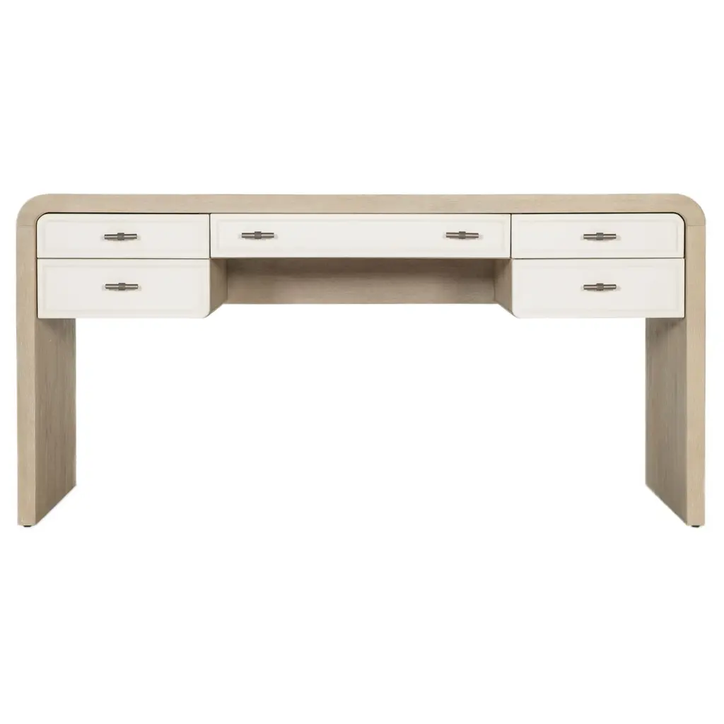 Elevate your home office with the Writing Desk, a contemporary piece that combines functionality and style. The desk features a two-tone design with contrasting drawer fronts. With five drawers, including a drop-front keyboard drawer and dividers for organization, it’s perfect for maintaining a tidy and productive workspace. Its elegant, curved design and durable construction make it a stunning centerpiece in any office setting.