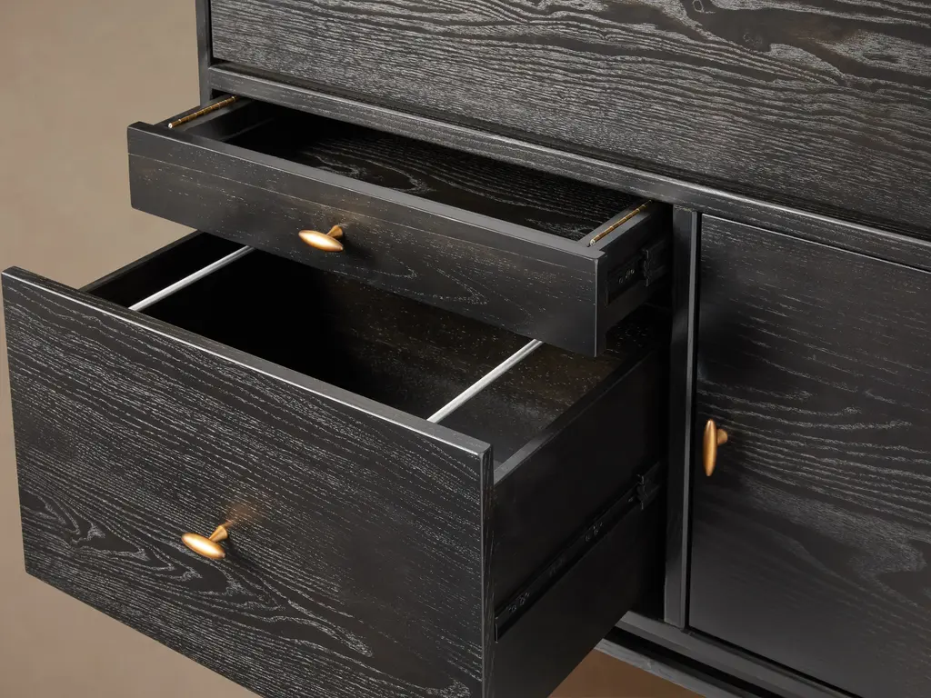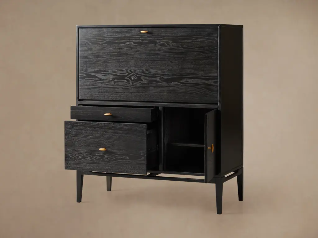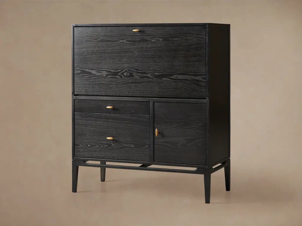 A modern classic, our Brock Hideaway Desk’s understated aesthetic features elegant lines, a deep, hand-stained finish, and a flip-down door that opens to reveal a spacious workspace. Brock’s leather writing surface and subtle, burnished brass hardware elevate its midcentury style, complementing natural ash wood with sophisticated detailing.