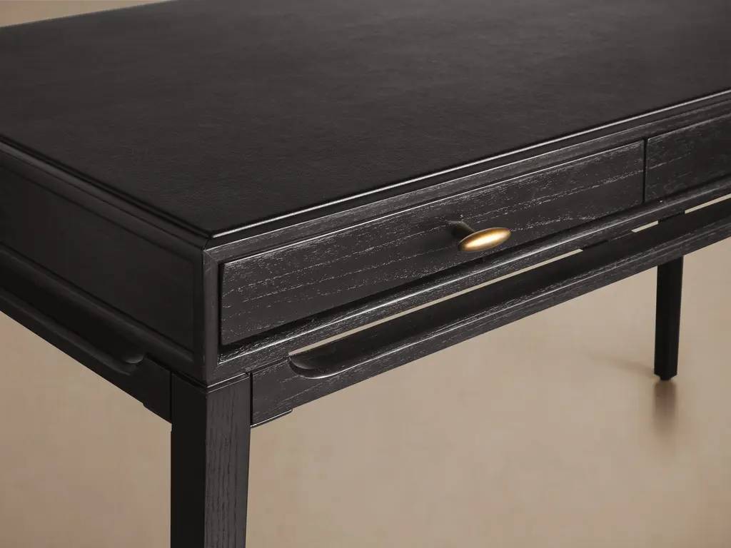 A modern classic, our Brock Writing Desk’s understated aesthetic features sleek lines and a deep, hand-stained finish. Brock’s leather writing surface and subtle, burnished brass hardware elevates the midcentury style by complementing natural ash wood with sophisticated detailing.