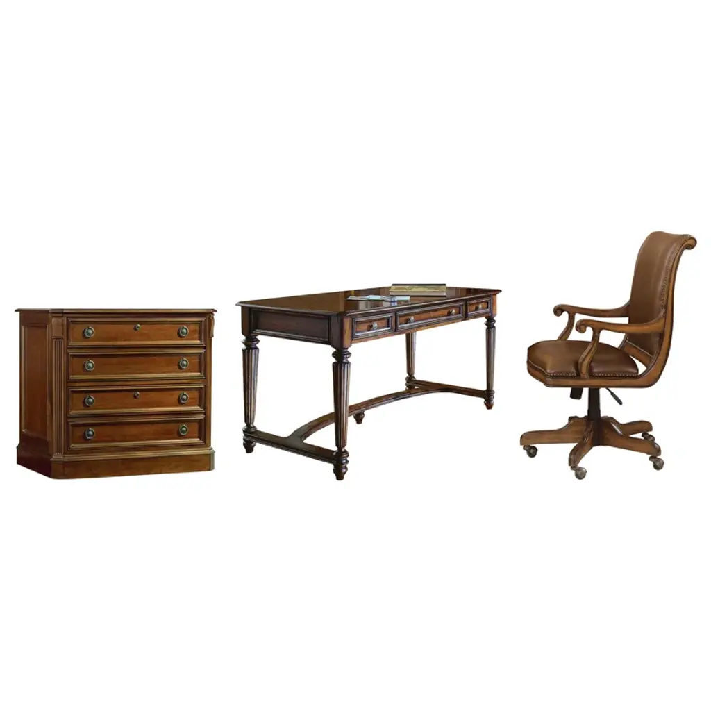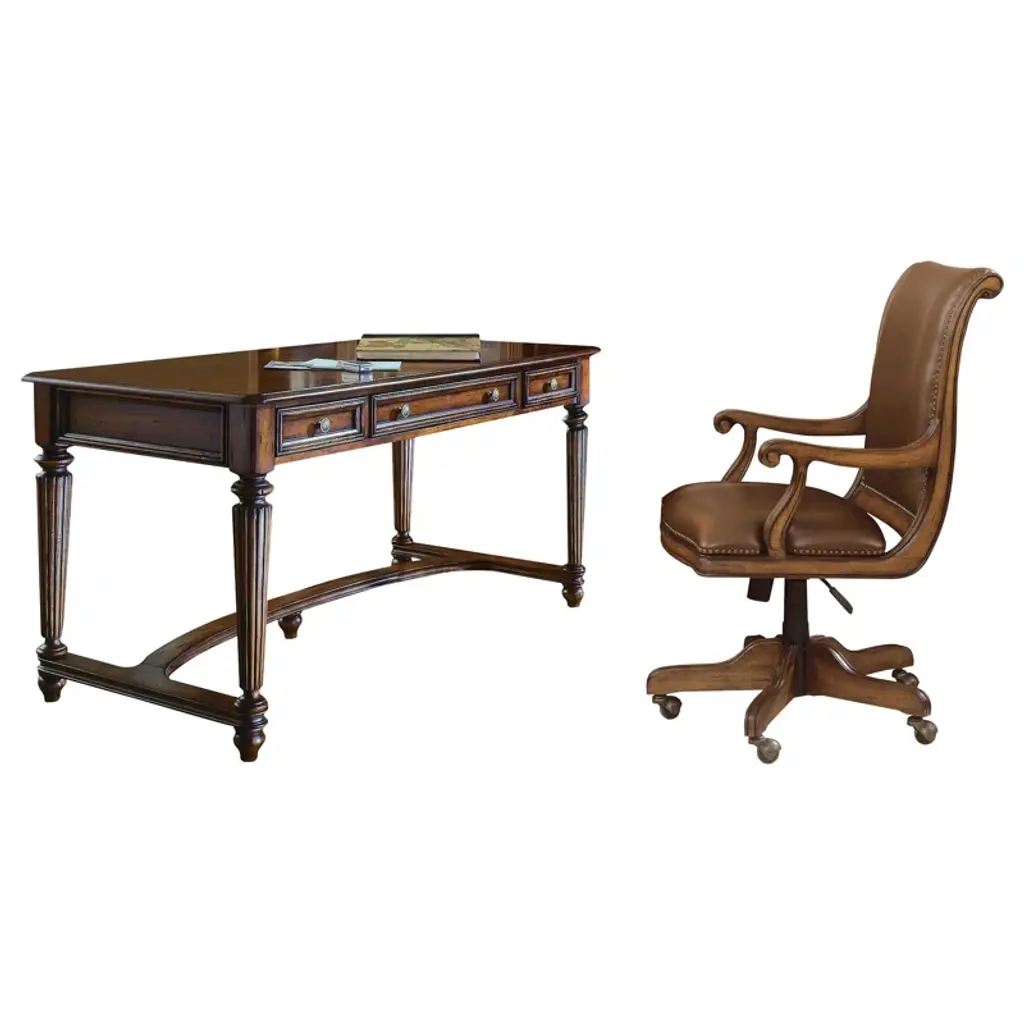 Vintage and versatile, the Brookhaven Leg Desk is perfect to tuck behind a sofa, in a kitchen, extra room, or office as a work-at-home solution. With timeless Americana style details like a distressed medium clear cherry finish over hardwood solids and cherry veneers, fluted legs, and a curved stretcher, the Brookhaven Leg Desk says you’ve arrived. The center drawer has a drop-front for use with a keyboard, 2 utility drawers, and an FC620 power outlet with phone and data ports. The Brookhaven collection is crafted from hardwood solids with cherry veneers. It features a distressed medium clear cherry finish.