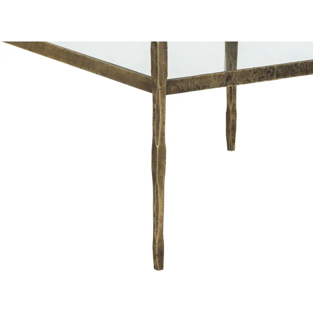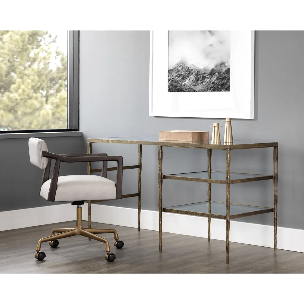 This incredible piece from our Muze collection will bring excitement to any workspace. Inspired by global travels, this desk features a unique hand-hammered steel frame with an antique brass finish. A clear glass top and two shelves provide ample storage. Made in India: With refined craftsmanship, this design was brought to life by skilled local artisans. By nature, these materials develop unique imperfections such as fissures, markings and colour variations for a truly one-of-a-kind piece.