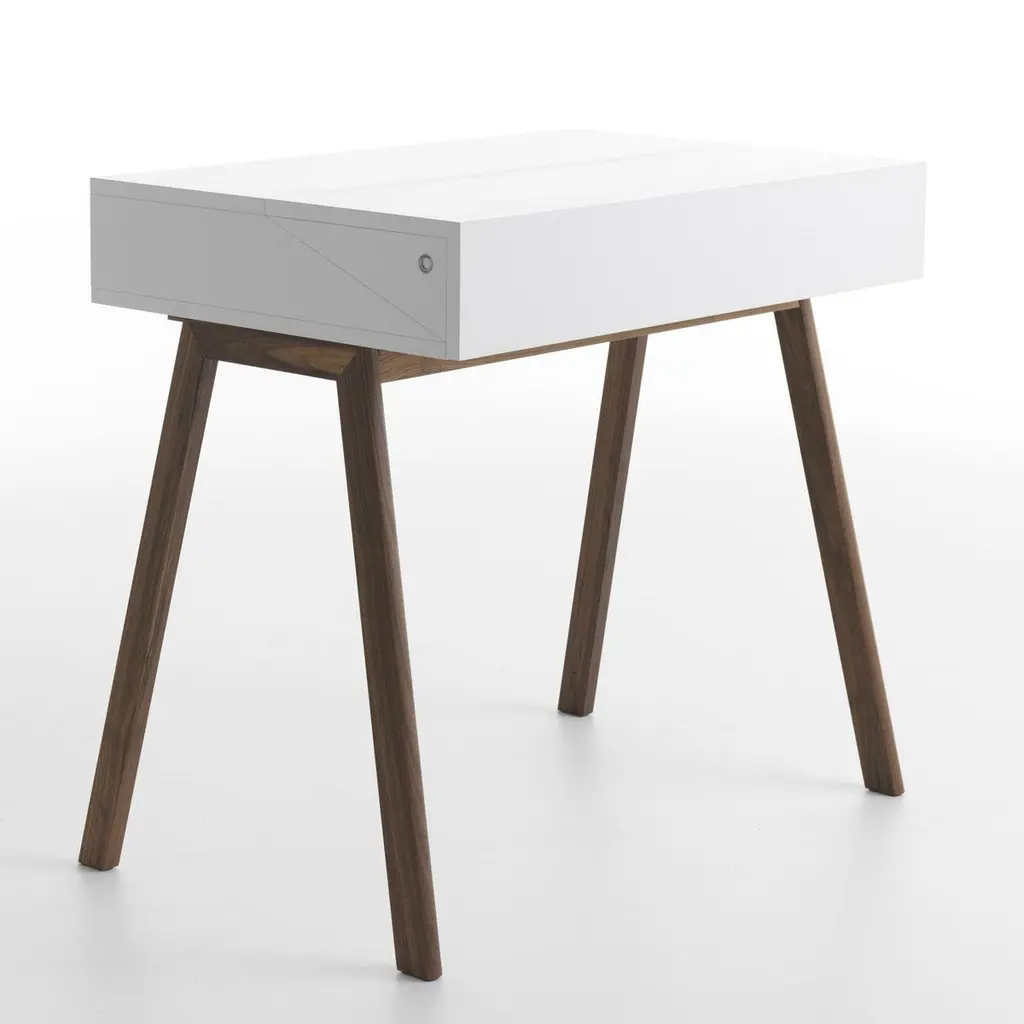 This modern piece of functional decor designed by Esa Vesman boasts a clean, elegant allure. Versatile and innovative, it stands on Canaletto walnut wood with a white-lacquer finish and features a hutch in MDF that flips open revealing a functional storage space equipped with LED light and cable hole.