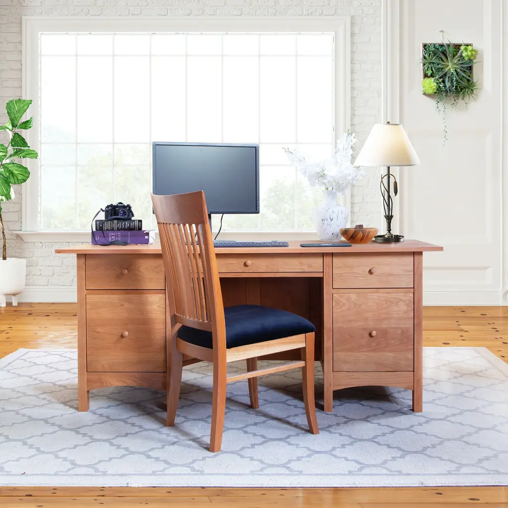 A high-end handmade Shaker Style Executive Desk. This fine luxury furniture is crafted using premium solid wood and is designed and built to last a lifetime. A solid wood Burlington Shaker Style Executive Desk will impress clients and friends who visit your home or office. Organize everything at your fingertips in its two accessory drawers and 2 file drawers (standard or legal size). This solidly built Shaker desk is handcrafted to order in Vermont in your choice of solid cherry, maple, or walnut woods with a natural, eco-friendly oil finish that not only protects, but enhances the natural beauty of the wood. A high-quality desk that will be enjoyed for generations.Base price represents desk with pencil drawer in natural cherryShown in natural cherry with pencil drawerMatching furniture available in our Burlington Shaker Furniture Collection Note: File drawers hold both letter size and legal size documents. Standard letter size documents are configured front to back with one row for filing per drawer. Legal size documents are filed left to right with one row per drawer. An aluminum bar and clips are included with all units to accept both legal and letter size files