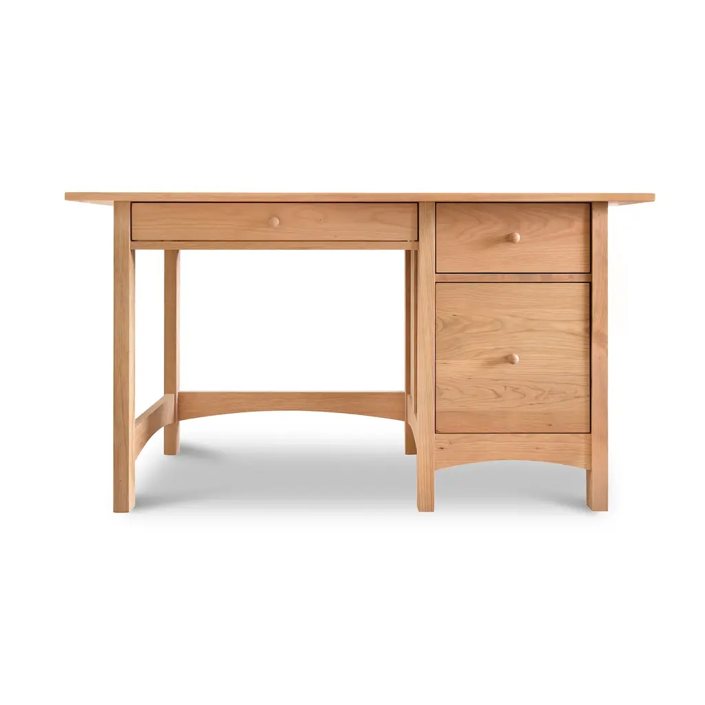 This solid wood high-end Burlington Shaker Study Desk is the perfect size for a small den or study. Organize everything at your fingertips in this natural, solid wood desk. One pencil drawer plus built-in drawer and file cabinet provide neat, clean storage for all your office necessities. All our Burlington Shaker desks are handcrafted to order in Vermont in your choice of solid cherry, maple, or walnut woods with a natural eco-friendly finish that not only protects but enhances the natural beauty of the wood. Simply beautiful with traditional craftsmanship means this desk will never go out of style and last for generations of use.Base price represents desk in natural cherryShown in natural cherry wood with pencil drawer utility drawers on rightMatching furniture available in our Burlington Shaker Furniture Collection Note: File drawer holds both letter size and legal size documents. Standard letter size documents are configured front to back with one row for filing per drawer. Legal size documents are filed left to right with one row per drawer.An aluminum bar and clips are included with all units to accept both legal and letter size files.