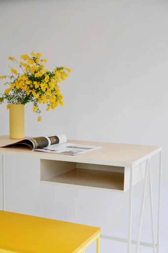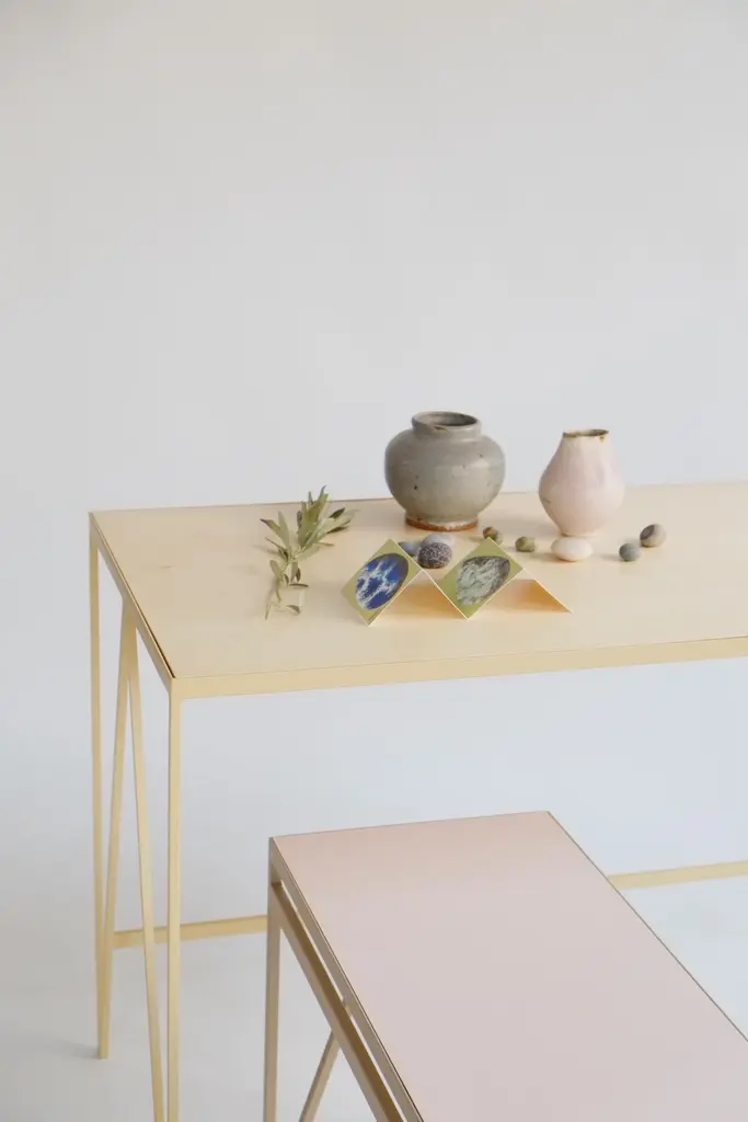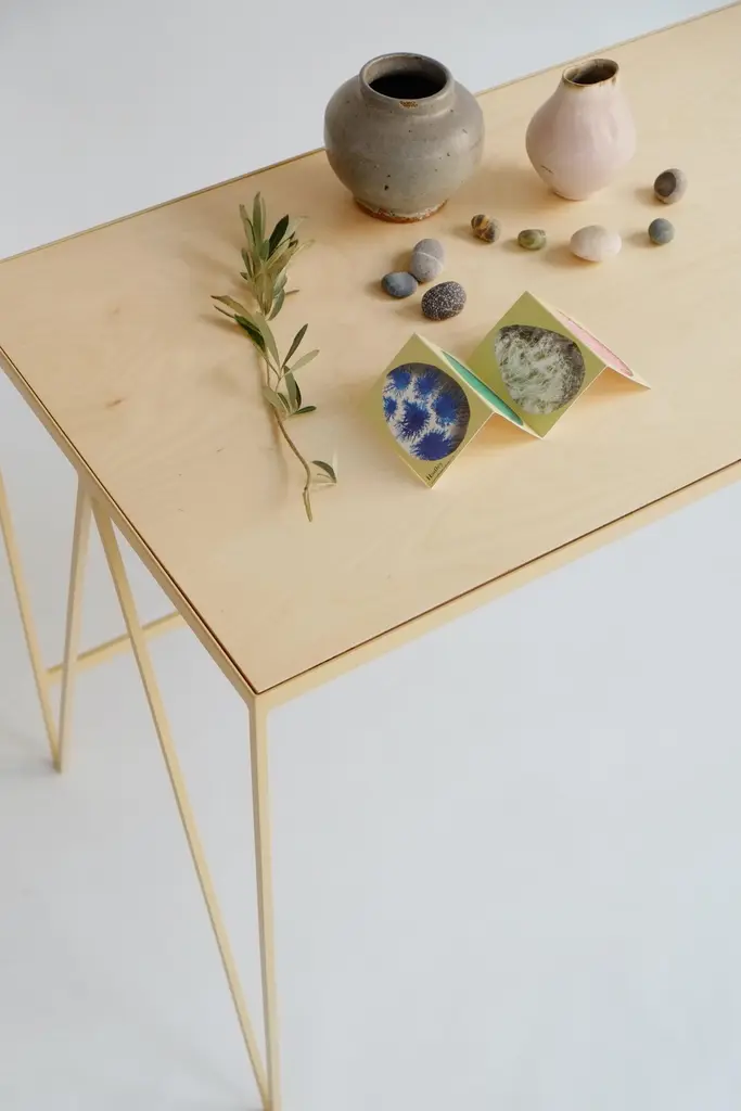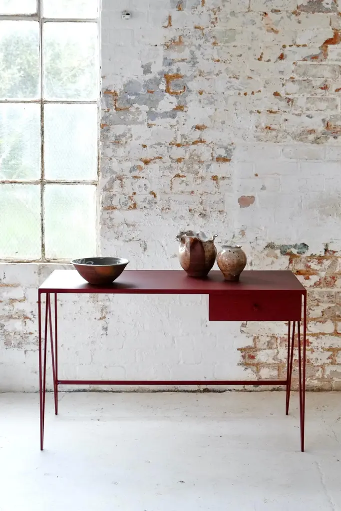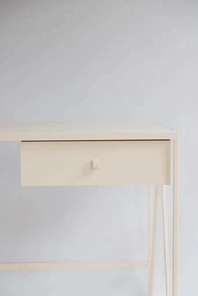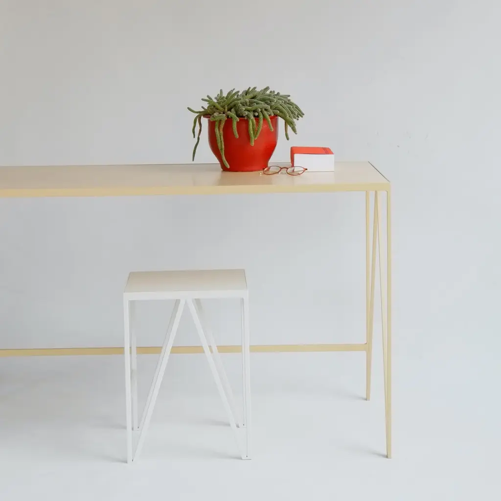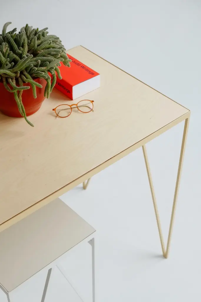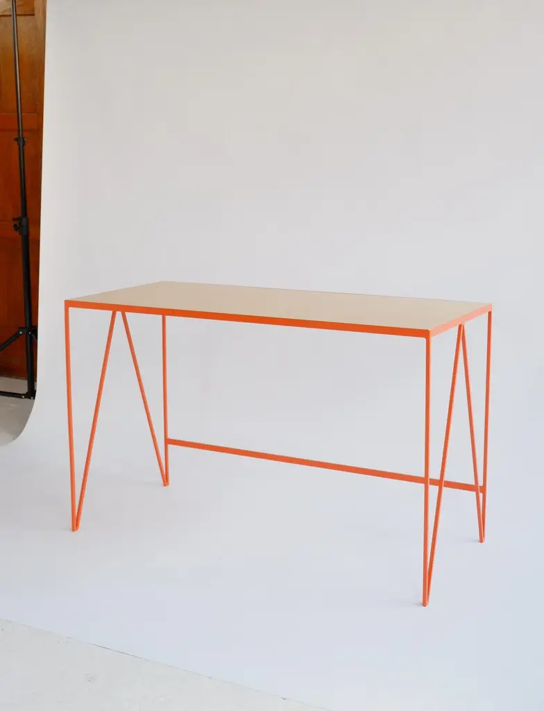 The study desk is made with a butternut powder-coated steel frame and a lacquered birch plywood tabletop. The combination of the natural wood table top and powder coated steel frame has a beautifully warm finish. This compact desk has been designed to be a minimal airy piece for a home study or office which looks great against both period details and in modern surroundings. Available with or without a drawer or shelf underneath the tabletop. Each table is handmade to order and made to last in quality materials. Colour samples available to order from our storefront - LU2894331610202 We can make our desks to any bespoke size.All &New products are manufactured in Britain. The result is a collection of furniture that celebrates the handmade qualities that make objects beautiful.The desk measures: 115 cm long x 52 cm deep x 72 cm high.Mirka & Jo&New - Modern British Furniture.Study desk/ Community registered design number: 002391839-0001.