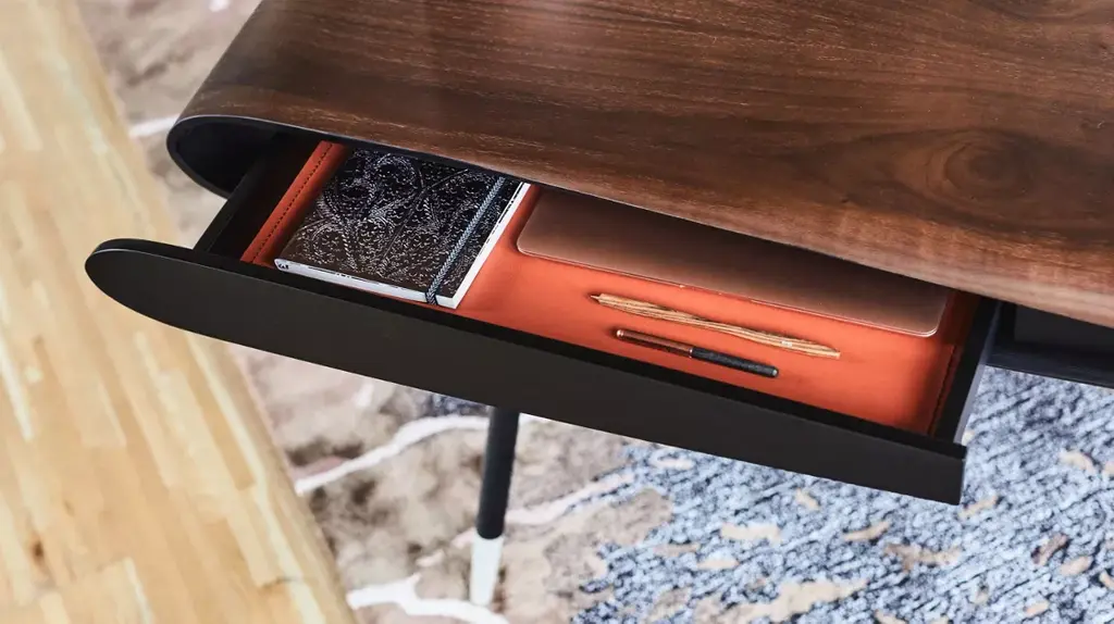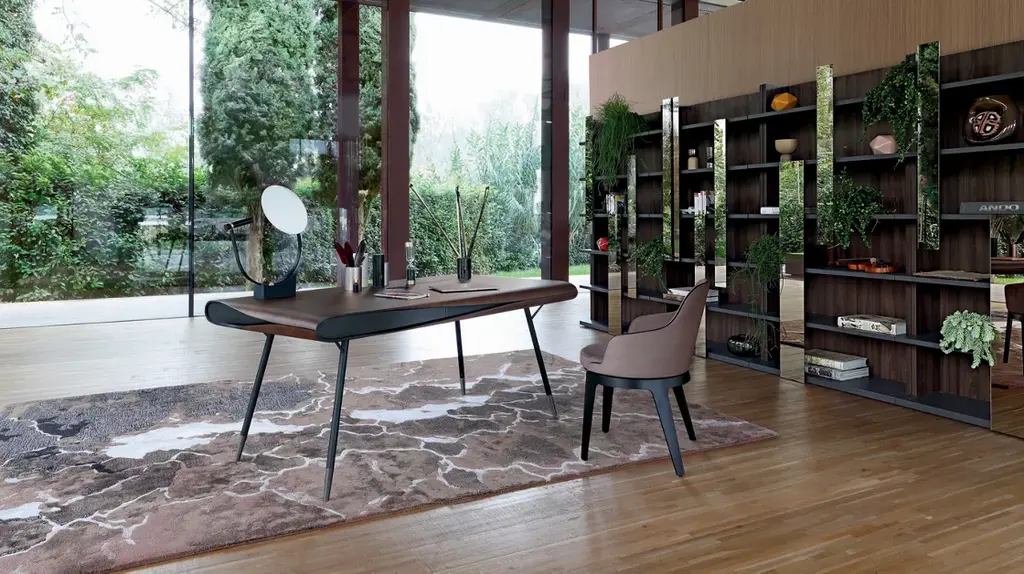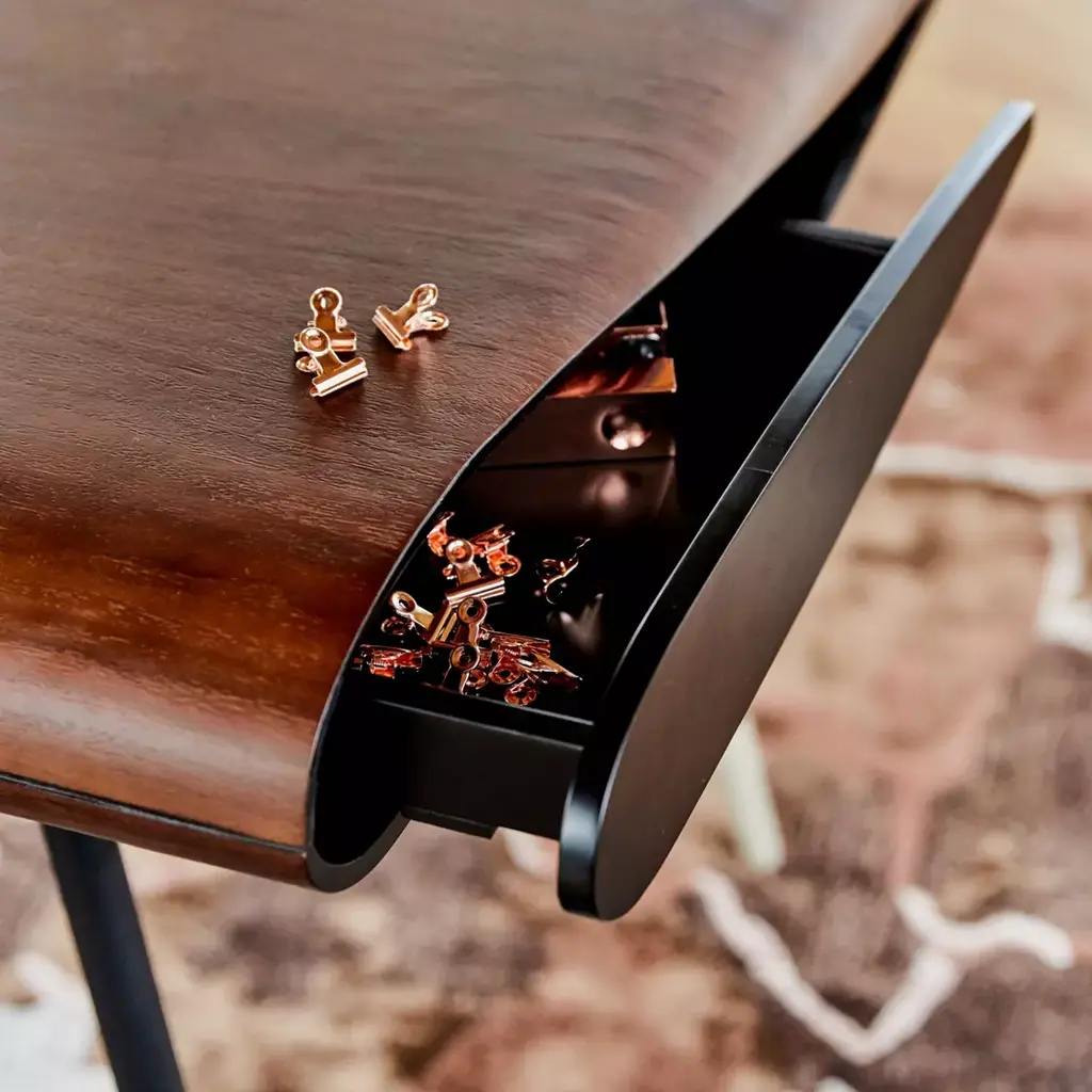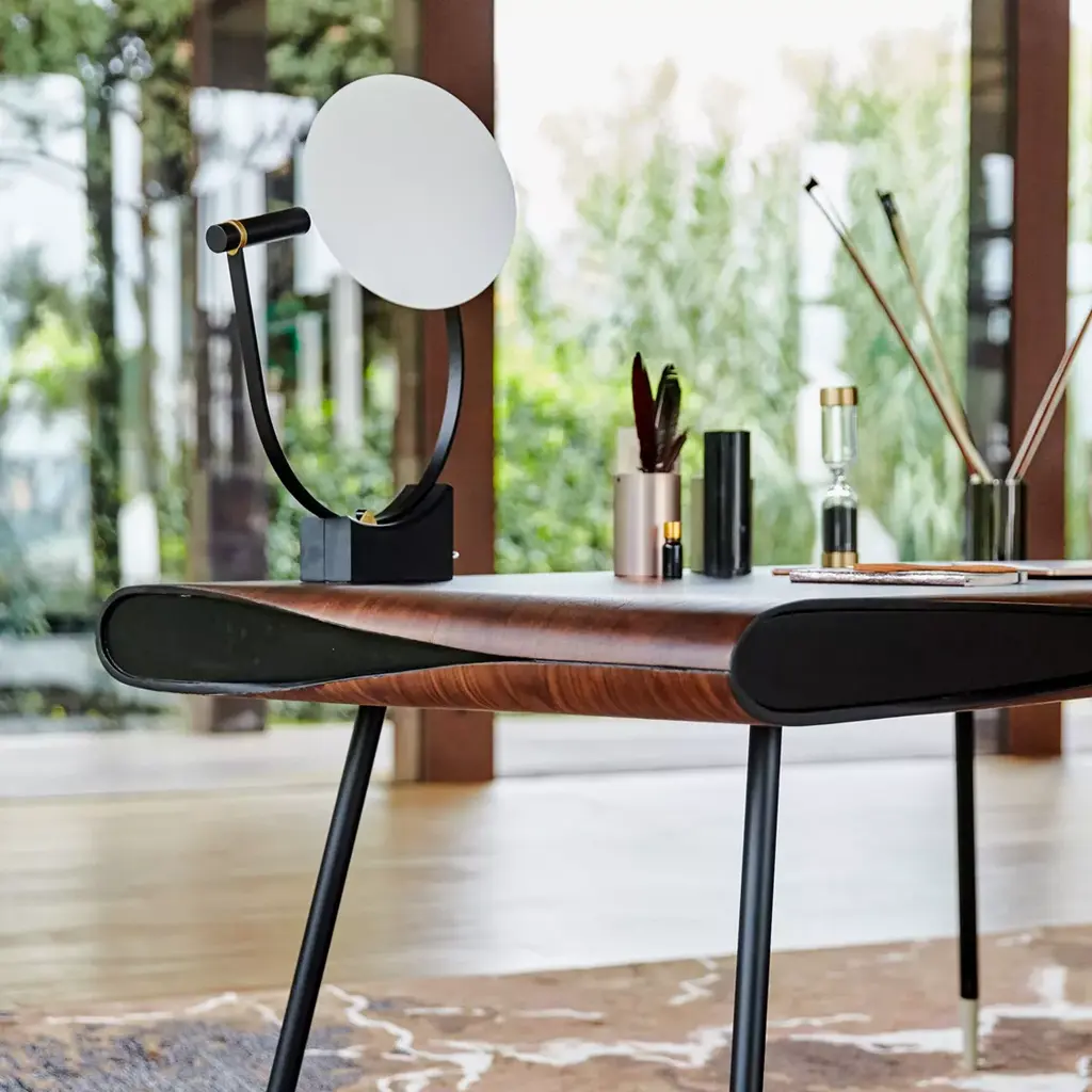 Like a sheet of wood folded and bent upon itself on all four sides, Calligraphie is a soft and organic origami-like structure gently resting on it's slender legs. Nestled in the black crevices of it's large nut-like shape are two pencil holders, one at the front and the other on the right.