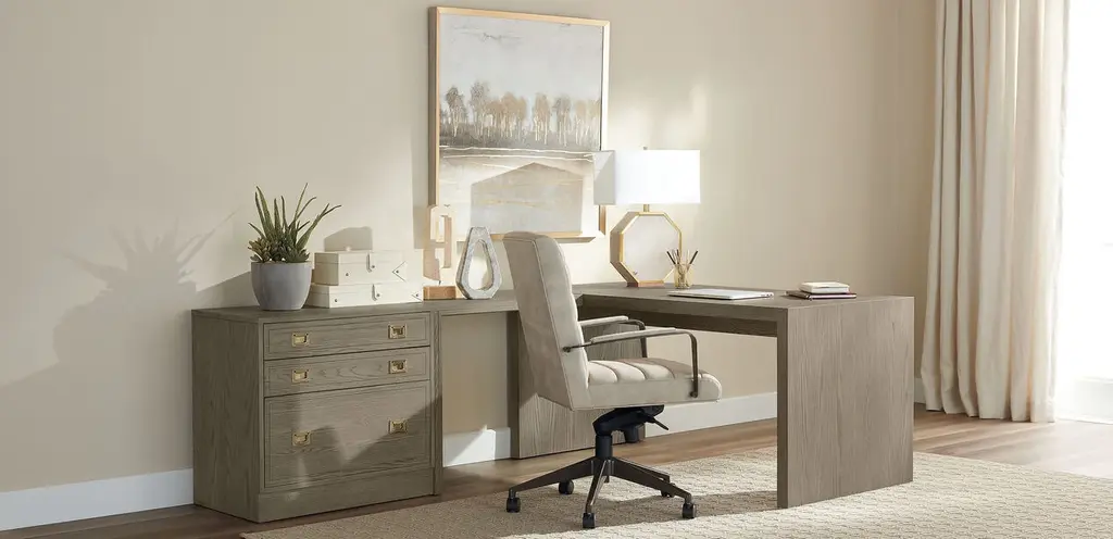 Welcome to an oasis of function and fashion that can squeeze into any nook. Our Callum office island brings plenty of file storage and a roomy Parsons-style desk together under the modern umbrella of reimagined British campaign style.