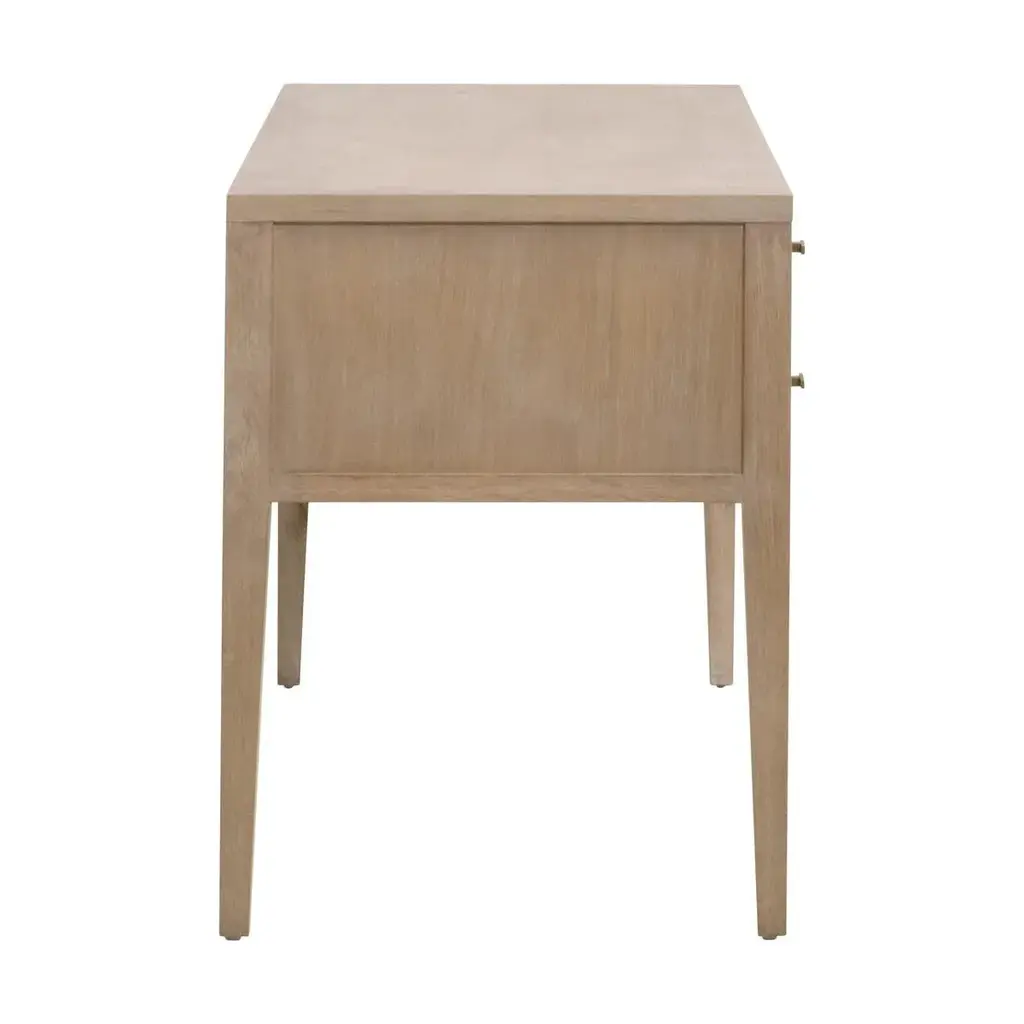 This is a bohemian-style writing desk with rustic charm. It features muted smoke gray tones and a natural appearance. Constructed with oak wood, the overall aesthetic of this desk is coastal and earthy. The drawers have a beautiful front-facing cane inlay, creating a very tropical and bohemian vibe. Conveniently, the desk contains plentiful storage space for pens, notepads, chargers and other small office supplies with its five storage drawers. The back of the desk is finished so it could be free-standing, if desired. This remarkable writing desk will be a grand addition to any home office, living room or bedroom. Base Dimensions: W:55" D:24" H:31.25" FEATURES & BENEFITS: Cane Front Inlay With Wood Border 5 Storage Drawers Dual Wooden Drawer Glides Finished Backside MORE DETAILS: Materials: Solid Oak Wood, Oak Veneer, Cane Hardware: Brushed Gold Drawer Interior Dimensions (Small): 16.5" x 9.75" x 3" Drawer Interior Dimensions (Large): 16.5" x 5.25" x 3" Drawer Interior Dimensions (Center): 23.5" x 16.5" x 3" Leg Thickness: 2" Tapered Leg Thickness: 1.25" Distance Between Large Side Drawers: 25" Distance from Bottom of Center Drawer to Floor: 25.5" Distance from Bottom of Side Drawers to Floor: 18.5"