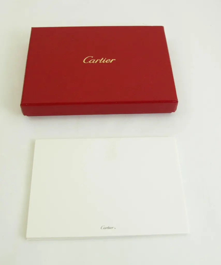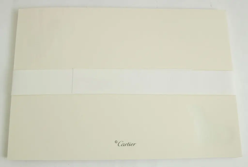 Cartier Paris Card and Envelope Set of 10 with the Iconic Tank Watch Jewelry Design. Authentic Luxury Cartier Stationery Card Letter and Envelope Tank Watch, limited edition Desk Accessory. Emboss printed cardstock construction, the enveloppe are also embossed Cartier. Card: 4 5/8" x 6 1/4". Envelope : 6 3/4"W x 4 7/5"H. Box: 5.5 x 7.25 x 1.25 in. Great like new condition in original box, circa late 20th century. Set consist of 10 cards/ 10 envelopes. About: the Tank Watch The Tank watch was created by Louis Cartier, who designed it after the tanks of WWI battlefields. Defined by flat vertical brancards and a sapphire cabochon, this symbol of understated elegance has since captivated the world's most astute minds. The Tank watch immediately resonated with the aesthetes of its generation from the moment of its creation in 1917. It became the watch of the artistic and cultural avant-gardes who appreciated both the purity of its line and its creativity, as well as its way of reinventing itself through new interpretations. Cartier was founded in Paris in 1847 by Louis-François Cartier, the legendary French jeweler, although it was his three grandsons, Jacques, Louis and Pierre, who were responsible for launching the brand name worldwide. Indeed, so successful were they that we can read across from the story of Cartier to the wider history of the twentieth century: a Panther clip brooch bought by Wallis Simpson in 1949; the now-infamous Ruby Suite presented to Elizabeth Taylor by her third husband, Mike Todd, in 1957. The Art of Cartier offers a comprehensive selection of the finest jewels that Cartier has repurchased over the years, in an attempt to assemble a representative collection of the Maison’s production and to show the evolution of its style during the first half of the twentieth century. The items on exhibit range from the great tiaras in the so-called “garland” style of the early twentieth century to Art Deco jewels and others inspired by exotic places (including the famous Tutti Frutti bracelet of diamonds, emeralds, rubies and sapphires all nestled in a frieze of foliage), gold jewelry of the 1930s and 1940s and one-off commissions for leading personalities of the century such as Coco Chanel, María Félix and Grace Kelly. This sumptuous catalog includes color photographs and introduces us to one of the world’s finest jewelry collections, allowing us to appreciate the creativity and mastery of Cartier’s designers and artist-jewelers over the course of more than 100 years.