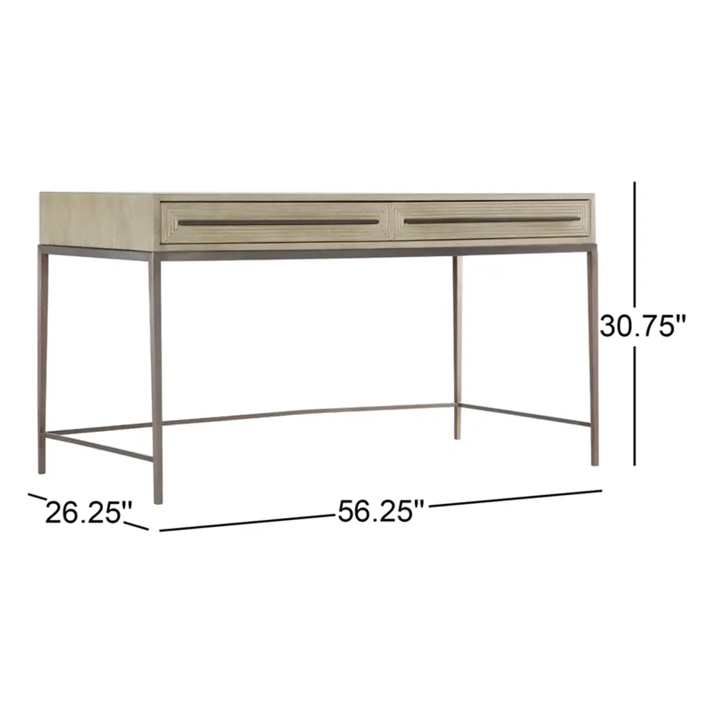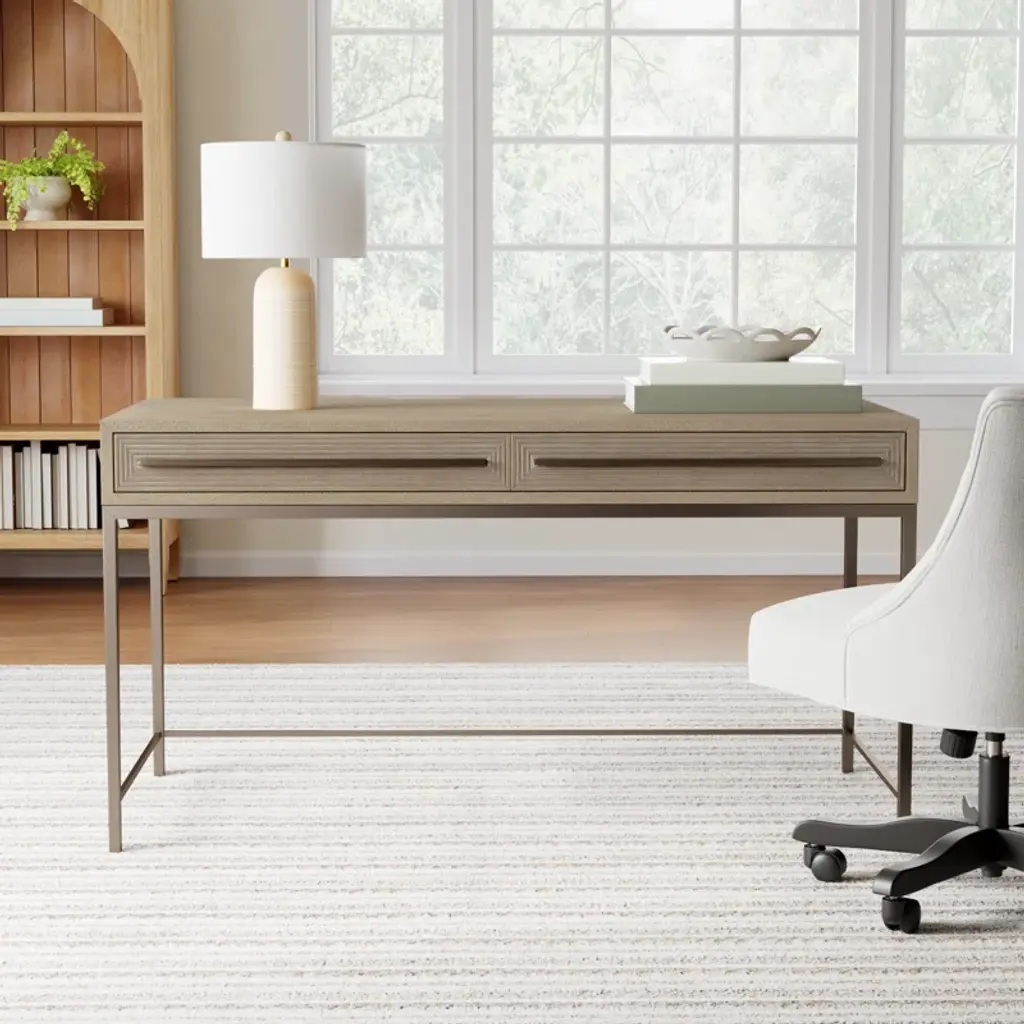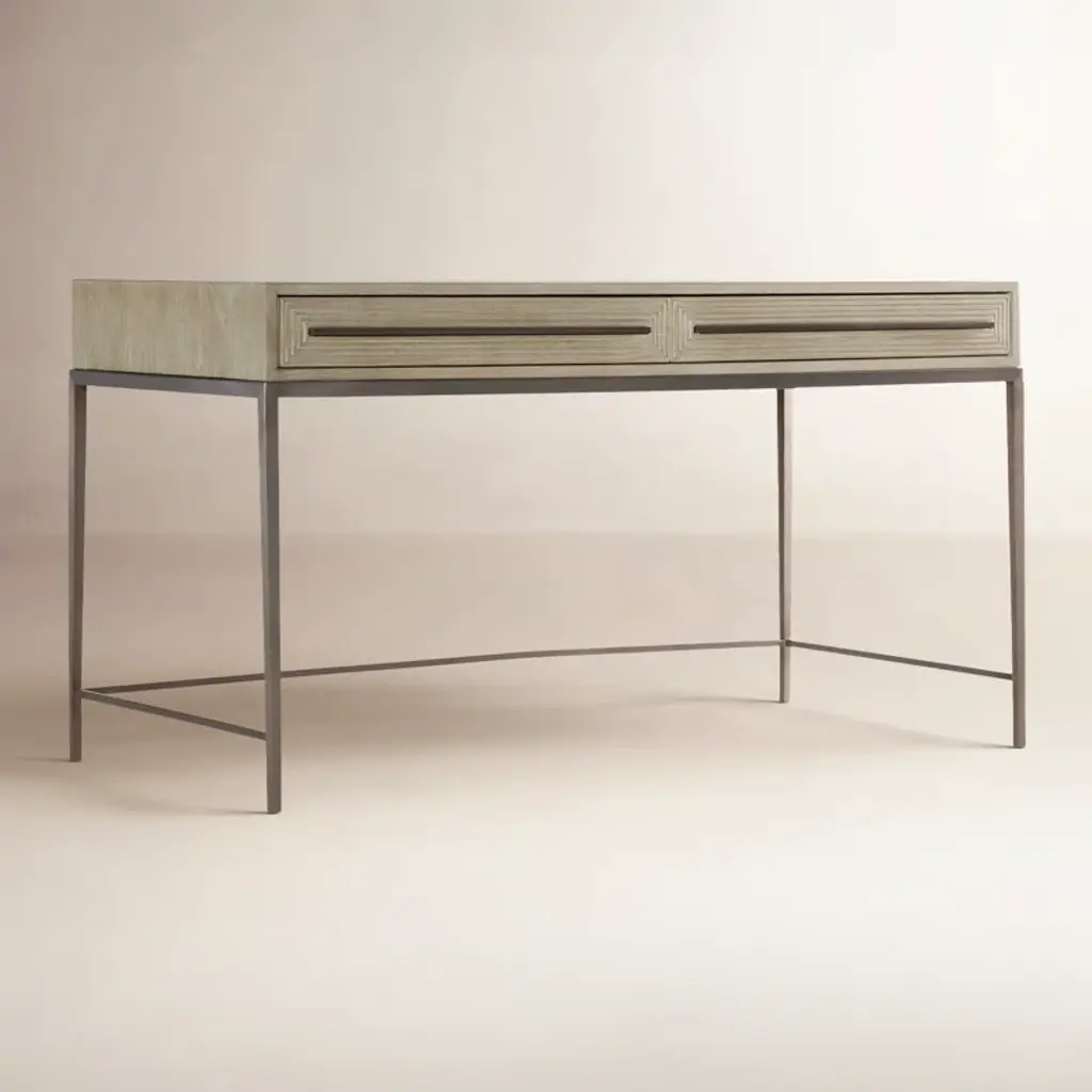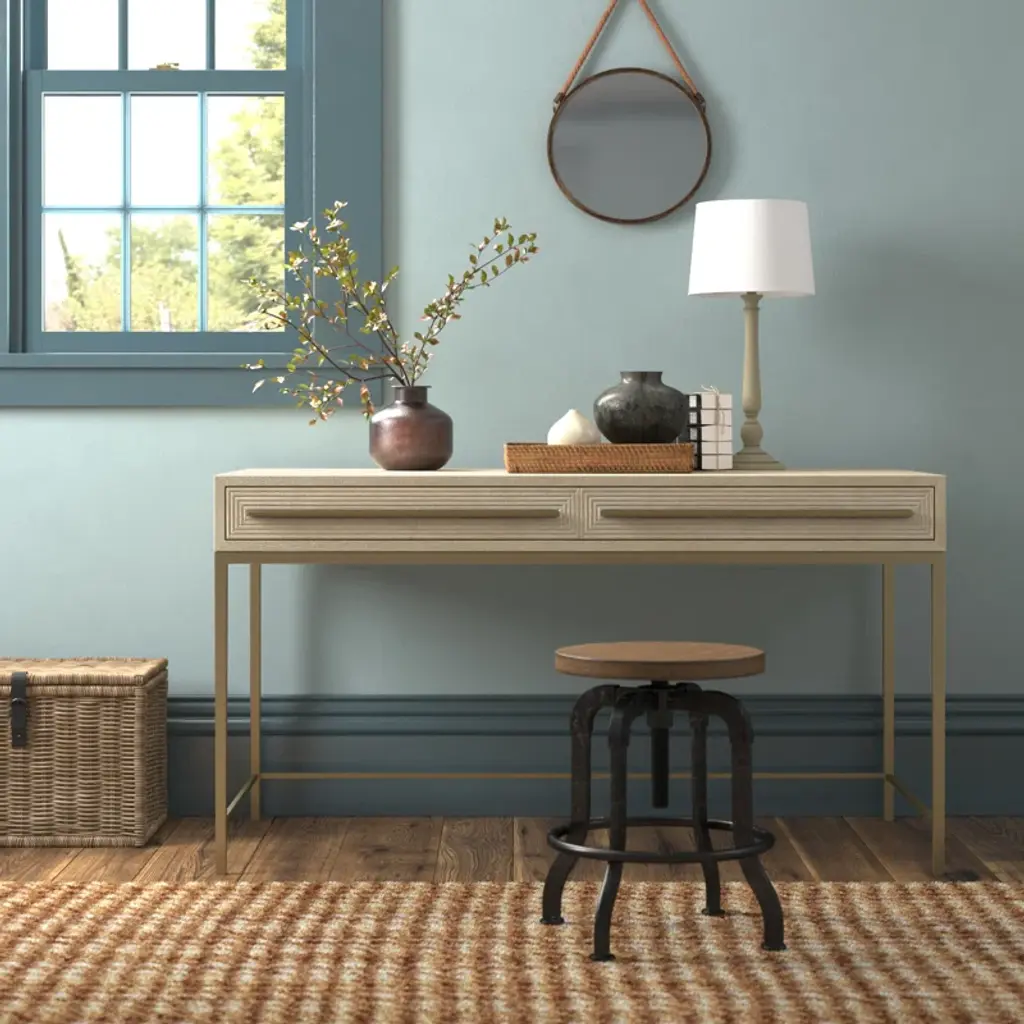 We love this distressed writing desk and how it brings handy storage to any home office or living room. It's built from kiln-dried solid oak wood with a light brown finish, and it rests on metal legs for added sturdiness. Its rectangular desktop area has plenty of space for a laptop or computer, as well as notebooks and other writing needs. We love how the 2 dovetailed soft-closing drawers, all on metal ball-bearing glides, give you a place to stash papers, writing utensils, and charging cables. And safety stops on the drawers prevent fingers from getting pinched. Best of all, no assembly is required.
