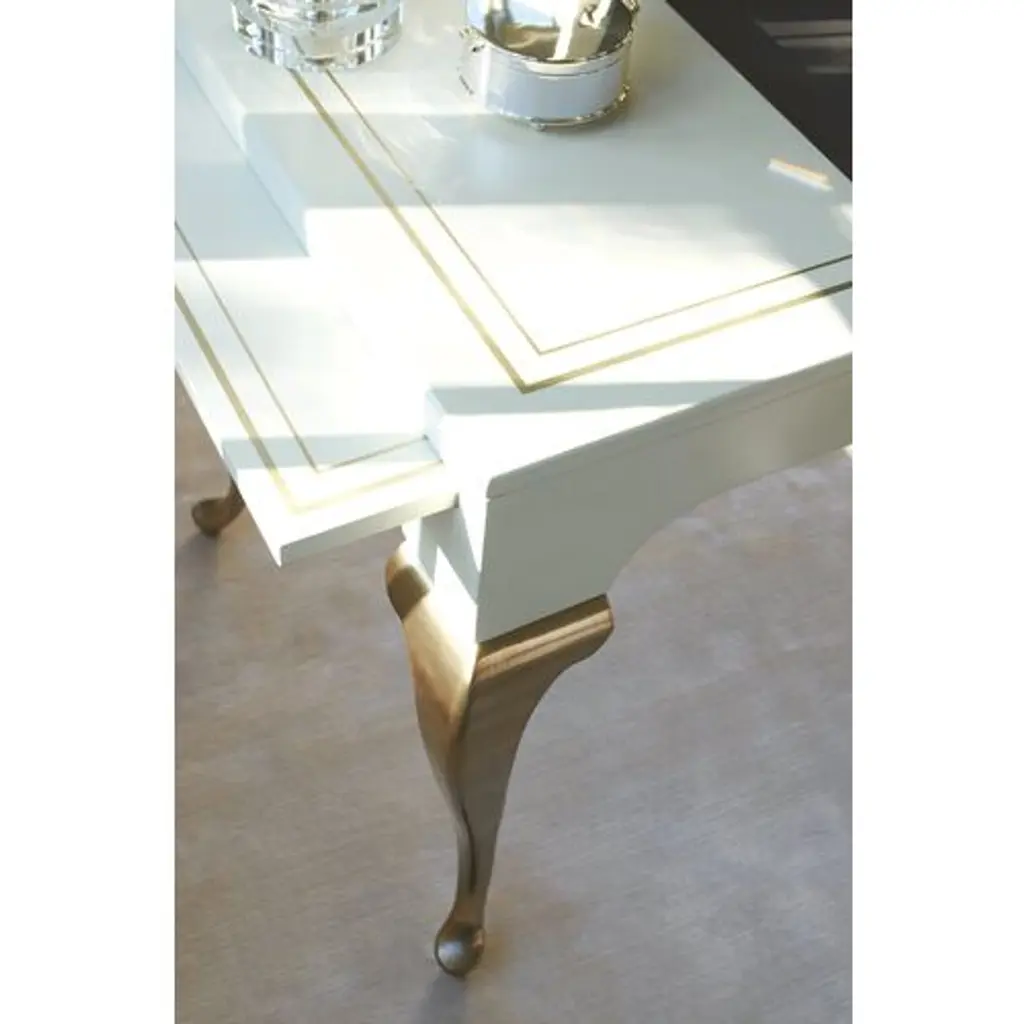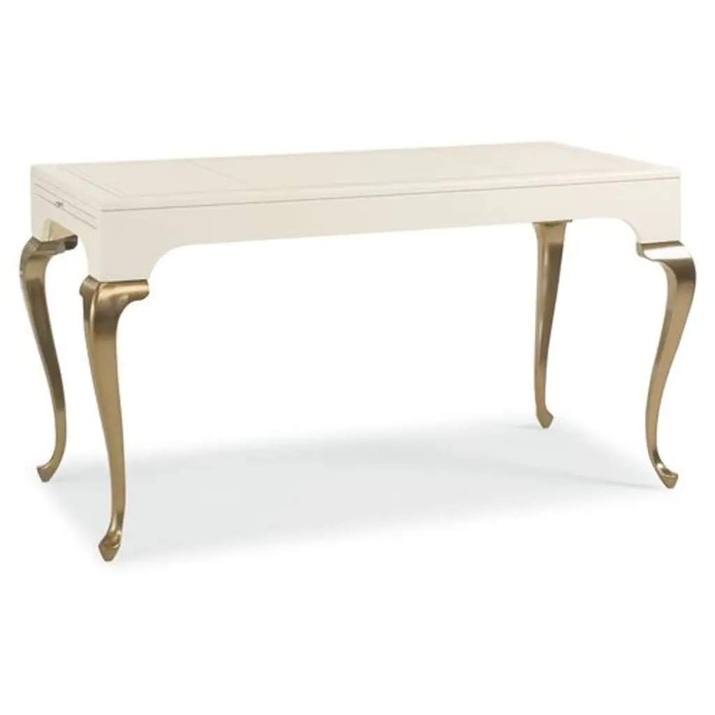 A fresh take on a classic French design, this modern rendition pairs cast aluminum cabriole legs and a compact hardwood surface finished in white lacquer. A stylish solution for a small-scale office, its top opens to reveal added storage, while pull-out shelves on each end allow for twice the surface space.