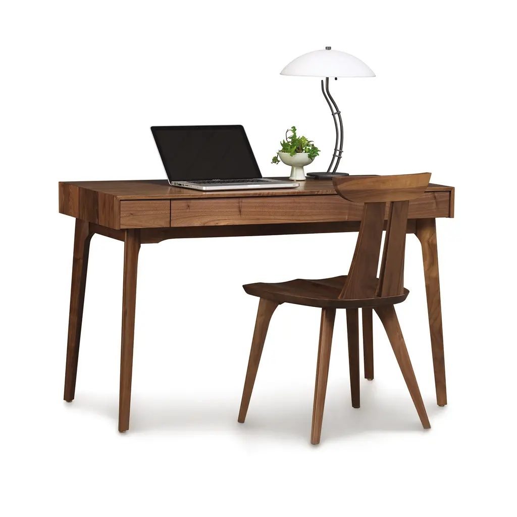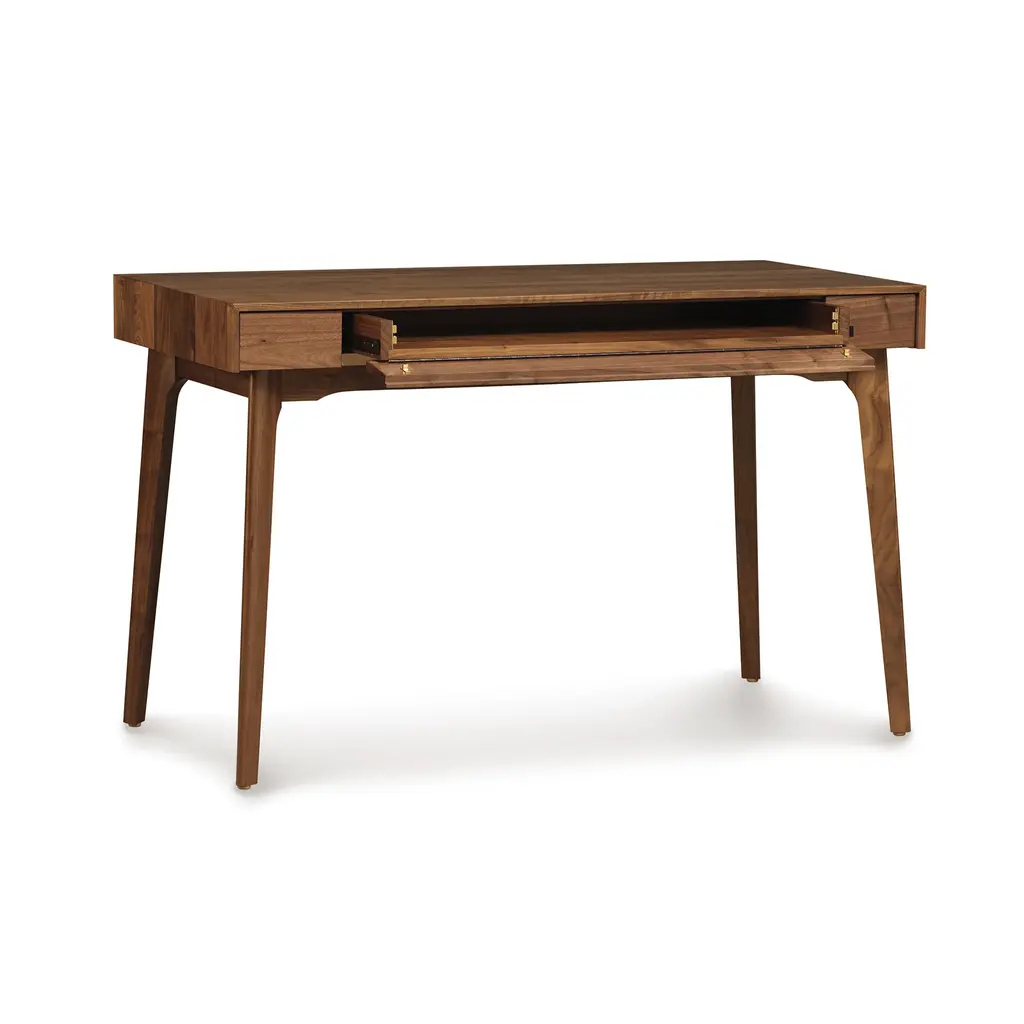 Our modern, contemporary Catalina Walnut Desk with pull-out keyboard tray is handmade in Vermont of solid natural walnut wood. Made to order, this small high-end desk provides a trim, functional workspace for your green home. It's the perfect compact home office solution with sturdy solid wood construction and built for a lifetime of use.Constructed of solid American black walnut wood. Our Catalina Office Furniture Collection is handmade in Vermont using sustainably harvested woods.Base price represents 48"W x 24"D desk in natural walnut Shown in 48"L x 24"D desk natural walnut Matching furniture available in our Catalina Furniture CollectionNatural variations in solid wood and hand applied finishes make each piece unique. Slight grain and finish irregularities tell you that the furniture has been crafted from solid wood and are considered hallmarks of quality.