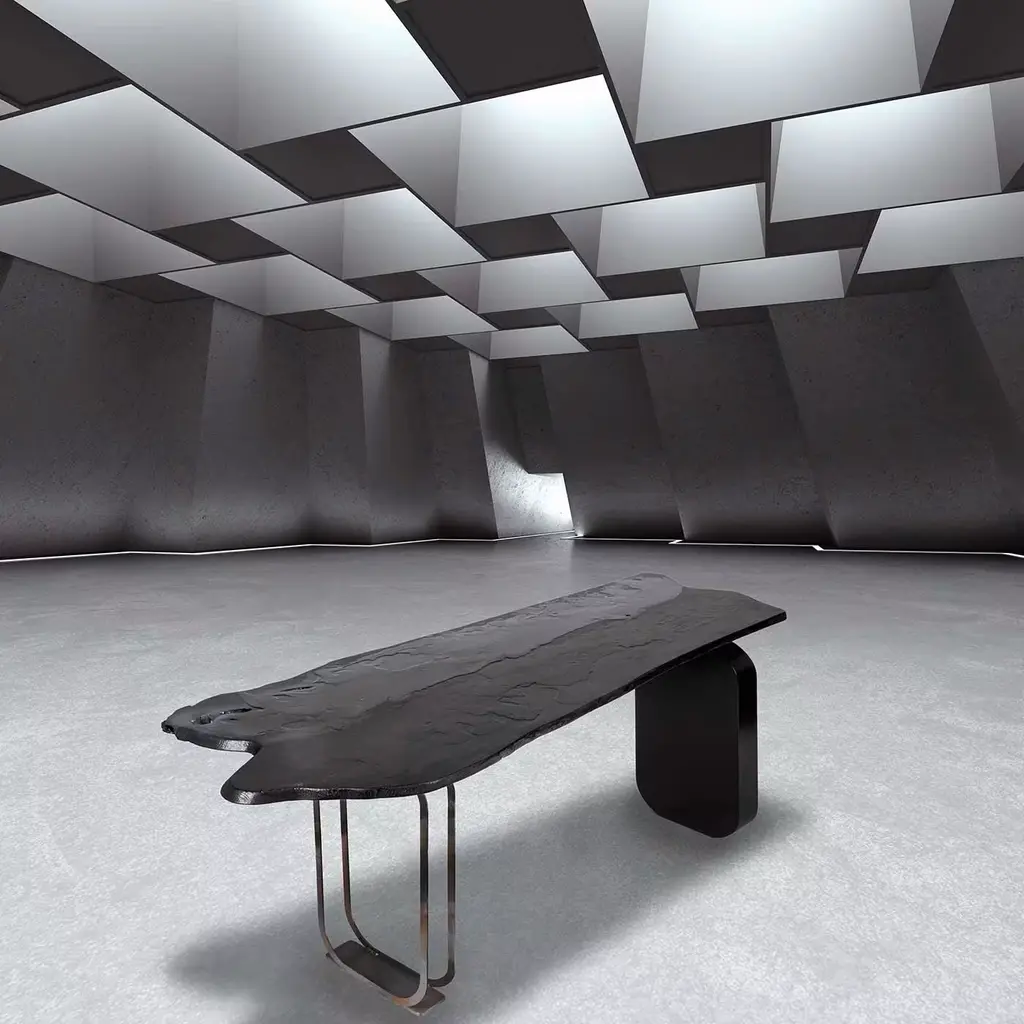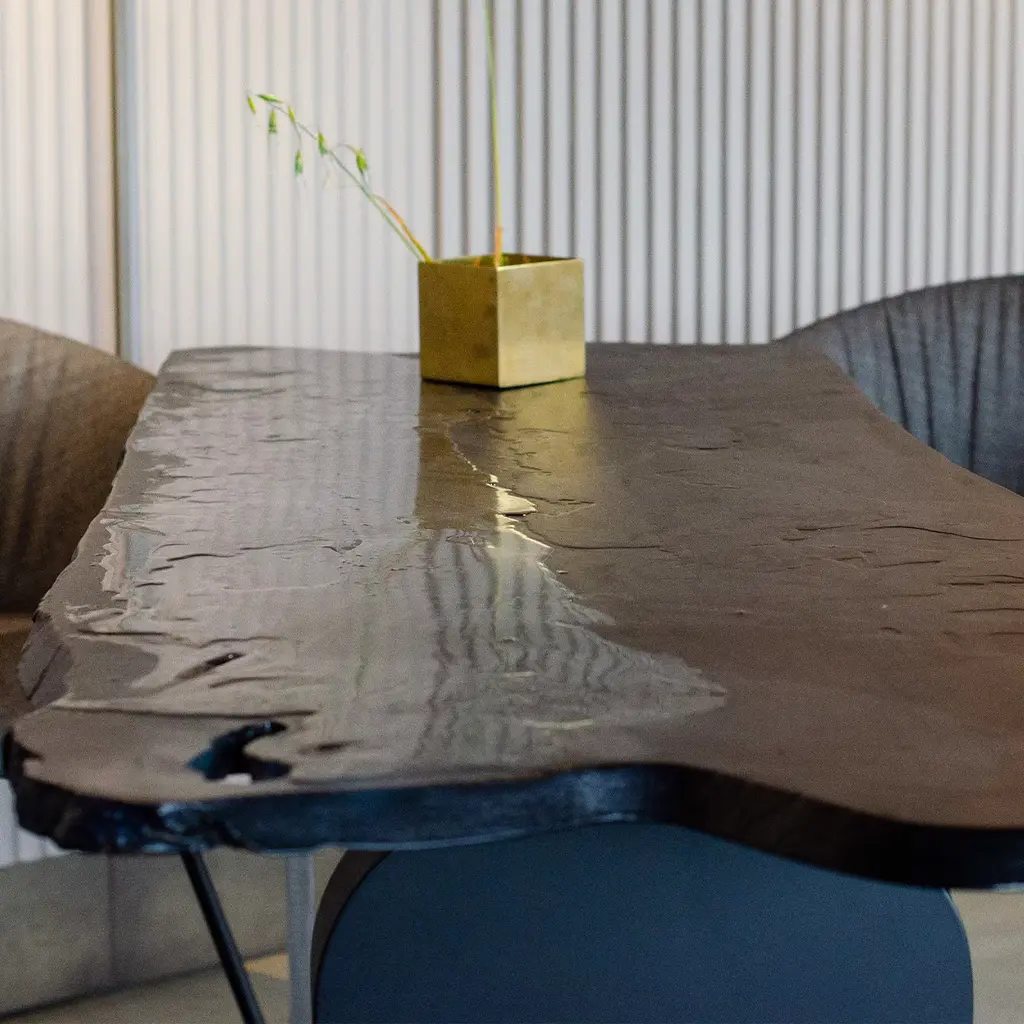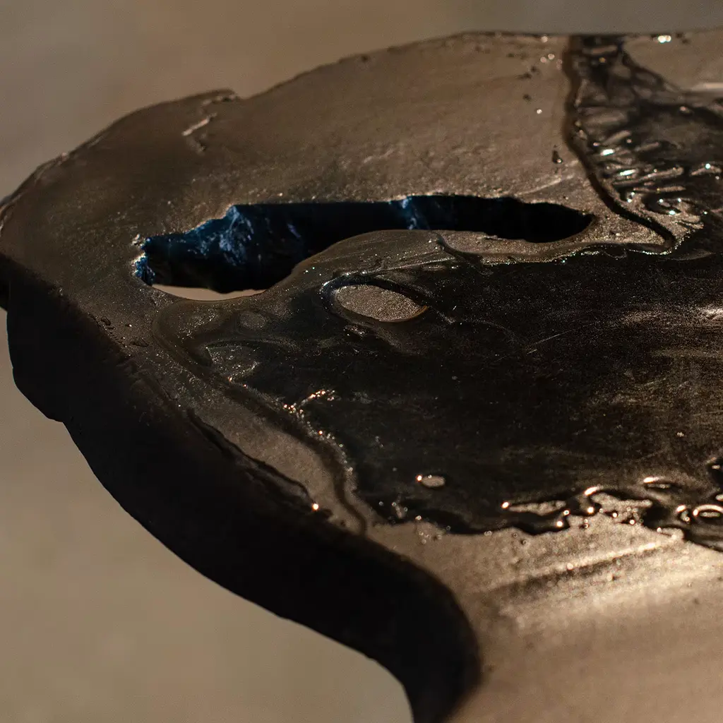 Giving a functional purpose and a contemporary style to a "primitive" material is at the heart of ROU Materiaal's philosophy. This unique desk has a top fashioned from a piece of a centenary ginkgo biloba, with two rectangular legs with rounded corners made of different materials: MDF tinted in black acrylic color and steel with a brushed finish. The raw wood is treated with epoxy resins using traditional restoration techniques and acrylic colors that result in a dual surface: one opaque and one glossy, merging without a precise borderline for a striking visual effect. The raw materials used in the manufacturing process differ every time, consequently, there may be natural variations that are not to be considered product flaws.