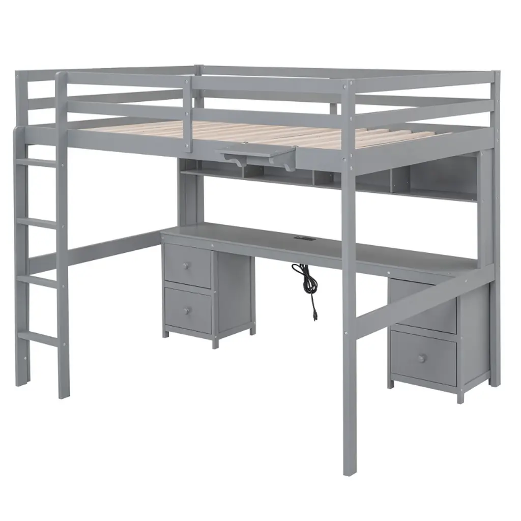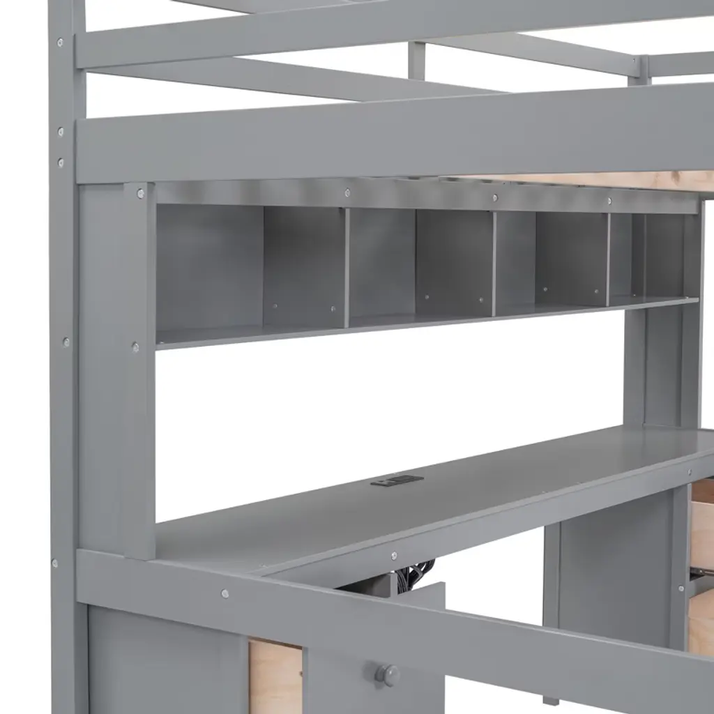 Cavinas Full Size Bunk Bed With Desk Wooded Bed Frame With Storage Shelves And Drawers For Bedroom, Gray