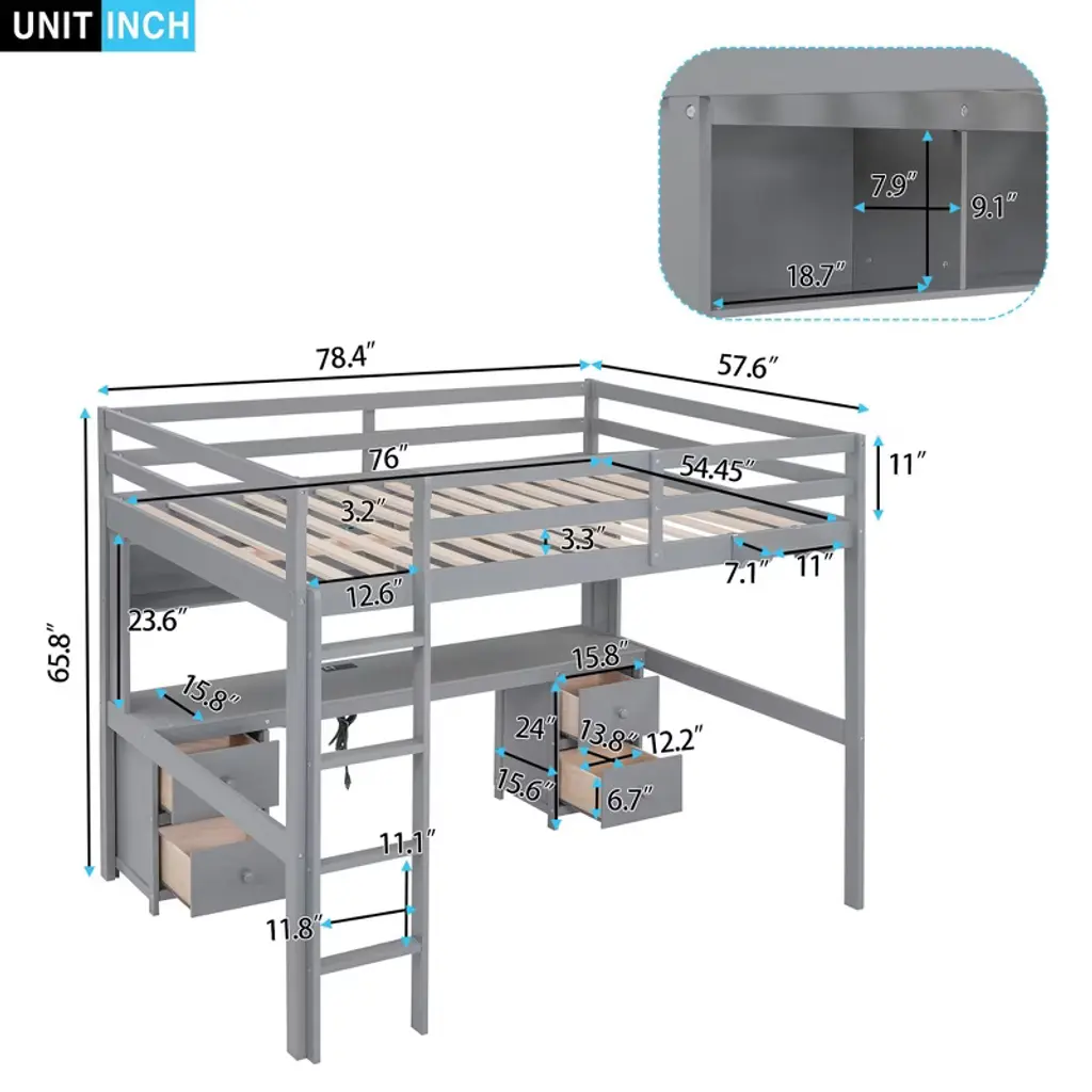 The bed frame is made of high-quality wood, which ensures the stability and load-bearing capacity of the overall structure. The upper level adopts a full-length guardrail design to provide additional safety for users. The lower level is an open space with a desk and storage space for users, which can be arranged according to personal needs.