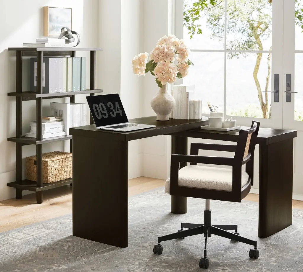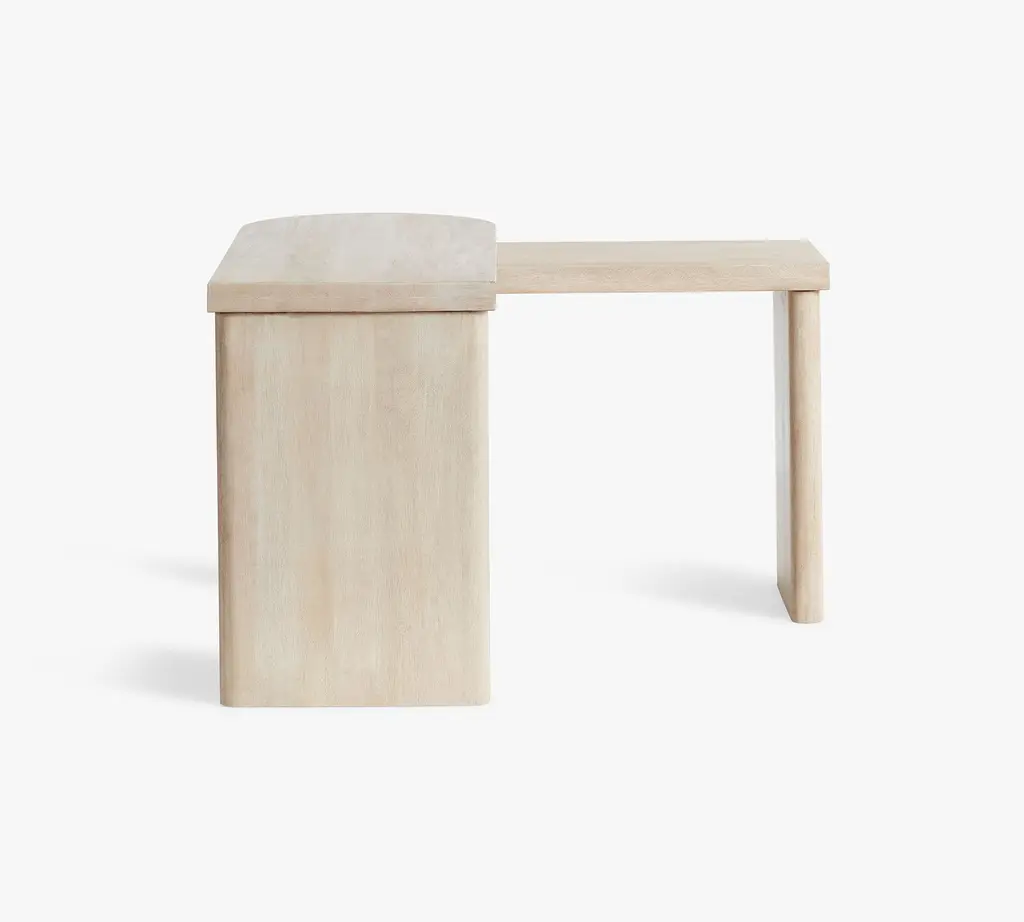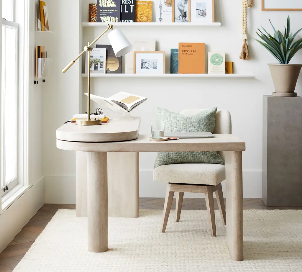 A salute to minimalist design, our Cayman Collection has a timeless look that's warm and welcoming. Crafted of solid wood, each piece has a dimensional finish that adds character. Our take on the L-shaped desk features a cylindrical column that allows you to fan out (or fold in) your workspace.