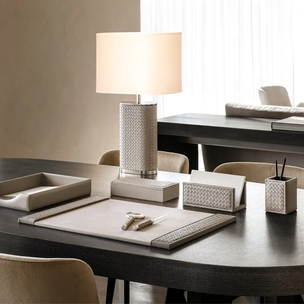 Celio is an elegant desk set which is reflects a perfect combination of design, quality material and superb workmanship.The desk set features a minimal formal line and the leather provides it with a sophisticated appearance and unique thanks to handwoven leather inserts.