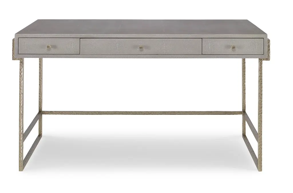 This piece is available only as shown, and will ship in 2-3 weeks. A classic desk from the Century Furniture Monarch Collection. Finished with champagne faux shagreen embossed leather on a champagne finish metal base. Champagne finish hardware on three soft-close drawers completes the look. Welcome to Monarch Fine Furniture for Century. This amazing collection of English reproductions features a variety of old world techniques including fine marquetry, églomisé, and gesso. These eclectic designs are the perfect accent to any room.
