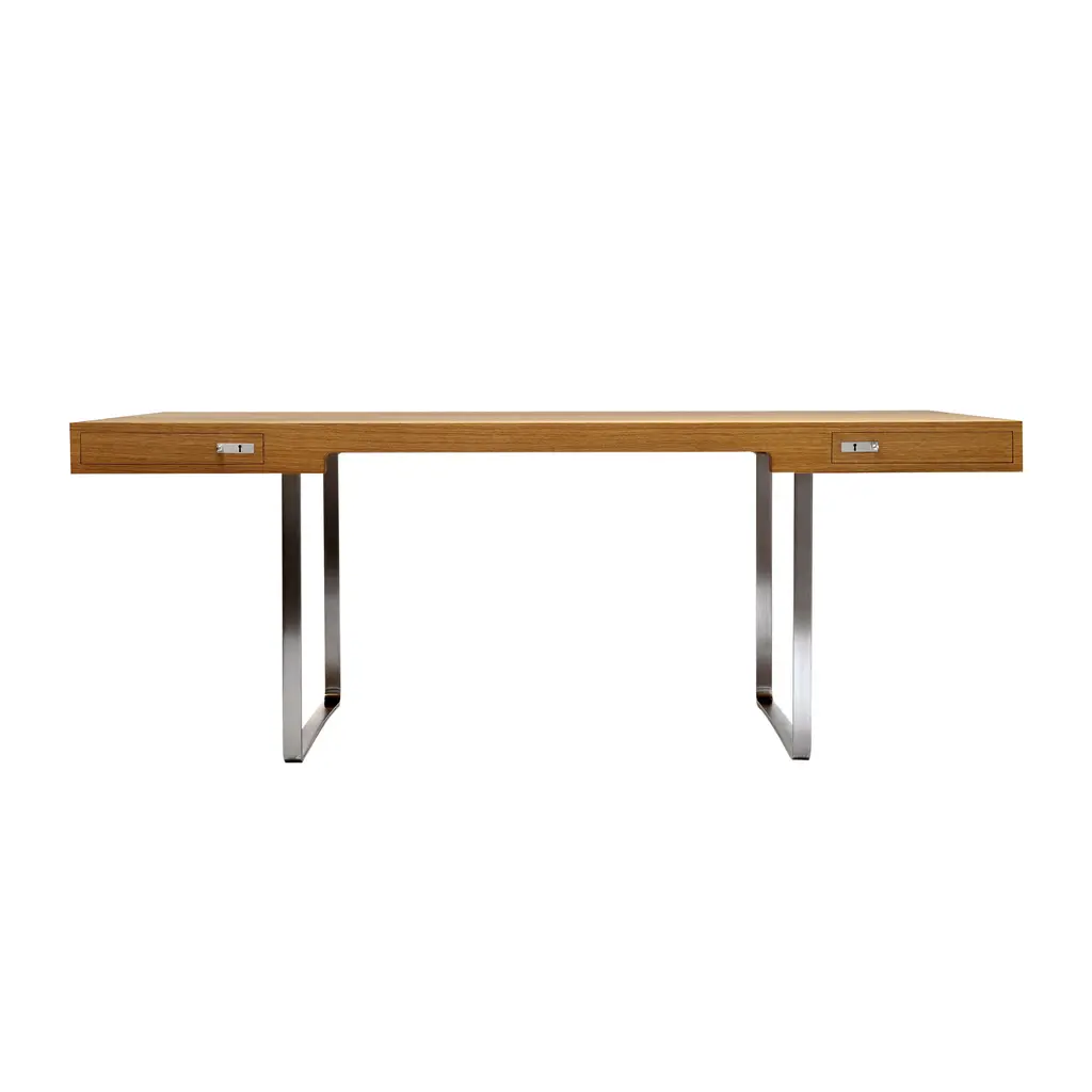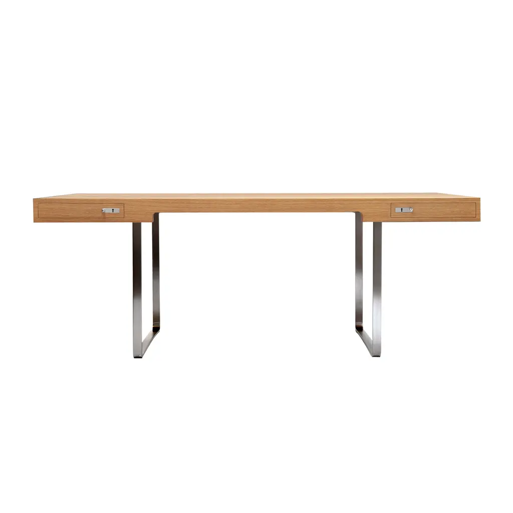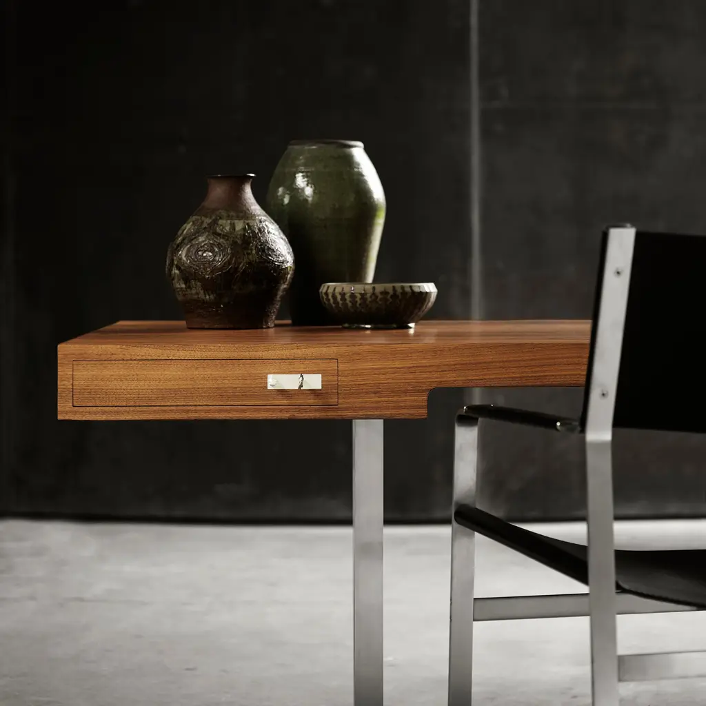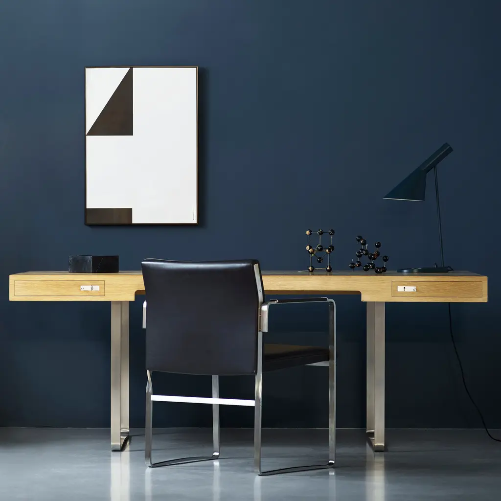 A distinctive steel-framed design, Hans J. Wegner’s CH110 desk stands out in many ways from his usual style of solid-wood furniture. Created in 1970 as part of a dedicated workaday concept, the expansive desk fashioned in oak or walnut provides room to spread out for big projects, with streamlined proportions that rest lightly on gleaming stainless-steel legs. Two symmetrical drawers feature handmade mortise and tenon joints and minimalist handles with key-lock closures.